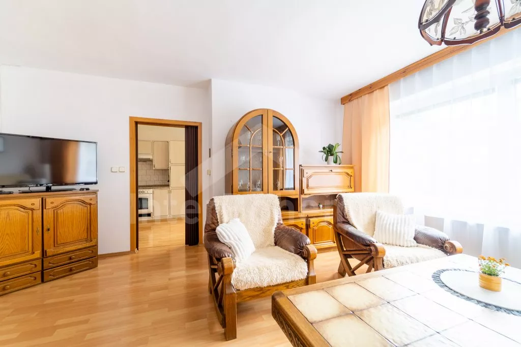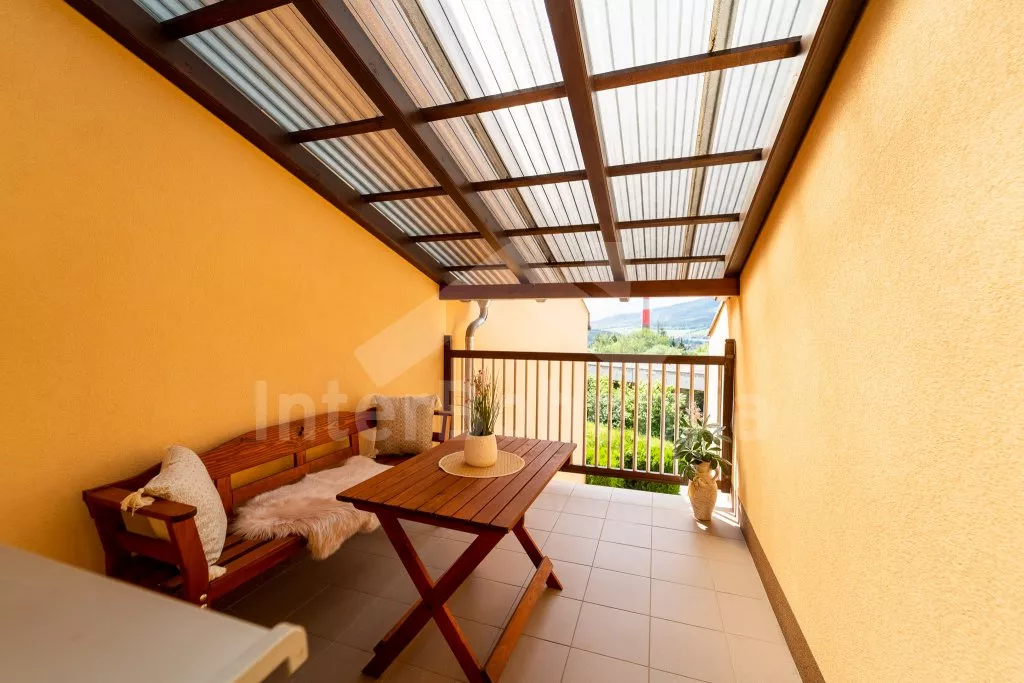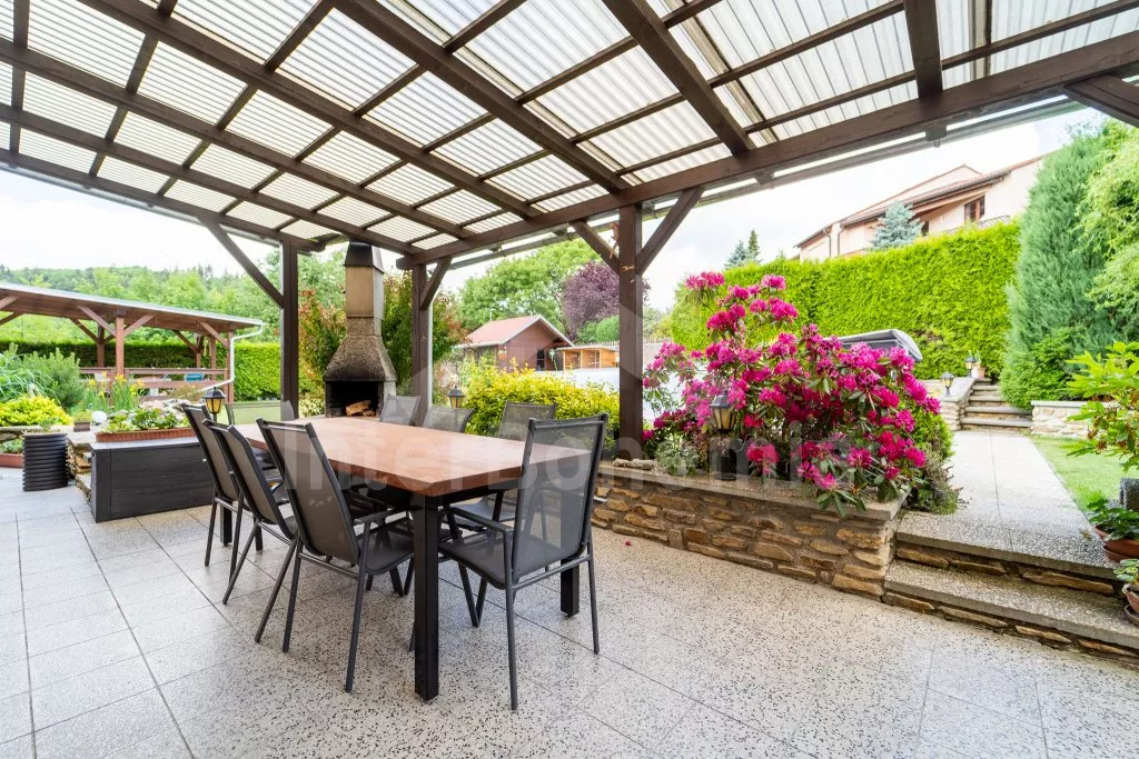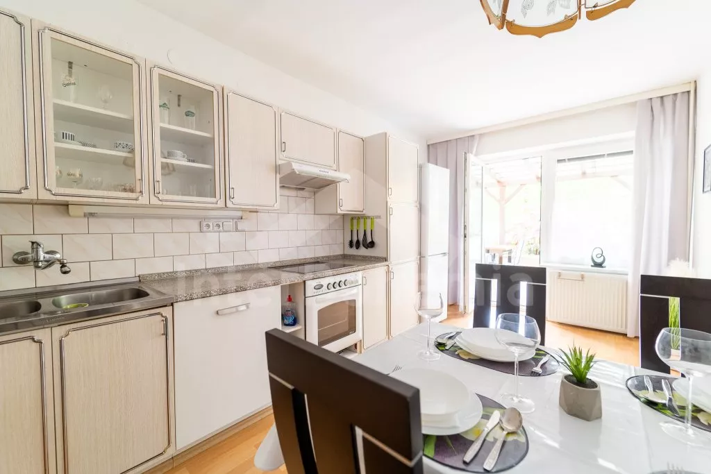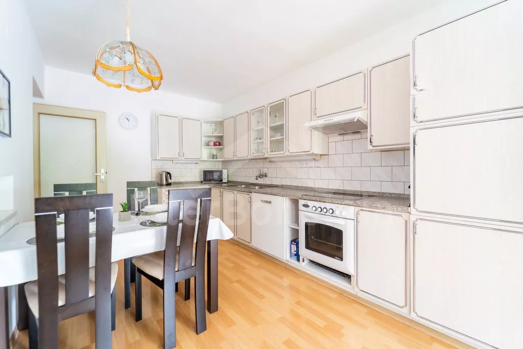 Řadový dům se zahradou, po celkové rekonstrukci v roce 2020. Vstup, chodba, kuchyně s plynovým sporákem, elektrickou troubou, mikrovlnnou troubou, rychlovarnou konvicí, lednicí, mrazákem, nádobím a myčkou na nádobí. Jídelní stůl pro 4 osoby a vstup na terasu. Obývací pokoj se sedací soupravou, LCD televizí a druhým jídelním stolem pro 4 osoby. Ložnice se dvěma jednolůžky a dětskou postýlkou. Koupelna se sprchovým koutem a umyvadlem. Samostatné WC. V podkroví 3 ložnice – první s dvoulůžkem a balkonem, druhá se dvěma jednolůžky a třetí s dvoulůžkem a balkonem. Možnost přidání jedné matrace pro zvýšení kapacity objektu. Druhá koupelna se sprchovým koutem a umyvadlem. Druhé samostatné WC. Vytápění objektu centrální plynové. Hosté mají k dispozici vlastní terasu s venkovním posezením, kamenným krbem a společnou zahradu s velkým, zastřešeným bazénem s nočním osvětlením (7 x 3,3 m, poplatek 1 000,- Kč/týden v případě využití). Parkování 30 m od objektu pro několik vozidel.