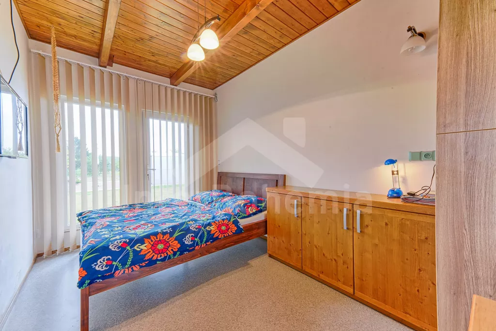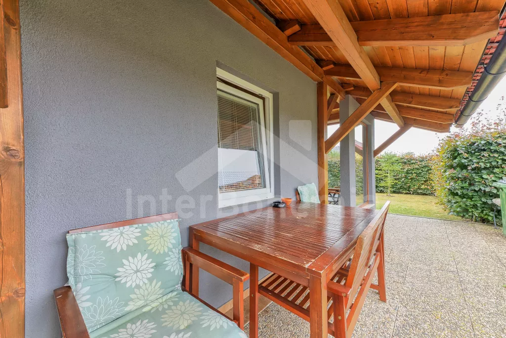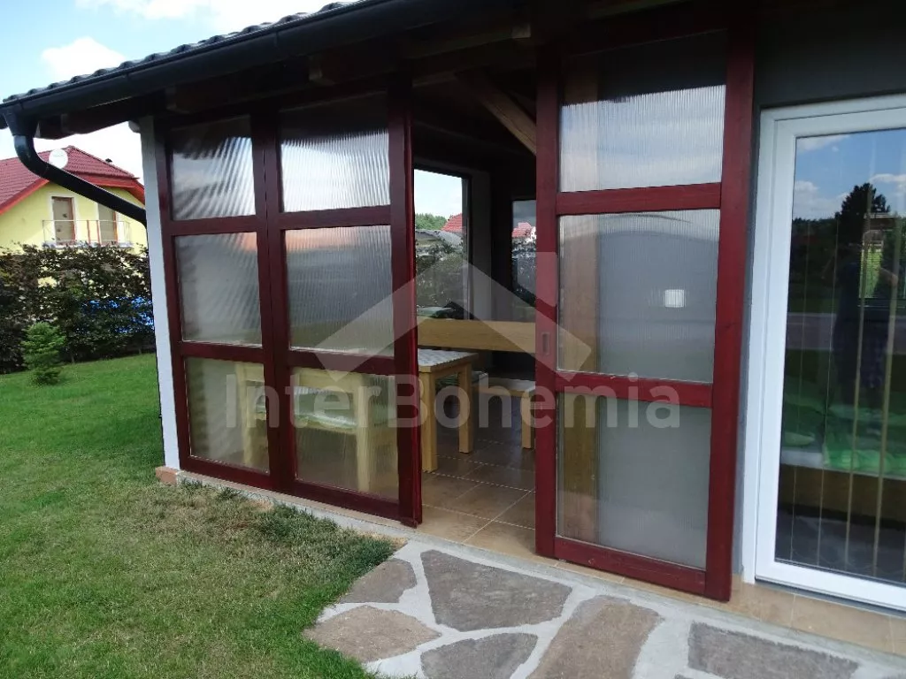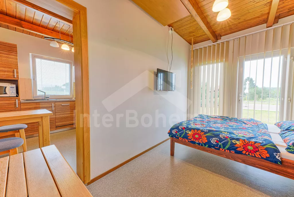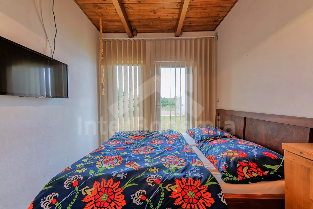 Malý rodinný bungalov, 48 m2, novostavba z roku 2014, kompletně, moderně a luxusně zařízený. Vstup přímo do obývací kuchyně s jídelním stolem pro dva, lednicí, varnou deskou, malou troubou, myčkou nádobí, kávovarem a mikrovlnnou troubou. Ložnice s manželskou postelí a TV se satelitním příjmem a DVD. Koupelna se sprchovým koutem a WC. Elektrické topení. Terasa s posezením (stůl s lavičkami), zahradním krbem a přístupem do oplocené zahrady se zahradním nábytkem se slunečníkem. Soukromý bazén s osvětlením a zastřešením. Soukromé parkoviště. Po domluvě s majitelem lze také pronajmout garáž.