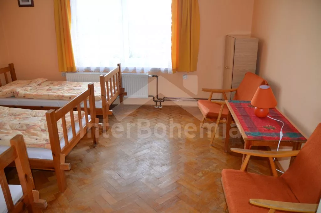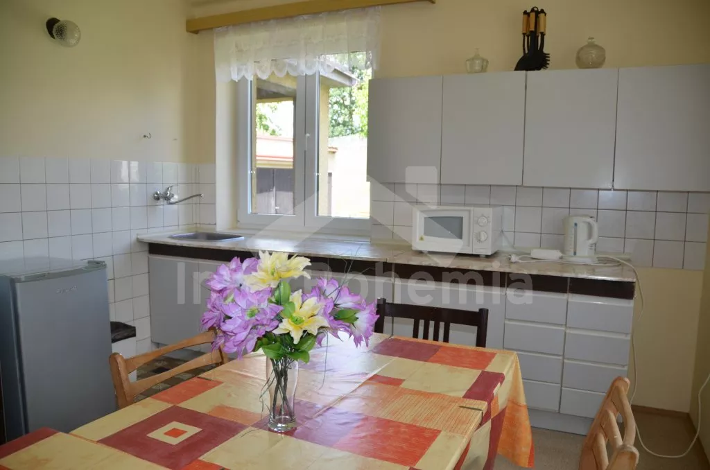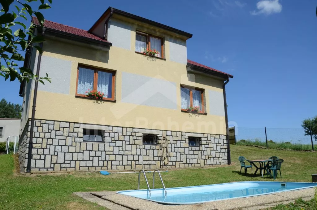 Volně stojící rodinný domek k samostatnému obývání. Vchod, chodba, obývací pokoj se sedací soupravou, televize a rádio. Prostorná kuchyně s jídelním stolem, lednice, elektrický sporák, varná konvice a mikrovlnná trouba. Ložnice s dvojlůžkem. Koupelna s vanou, WC zvlášť. Nahoře jsou dvě ložnice, jedna se dvěma lůžky a jedna se třemi lůžky. Kolem domku je oplocená zahrada, zahradní nábytek se slunečníkem, ohniště a bazén 5,5 x 3 m s filtrační jednotkou. Vlastní parkoviště. Ústřední topení na tuhá paliva.