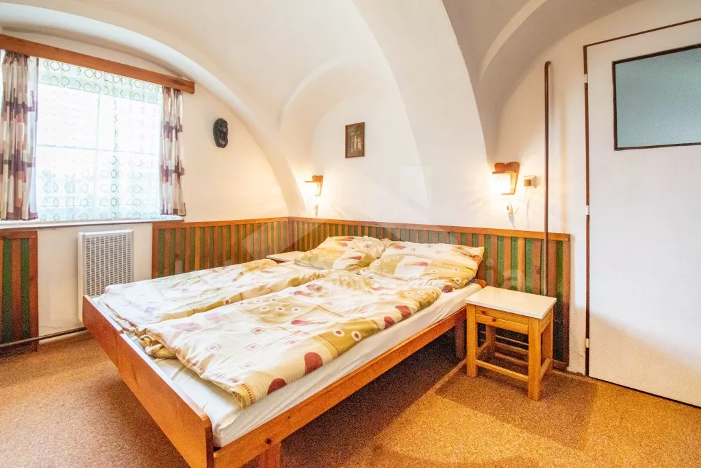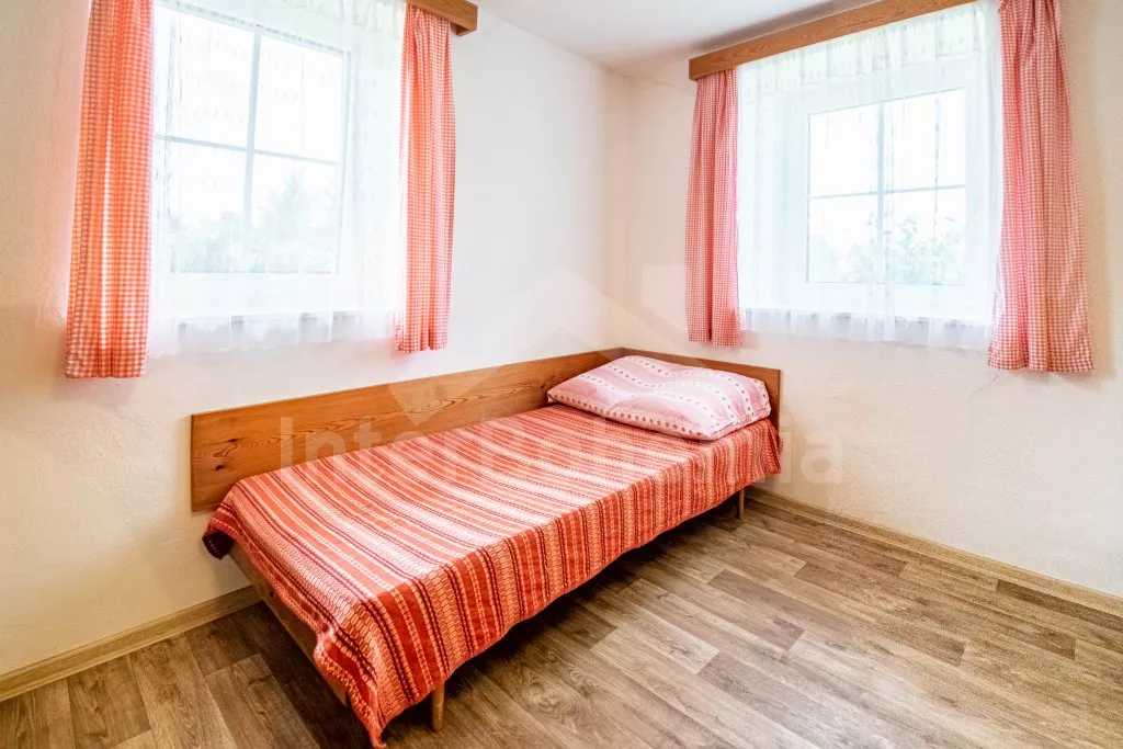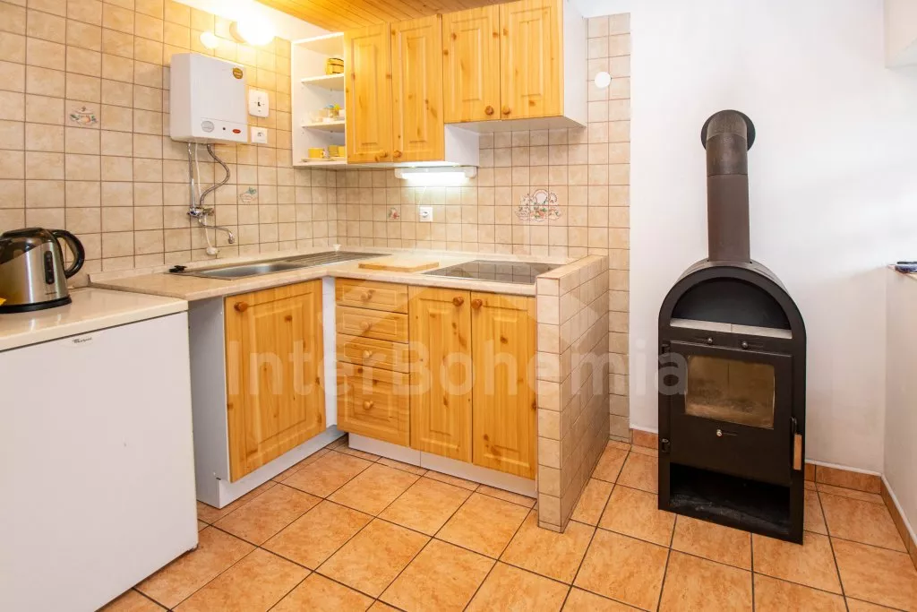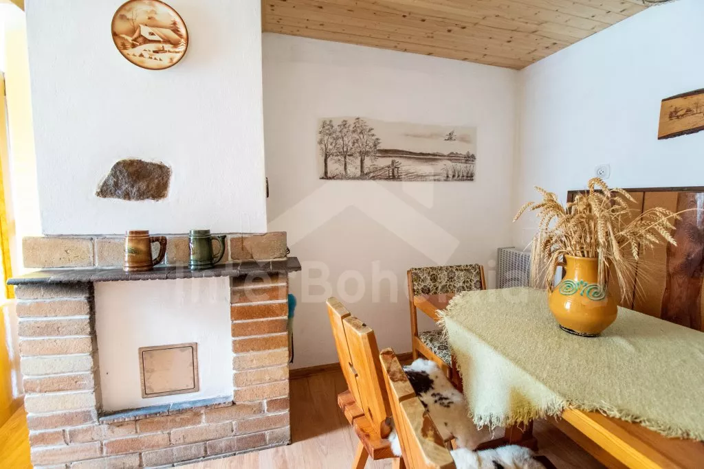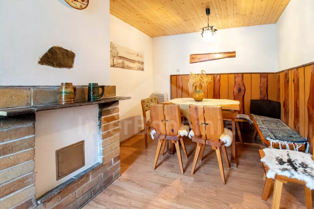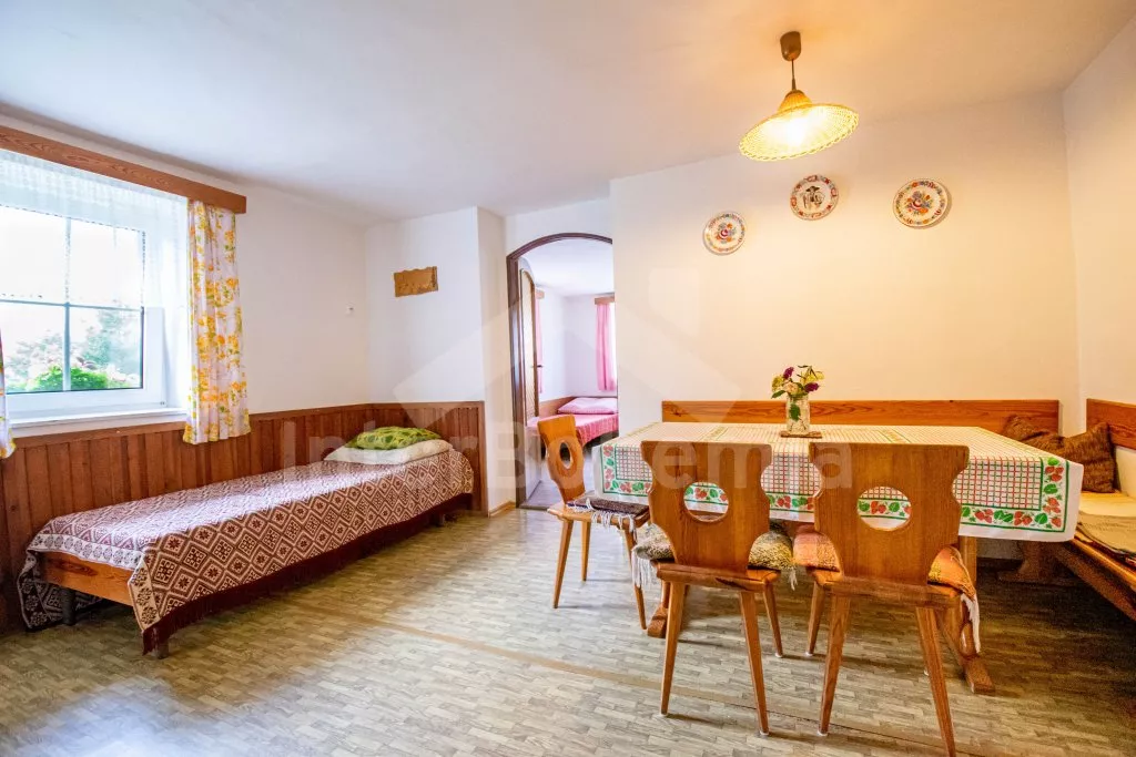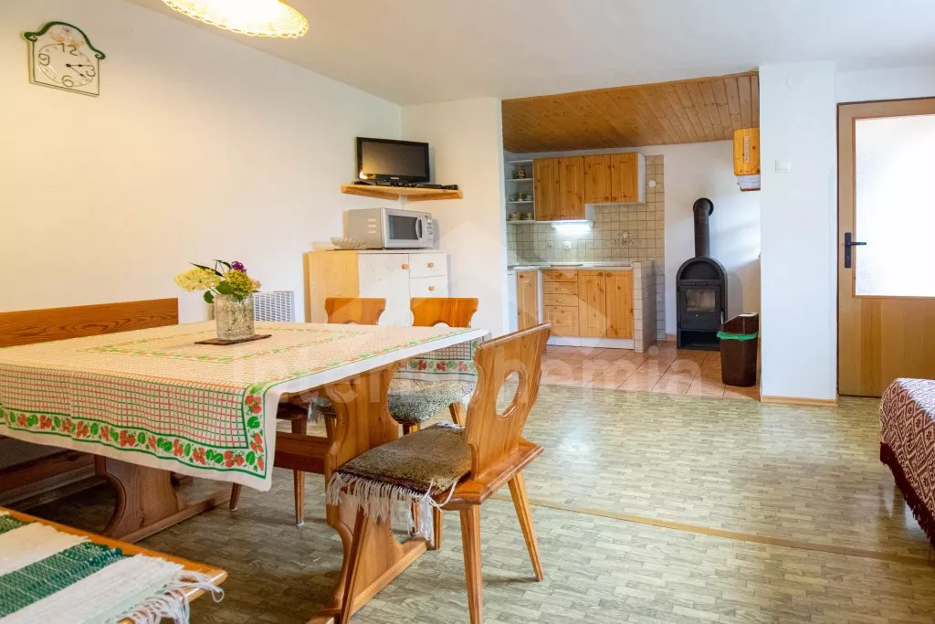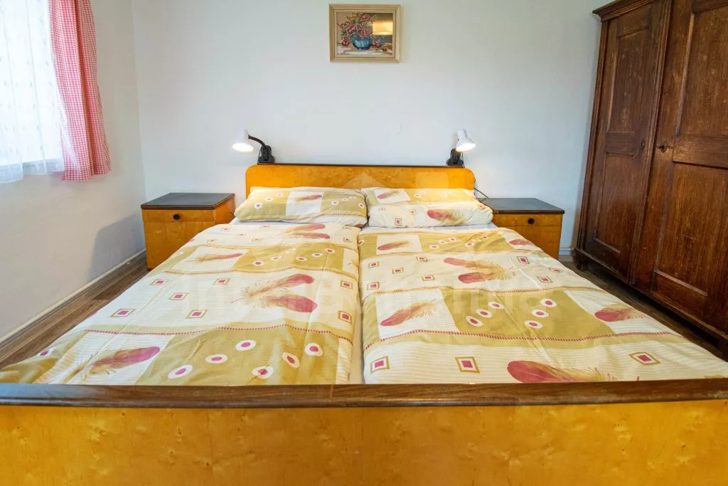 Volně stojící dům, bývalý statek. Všechny místnosti v jedné úrovni. Vchod, velká obytná kuchyně s jídelním koutem, pohovkou a jednoduchým kuchyňským koutem (čtyři elektrické varné plotýnky, lednička, varná konvice a kávovar). Obývací pokoj s lavicí, stolem, židlemi a křeslem u otevřeného krbu. Dvě ložnice – každá s jedním dvojlůžkem a jedním samostatným lůžkem. Koupelna se sprchou a toaletou (koupelna je přístupná přes jednu z ložnic). Plynové topení s termostatem. Malá zahrádka s dřevěným zahradním nábytkem a ohništěm. Garáž a vlastní parkoviště.