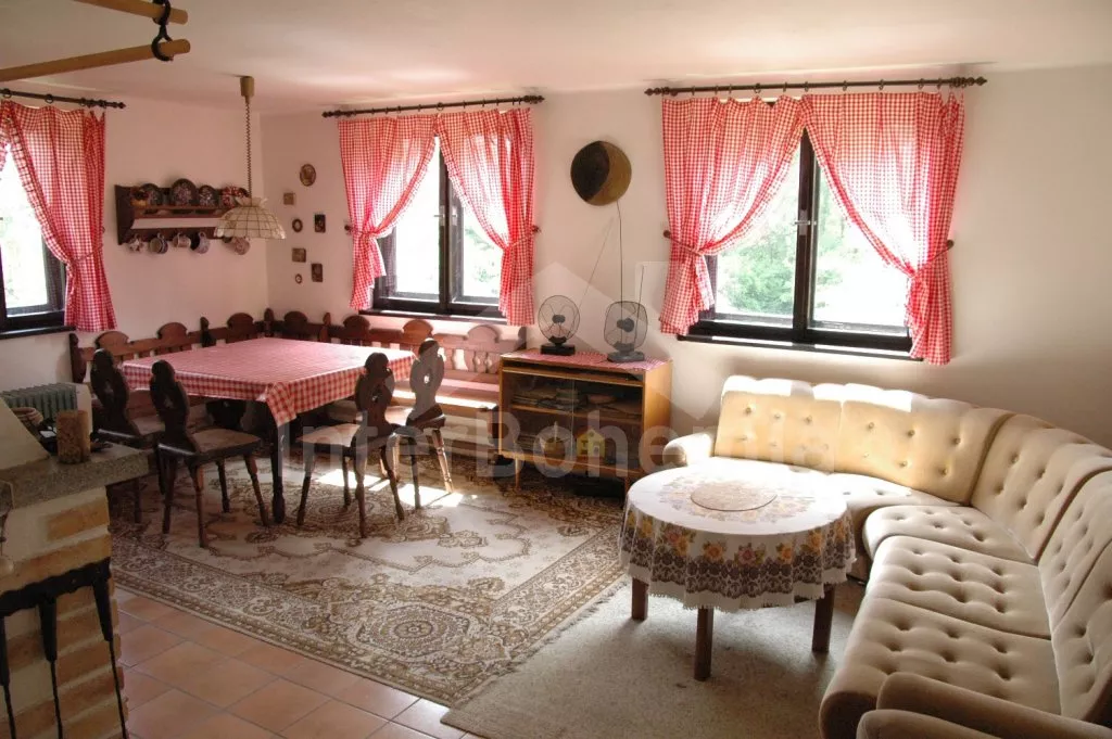 Freistehendes ehemaliges Landgut, das aus Wirtschaftsgebäude und später gebautem Haus besteht, das vermietet wird. Einrichtung ist zweckvoll aber einfach. Eingang, Flur, Wohnzimmer mit Sitzgarnitur, Esstisch, TV und Kamin. Offene Küche mit Gasherd mit Elektrobackröhre, Kühlschrank, Kaffeemaschine und Schnellkochkanne. Schlafzimmer mit einem Doppelbett. Kleines Badezimmer mit Dusche und Toilette. In Oberstock befinden sich weitere zwei Schlafzimmer – ein mit einem Doppelbett, einem Einzelbett und einem Extrabett und ein mit einem Etagenbett und einem Einzelbett. Zweite Toilette. Heizung durch Kamin. Garten ist nicht umzäunt, zur Verfügung Gartenmöbel mit Sonnenschirm, übertragbarer Grill und Feuerstelle. Zur Verfügung runder aufblasbarer Eigener Parkplatz.