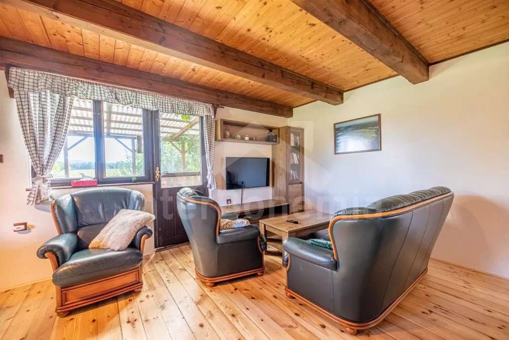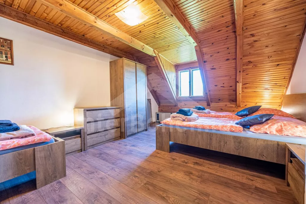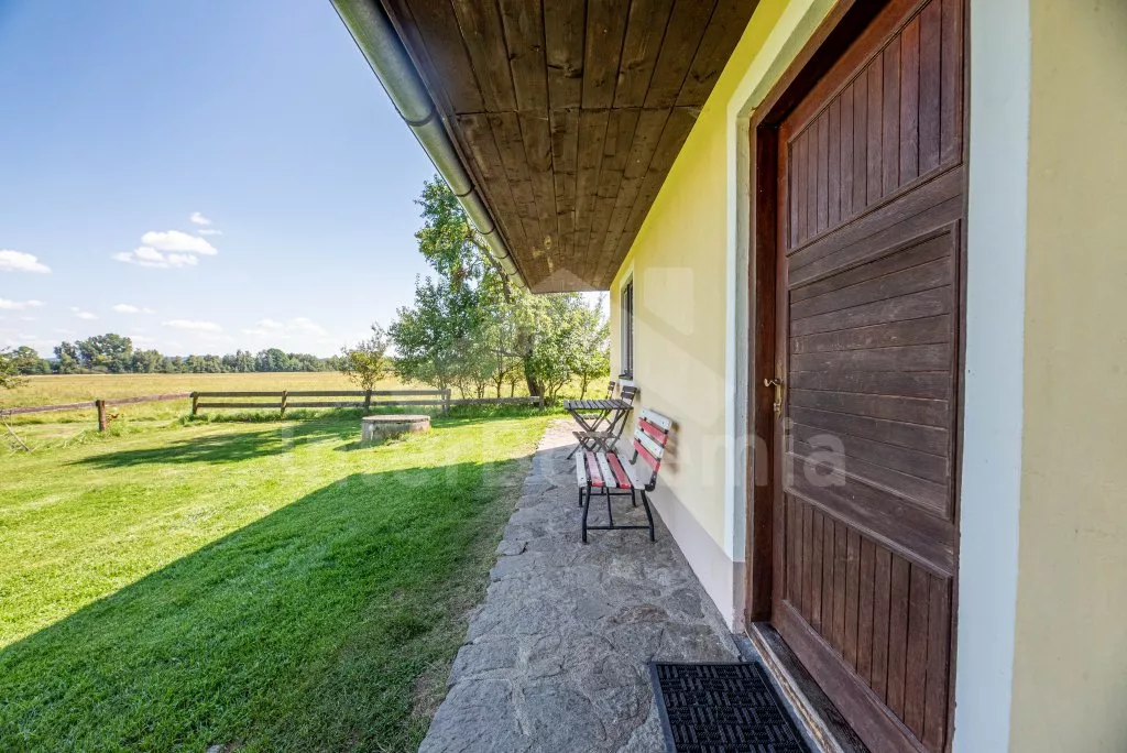 Freistehendes Ferienhaus. Eingang, Flur, Wohnzimmer mit TV, Sitzgarnitur, Esstisch und Kachelofen. Offene Küche mit Kochfeld, Kühlschrank und Schnellkochkanne. Badezimmer mit Dusche und Toilette. Im Oberstock befinden sich zwei Schlafzimmer - eines mit einem Doppelbett und zwei Einzelbetten und zweites mit vier Einzelbetten. Heizung mit Kachelofen (Holz). Garten ist nicht umzäunt, zur Verfügung steht Terrasse, Gartenmöbel, Gartengrill und Feuerstelle.