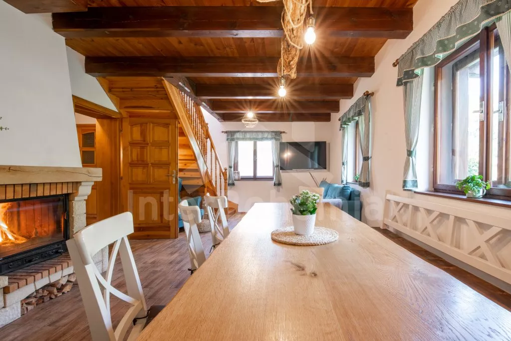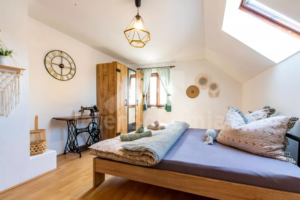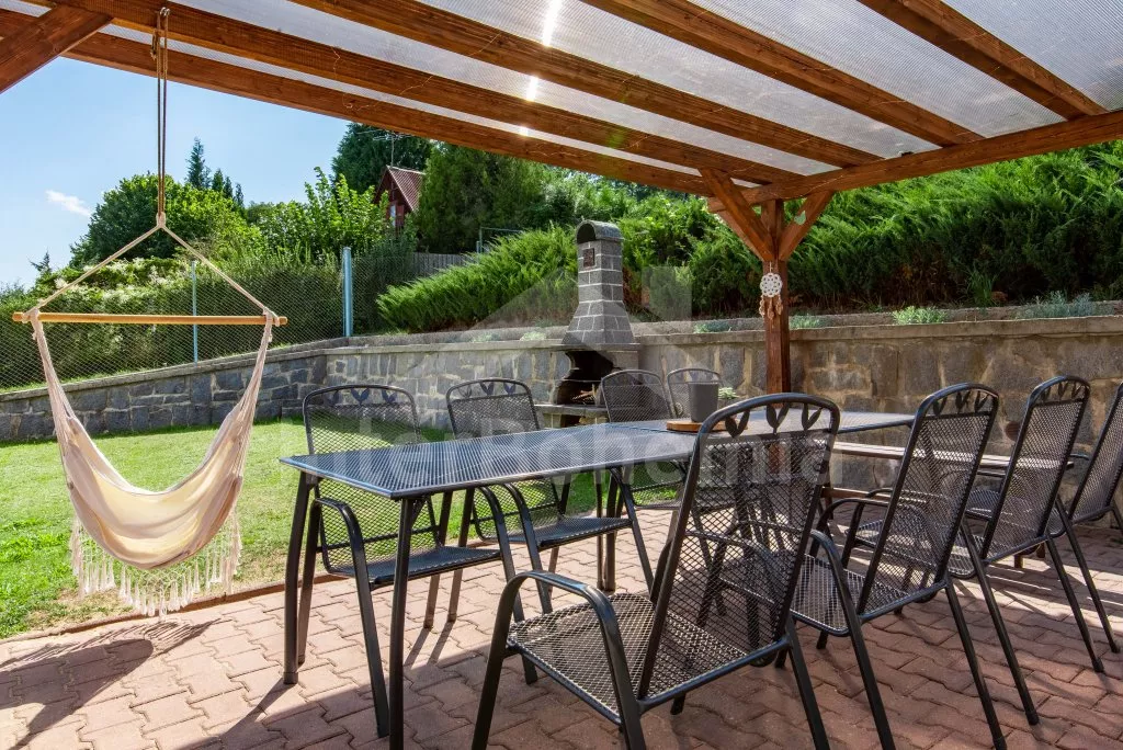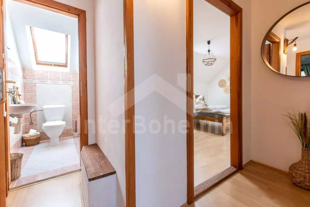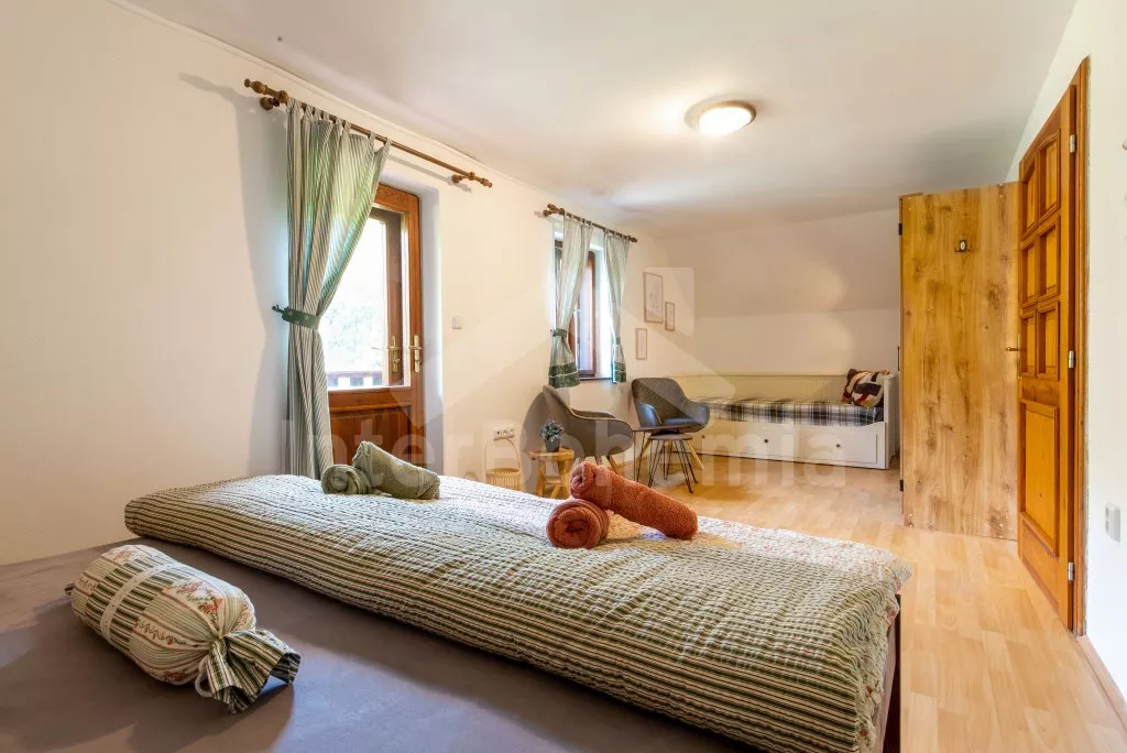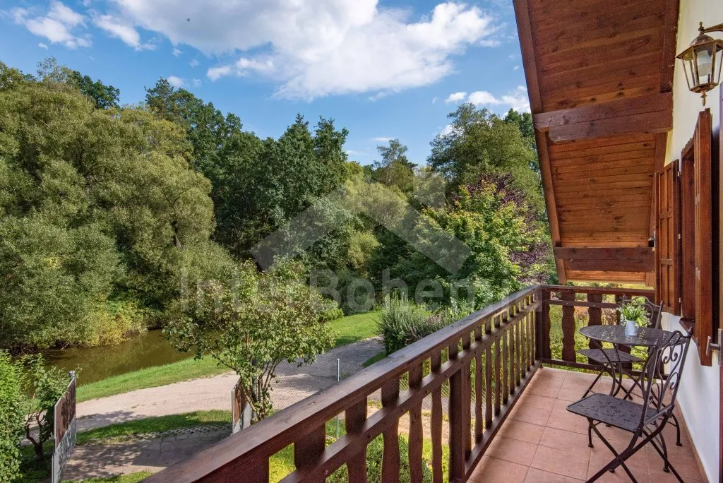 Ein Ferienhaus am Ufer des Flusses Lužnice, nach einer geschmackvollen Rekonstruktion im Jahr 2022, mit einem großen Garten und einer großen überdachten Pergola. Im Erdgeschoss ein Wohnzimmer mit einem Esstisch für 10 Personen, einem Sofa (ausklappbar zu einem Doppelbett 200x140 cm), einem Sessel, einer Schaukel, einem Kamin und einem an der Wand befestigten Fernseher. Küche mit Gasherd, Backofen, Mikrowelle, Kühlschrank, Gefrierschrank, Kaffeemaschine, Wasserkocher und Geschirrspüler. Badezimmer mit Dusche in der Badewanne, Waschbecken und Toilette. Hauswirtschaftsraum mit Waschmaschine. Insgesamt 3 Schlafzimmer im Dachgeschoss. Erstes und zweites Schlafzimmer mit Doppelbett, Schreibtisch und TV. Drittes Schlafzimmer mit einem Doppelbett, einem Einzelbett (ausklappbar zu einem normalen Doppelbett), einer Sitzecke und Zugang zu einem Balkon mit Blick auf den Fluss. Separate Toilette mit Waschbecken. Heizung des Gebäudes mit einem Kamin. Den Gästen steht ein großzügiger, komplett eingezäunter Garten, eine überdachte Pergola mit Sitzgelegenheiten, eine Gartenfeuerstelle, ein Trampolin und ein Sandkasten für Kinder zur Verfügung. Eingezäunter Parkplatz für bis zu 4 Fahrzeuge.