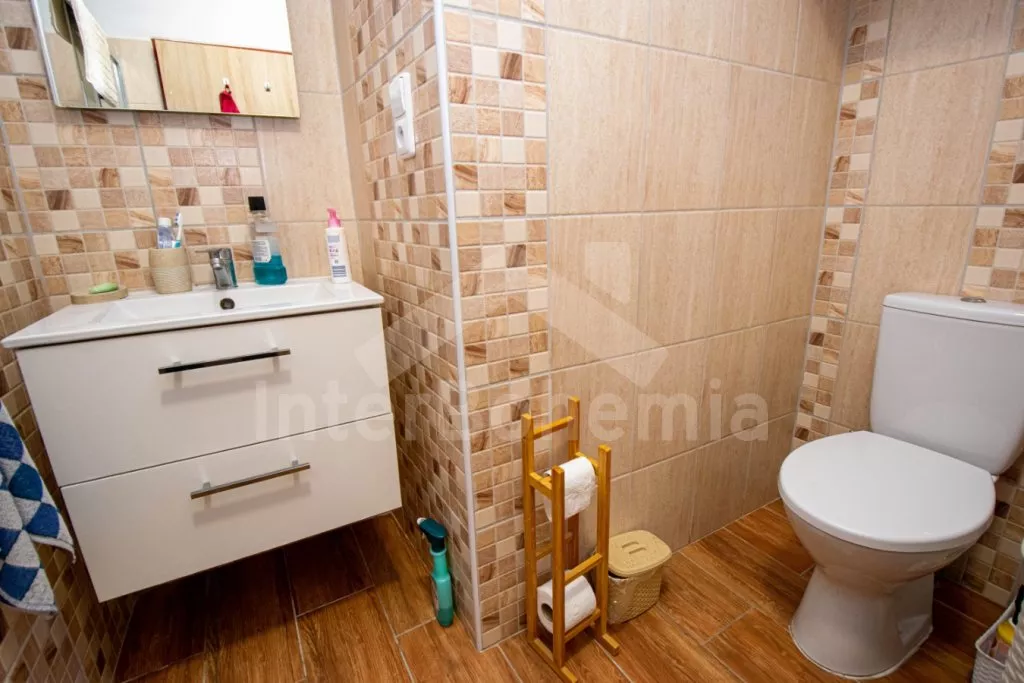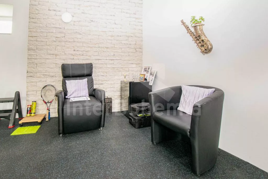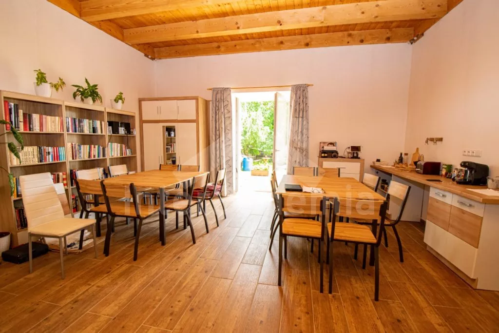 Zugang zu den Gemeinschaftsräumen vom Hof. Wohnzimmer mit Esstisch für 16 Personen, Küchenzeile, Kaffeemaschine, Toaster, Radio, Mikrowelle (2x), Sofa, Couchtisch, LCD-TV und Bibliothek. Moderne Küche mit Cerankochfeld, Elektroherd, Kühlschrank mit Gefrierfach, Wasserkocher, Geschirr und Geschirrspüler. Badezimmer mit Dusche, Waschbecken und Toilette. Fitnessraum mit diversen Fitnessgeräten und Sonnenliegen. Sauna im modernen Stil mit bequemen Liegen, Badewanne und zwei Duschen. Sie verfügen über einen Fahrradschuppen, Waschküche mit Waschmaschine und Kühlschrank, separates WC. Das Gebäude wird über eine Wärmepumpe beheizt und die Räume sind mit Infrarotstrahlungsplatten ausgestattet. Keller mit Vinothek mit Obst- und Traubenweinen. Der Gemeinschaftsgarten bietet einen Sitzbereich, Grill, Lagerfeuerplats, eine Kinderrutsche und ein Trampolin. Im zweiten Teil des Gebäudes weiden Schafe hinter dem Zaun und tragen so zur entspannten und ländlichen Atmosphäre bei. Parkplatz vor dem Haus für 3 Autos.