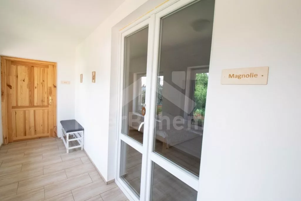 Das Appartement Magnolia befinden sich im ersten Stock mit eigenem Eingang an der Seite des Gebäudes. Im Appartement sind Doppelbett, Zustellbett, Couchtisch mit Wasserkocher, TV, Garderobe, Badezimmer mit Badewanne, Waschbecken und WC.