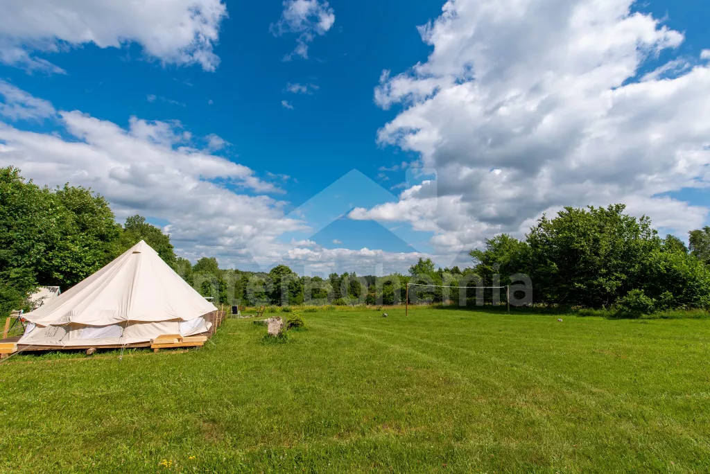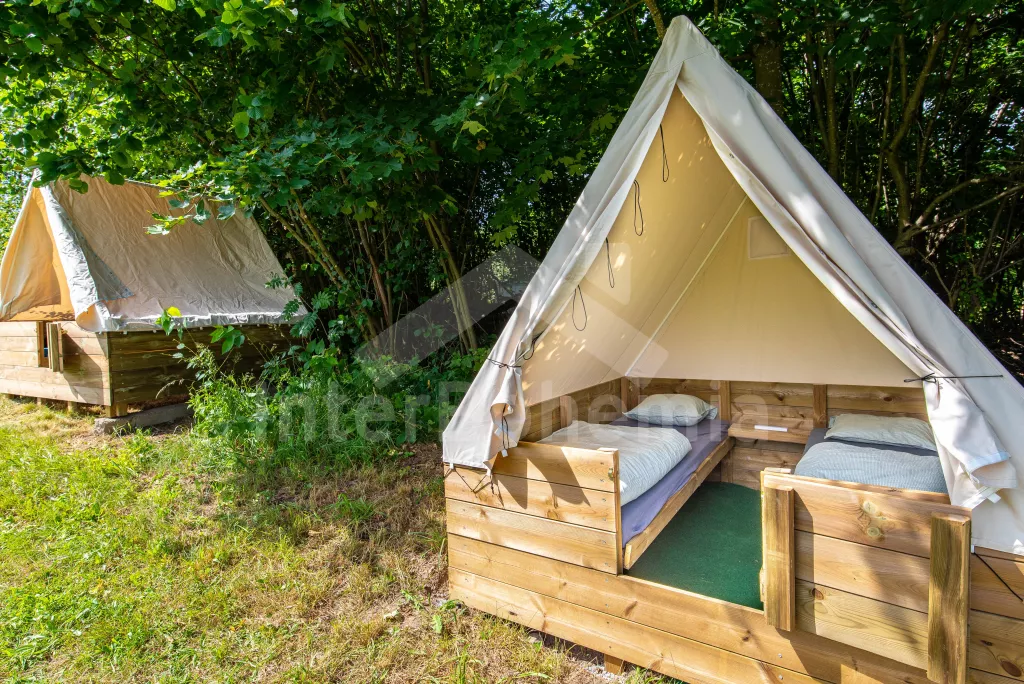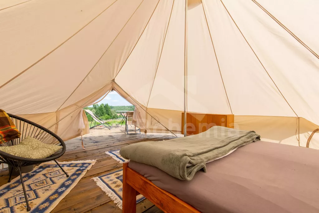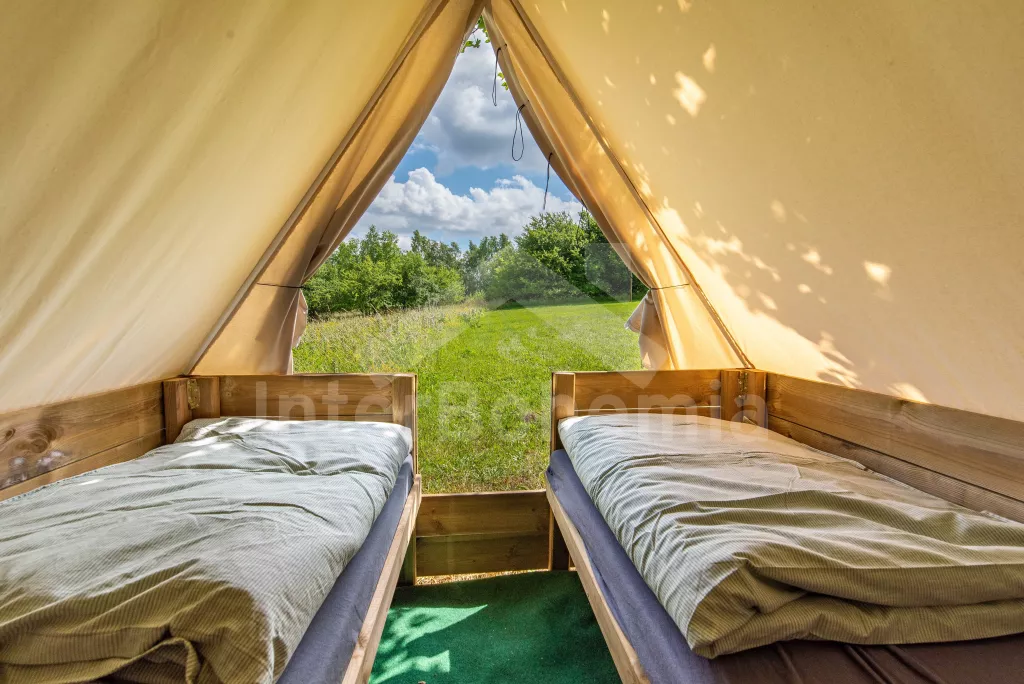 Ubytování ve třech glampingových stanech na 2 ha pozemku, který hostům nabízí maximální spojení s přírodou a krásné prostředí. Vybavení je koncipováno moderně se skloubením stylu 60. let. Hlavní stan (19m2) na dřevěném podiu vybaven manželskou postelí, komodou, křesly, lampami, elektrickým vyhřívačem a větrákem. Vedle další dva stany (2x2 m) – každý se dvěma jednolůžky, lampičkami a podlážkami a koberci na podlaze. Ve všech stanech zavedena elektřina.