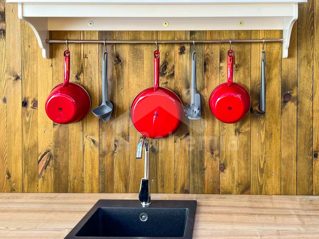 V prostoru glampingu dále koupelna se sprchovým koutem s tekoucí teplou vodou (bojler) a umyvadlem. Stylová suchá toaleta.