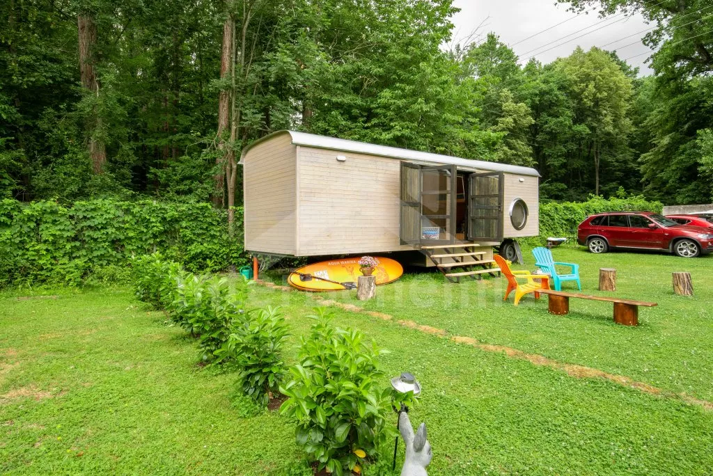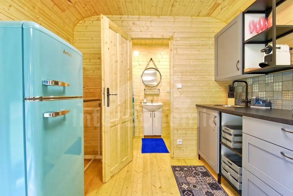 Obýváte moderně vybavenou maringotku, postavenou na zakázku v roce 2022, v uzavřeném areálu s velkým částečně zapuštěným bazénem a dětským hřištěm. Maringotka je vybavena kuchyňským koutem s elektrickou varnou deskou, lednicí s mrazákem, kávovarem, varnou konvicí a toustovačem. Prostorná palanda se dvěma dvoulůžky. Vnitřní posezení na pohodlných sedacích vacích. Koupelna se sprchovým koutem, umyvadlem a WC. Hosté mají k dispozici také posezení před ubytováním a zahradní gril. Možnost využití částečně zapuštěného bazénu, trampolíny pro děti a dětského hřiště (společné s druhou maringotkou a chatou). Z areálu vede přímý přístup k řece a cyklostezce. Parkoviště přímo u objektu.