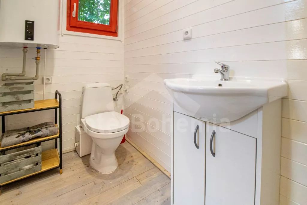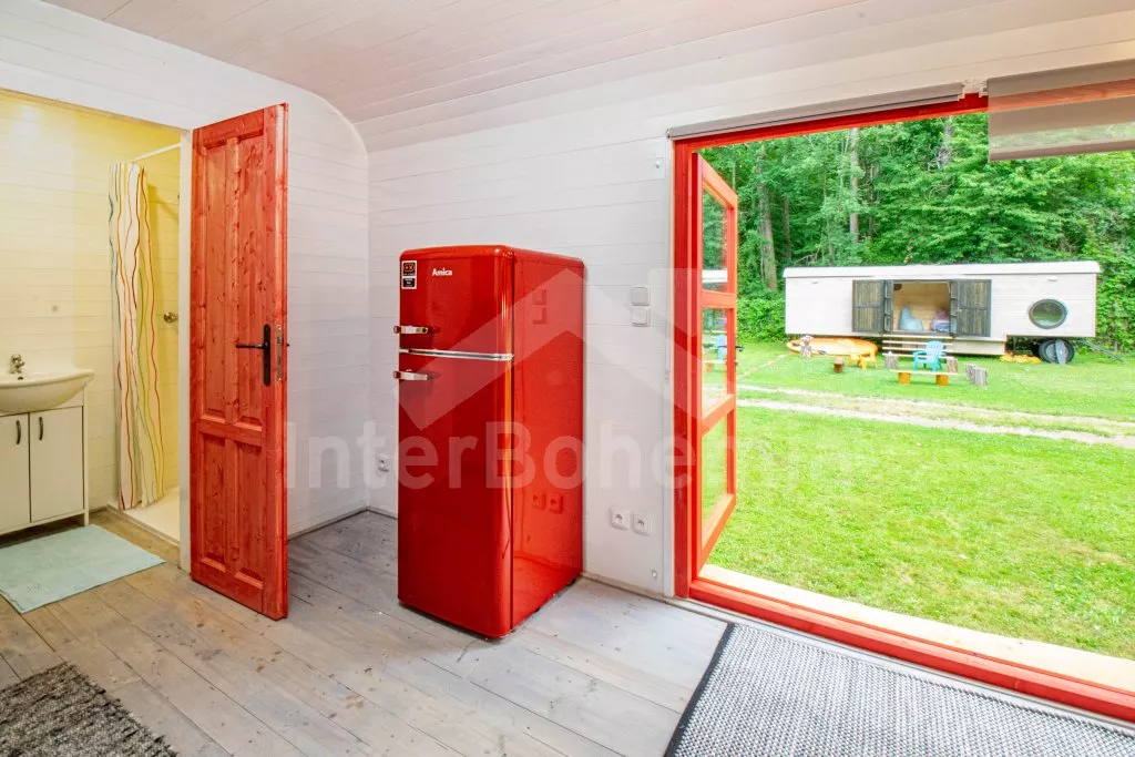 Obýváte moderně vybavenou maringotku, postavenou na zakázku v roce 2022, v uzavřeném areálu s velkým částečně zapuštěným bazénem a dětským hřištěm. Maringotka je vybavena kuchyňským koutem s elektrickou varnou deskou, lednicí s mrazákem, kávovarem, varnou konvicí a toustovačem. Prostorná palanda se dvěma dvoulůžky. Vnitřní posezení na pohodlných sedacích vacích. Koupelna se sprchovým koutem, umyvadlem a WC. Hosté mají k dispozici také posezení před ubytováním a zahradní gril. Možnost využití částečně zapuštěného bazénu, trampolíny pro děti a dětského hřiště (společné s druhou maringotkou a chatou). Z areálu vede přímý přístup k řece a cyklostezce. Parkoviště přímo u objektu.