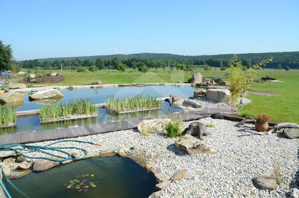 Dům je vytápěn ústředním topením na tuhá paliva. Rozlehlý pozemek u domu není oplocen, k dispozici je terasa se zahradním nábytkem, zahradní jezírko – biotop, s filtrací, vhodné ke koupání, dětské hřiště s pískovištěm a trampolínou, zatravněné hřiště na fotbal či jiné míčové hry a cvičné golfové odpaliště s jednou jamkou. Parkování na pozemku před objektem.