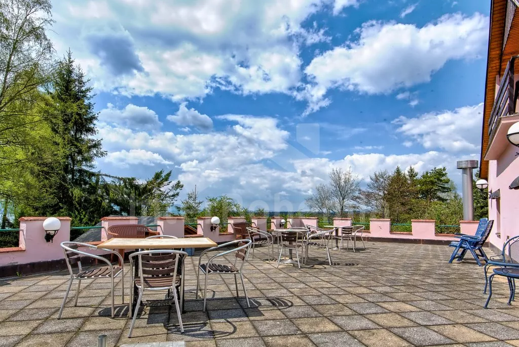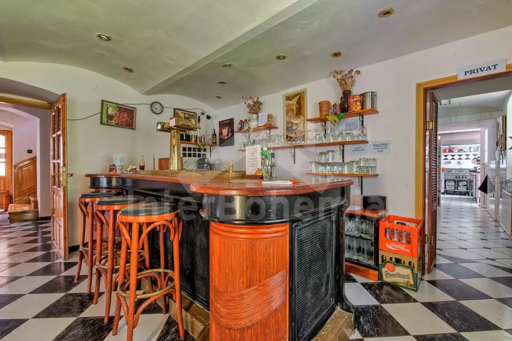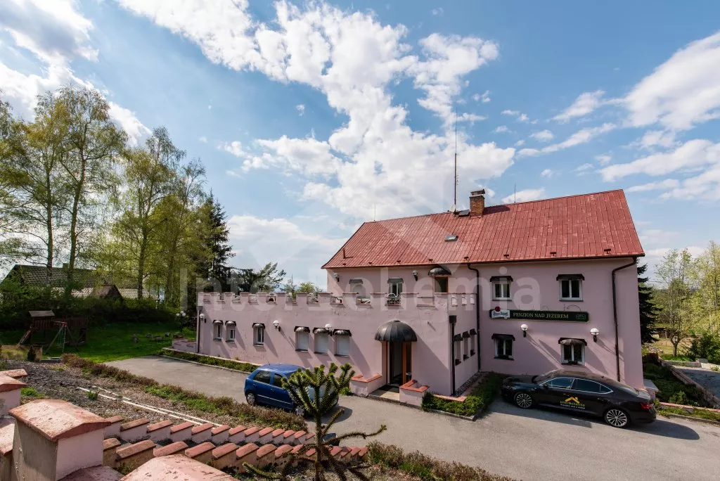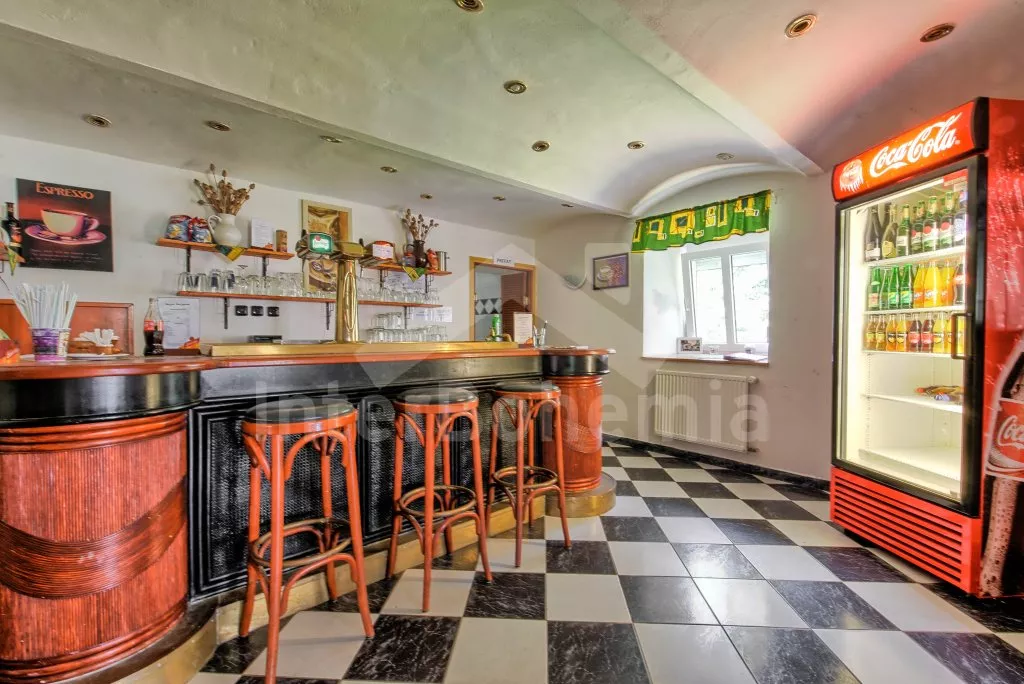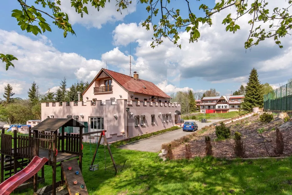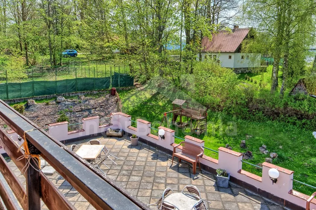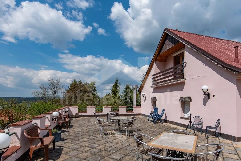 Prostorný penzion s obrovskou terasou s výhledem na Lipno a vnitřním vyhřívaným bazénem. V přízemí mají hosté k dispozici bar, velikou jídelnu s krbem a dětským koutkem a kuchyni se sporákem, troubou, mikrovlnnou troubou, varnou konvicí, kávovarem, lednicí s mrazákem a nádobím. Wellness místnost se zapuštěným bazénem (zajištění a nahřátí bazénu po předchozí domluvě). Společné toalety vedle jídelny.