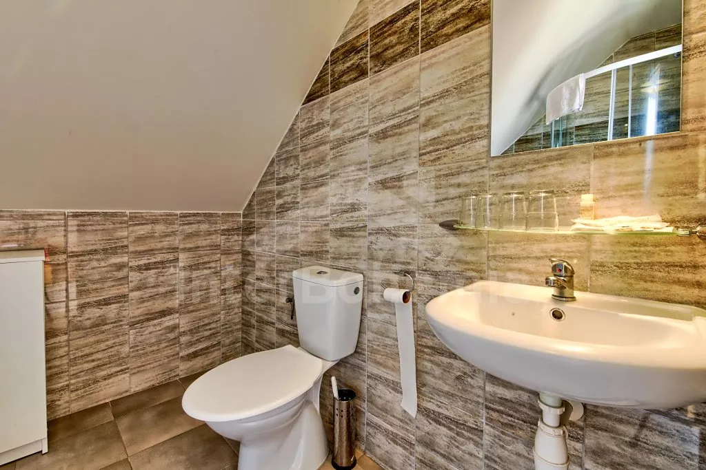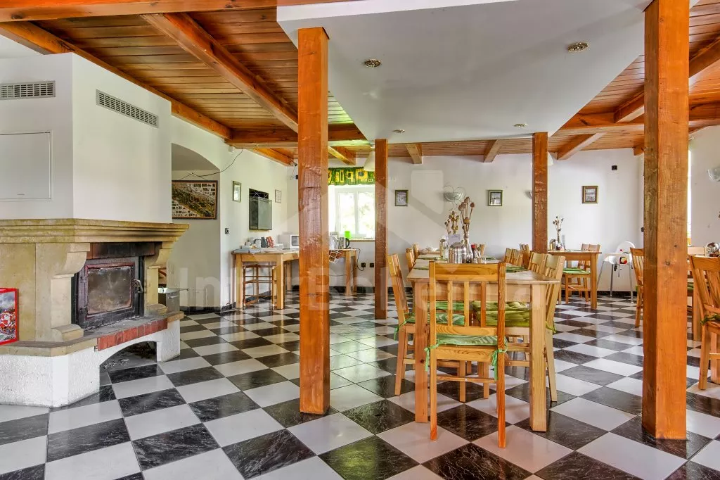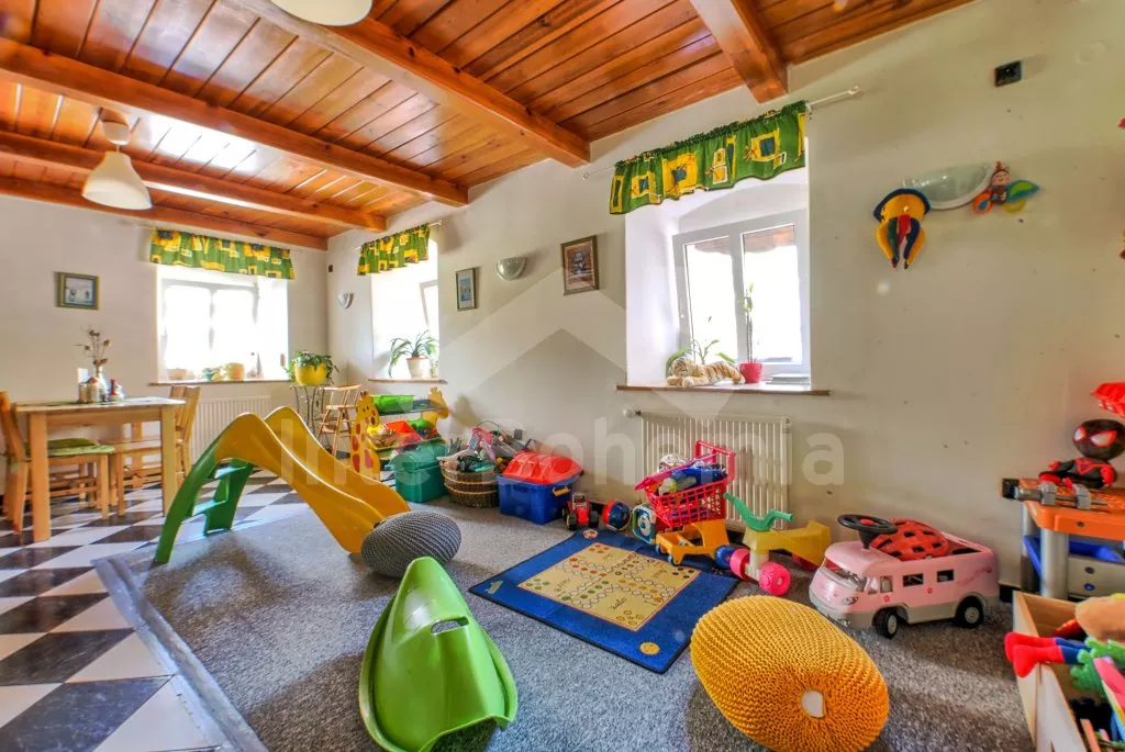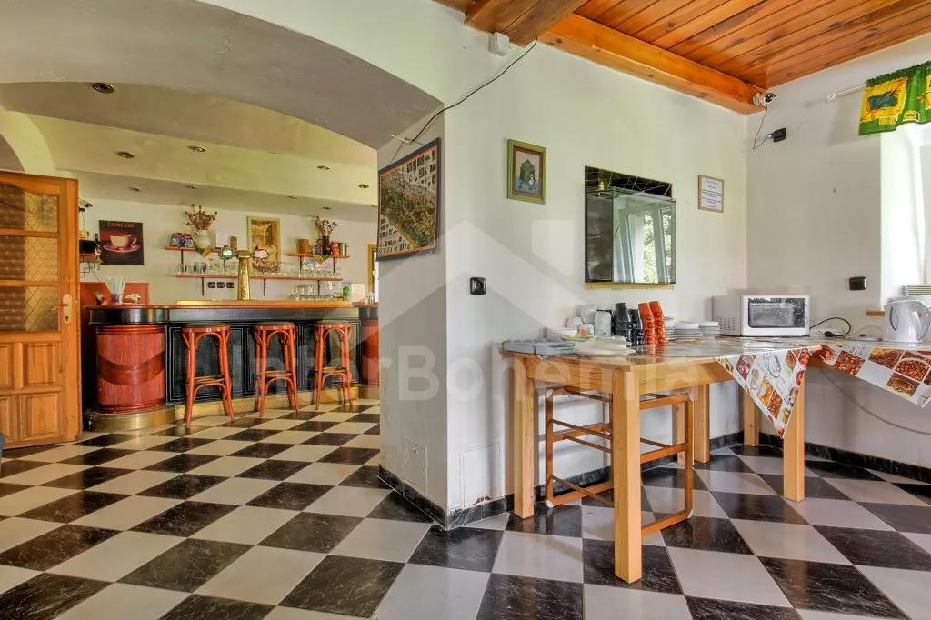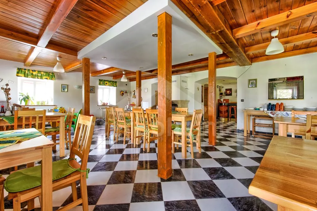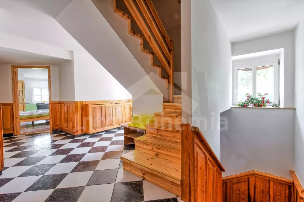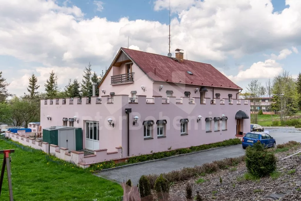 Prostorný penzion s obrovskou terasou s výhledem na Lipno a vnitřním vyhřívaným bazénem. V přízemí mají hosté k dispozici bar, velikou jídelnu s krbem a dětským koutkem a kuchyni se sporákem, troubou, mikrovlnnou troubou, varnou konvicí, kávovarem, lednicí s mrazákem a nádobím. Wellness místnost se zapuštěným bazénem (zajištění a nahřátí bazénu po předchozí domluvě). Společné toalety vedle jídelny.
