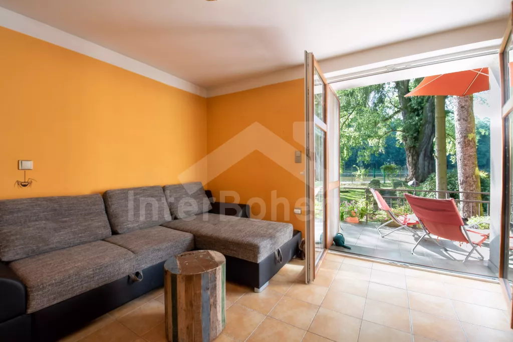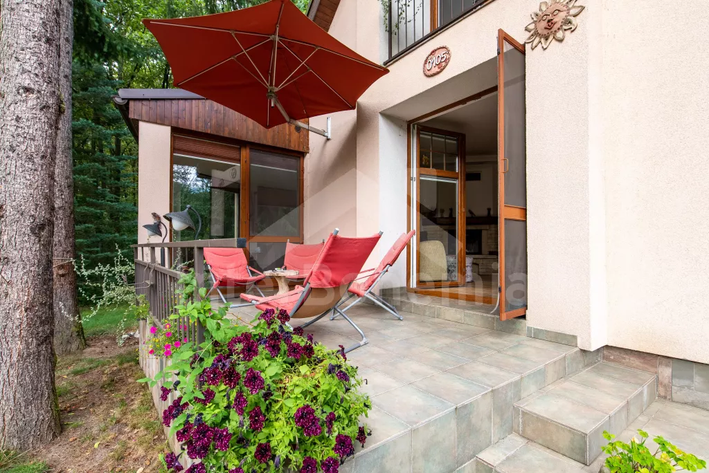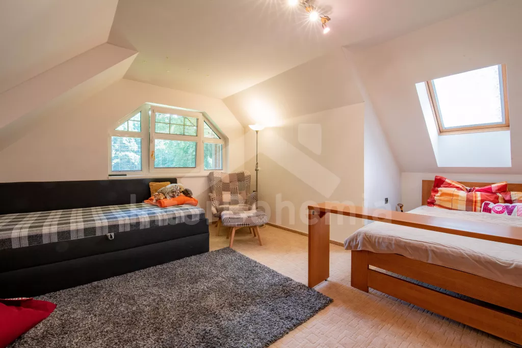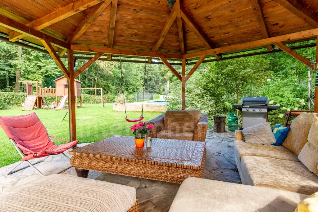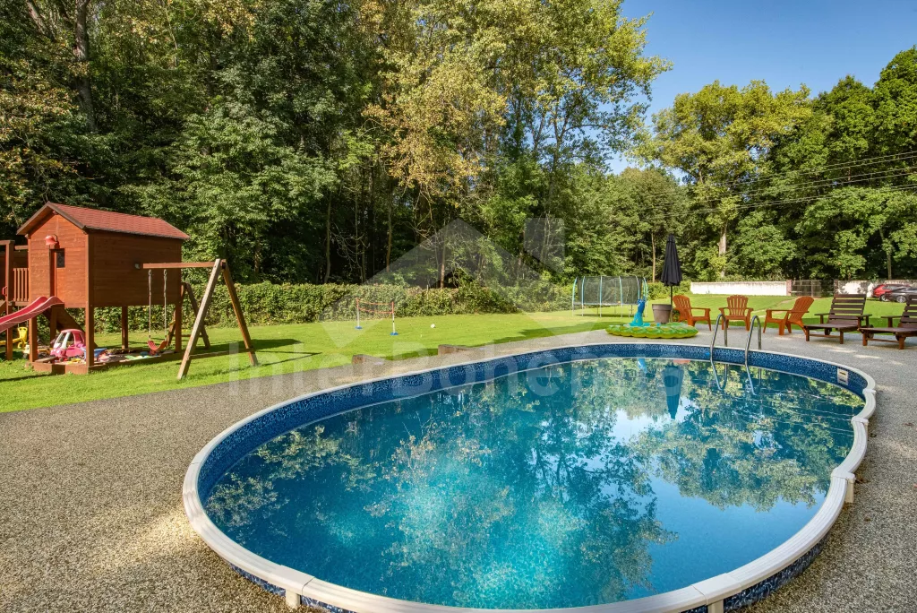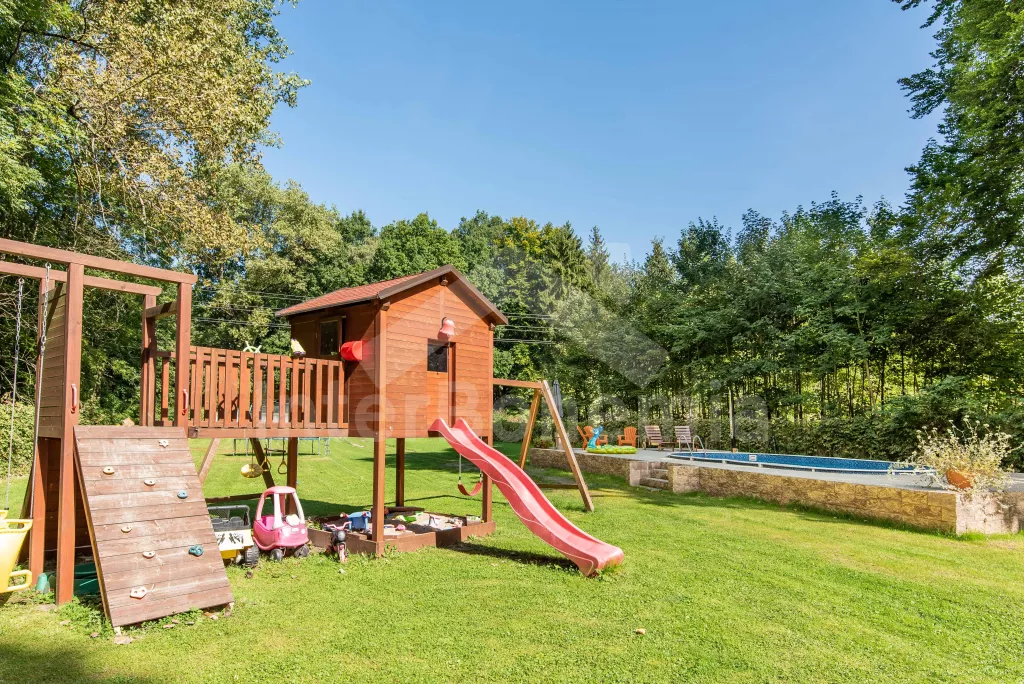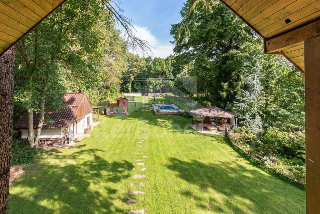 K dispozici obrovská kompletně oplocená zahrada se vzrostlými stromy, dětské hřiště, zapuštěný bazén, trampolína a prostorná krytá pergola s posezením, plynovým grilem a lednicí s mrazákem. Z areálu vede přímý vstup na cyklostezku a k řece. Parkování v areálu.