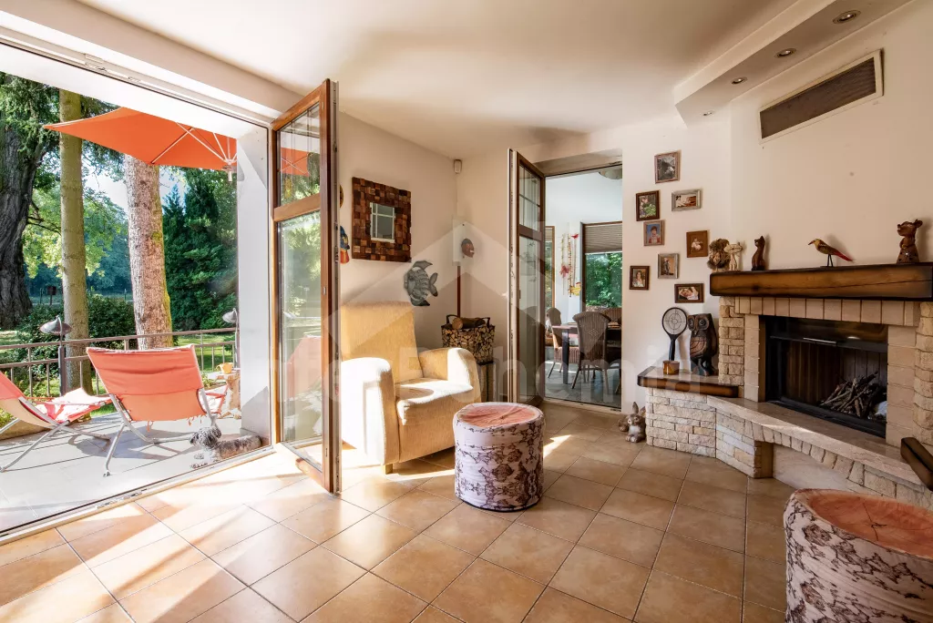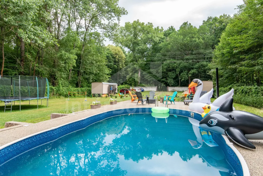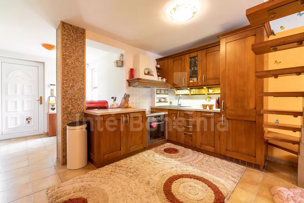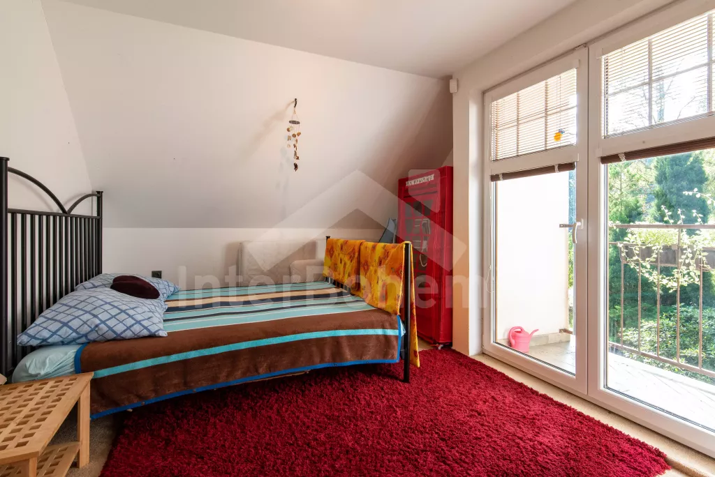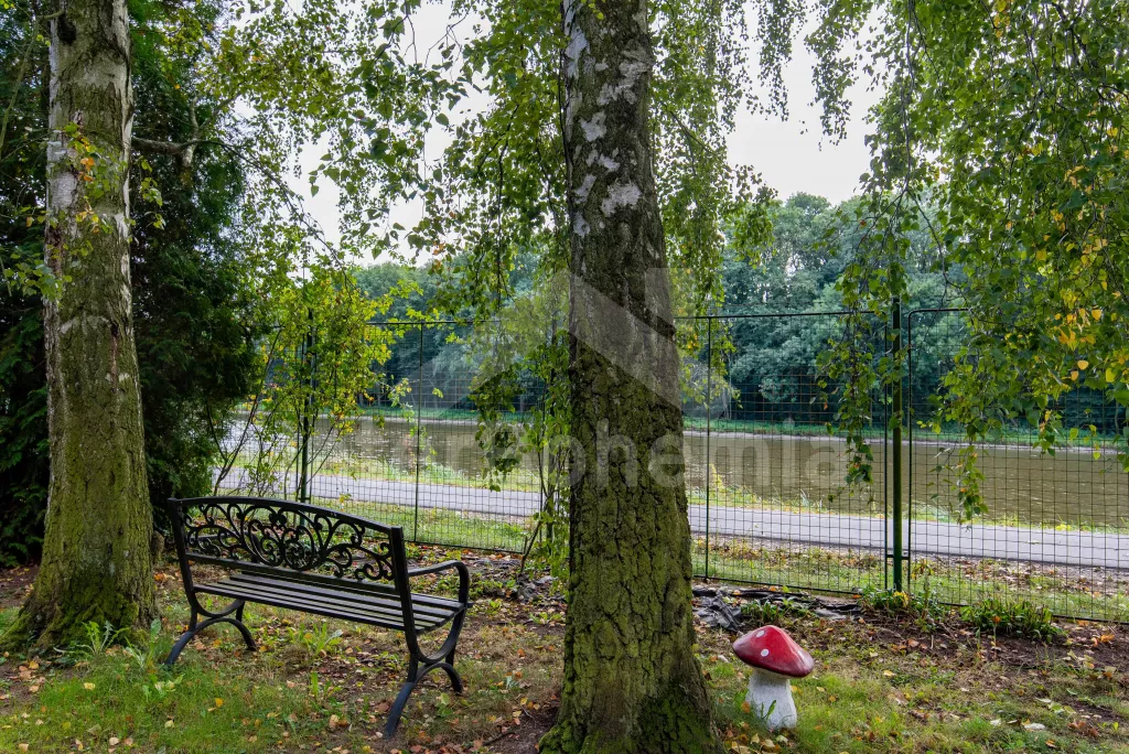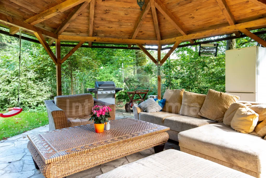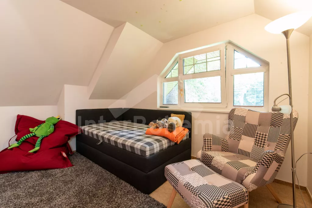 K dispozici obrovská kompletně oplocená zahrada se vzrostlými stromy, dětské hřiště, zapuštěný bazén, trampolína a prostorná krytá pergola s posezením, plynovým grilem a lednicí s mrazákem. Z areálu vede přímý vstup na cyklostezku a k řece. Parkování v areálu.