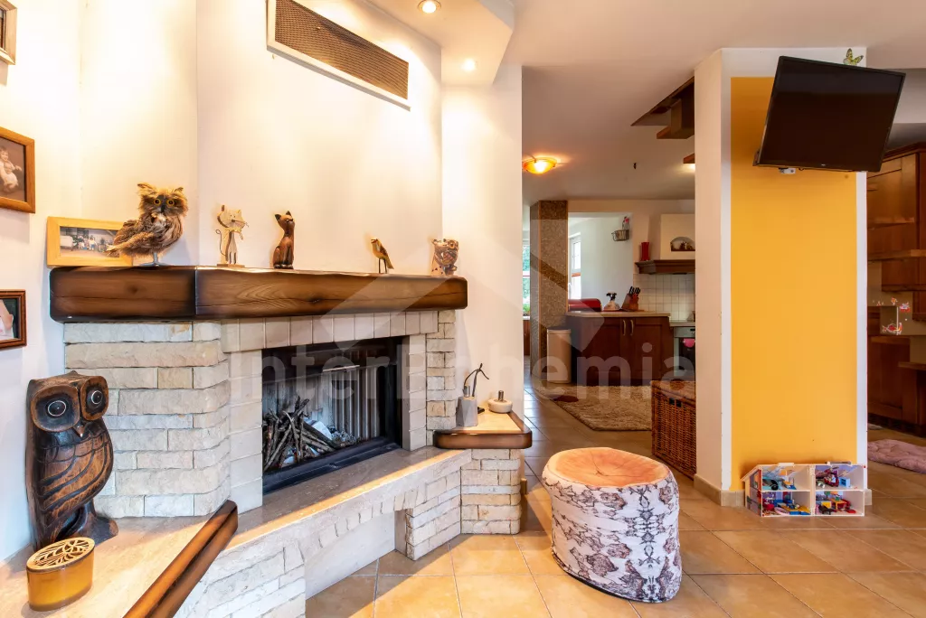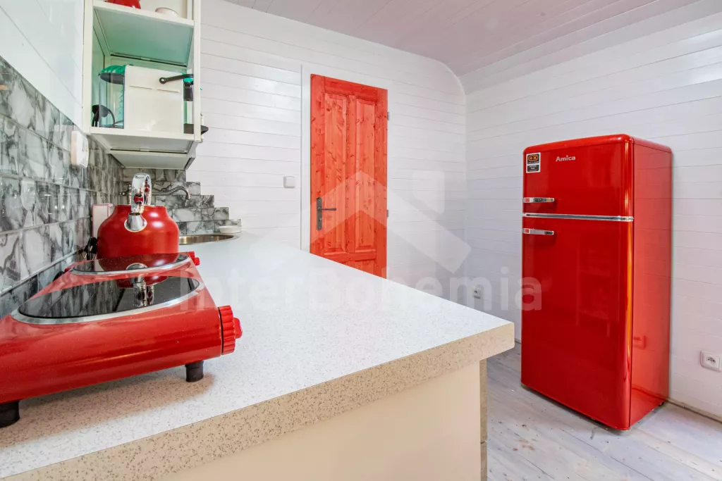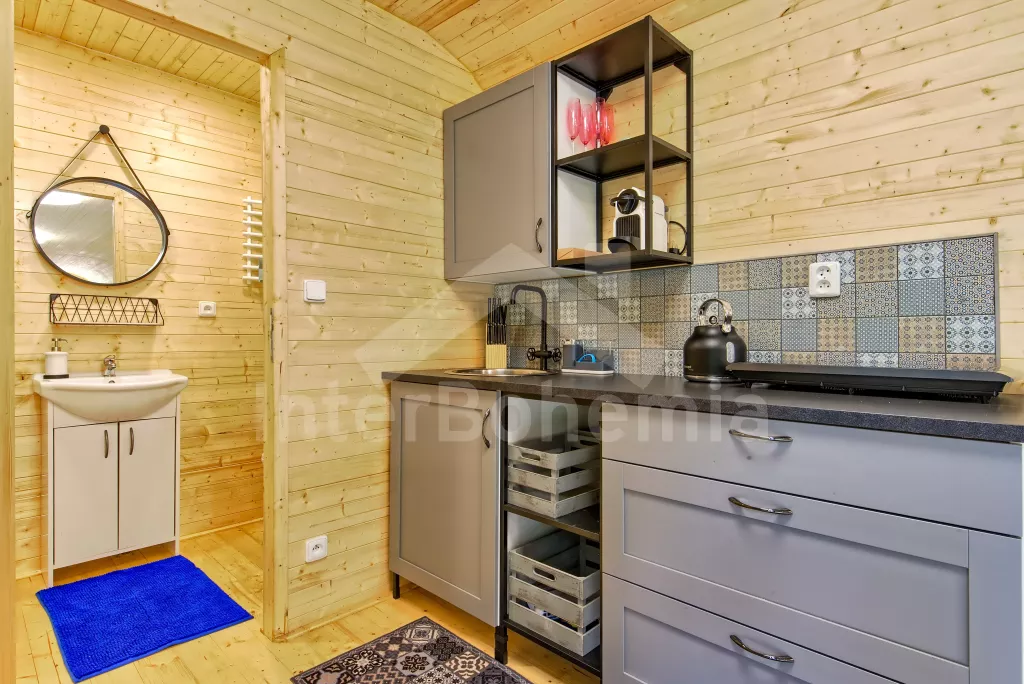 Zděná chata - v přízemí kuchyně s keramickou varnou deskou, troubou, rychlovarnou konvicí a myčkou. Na kuchyni přímo navazuje obývací pokoj se sedací soupravou (extra dvoulůžko), nástěnnou televizí a krbem. Prosklená jídelna s výhledem do přírody zajišťuje dostatek světla po celý den. V jídelně také druhá sedací souprava (extra lůžko). Koupelna se sprchovým koutem, umyvadlem a WC. V podkroví první ložnice s dvoulůžkem, jednolůžkem a televizí a druhá ložnice s dvoulůžkem a vstupem na balkon. Vytápění objektu přímotopy a částečně podlahovým topením.