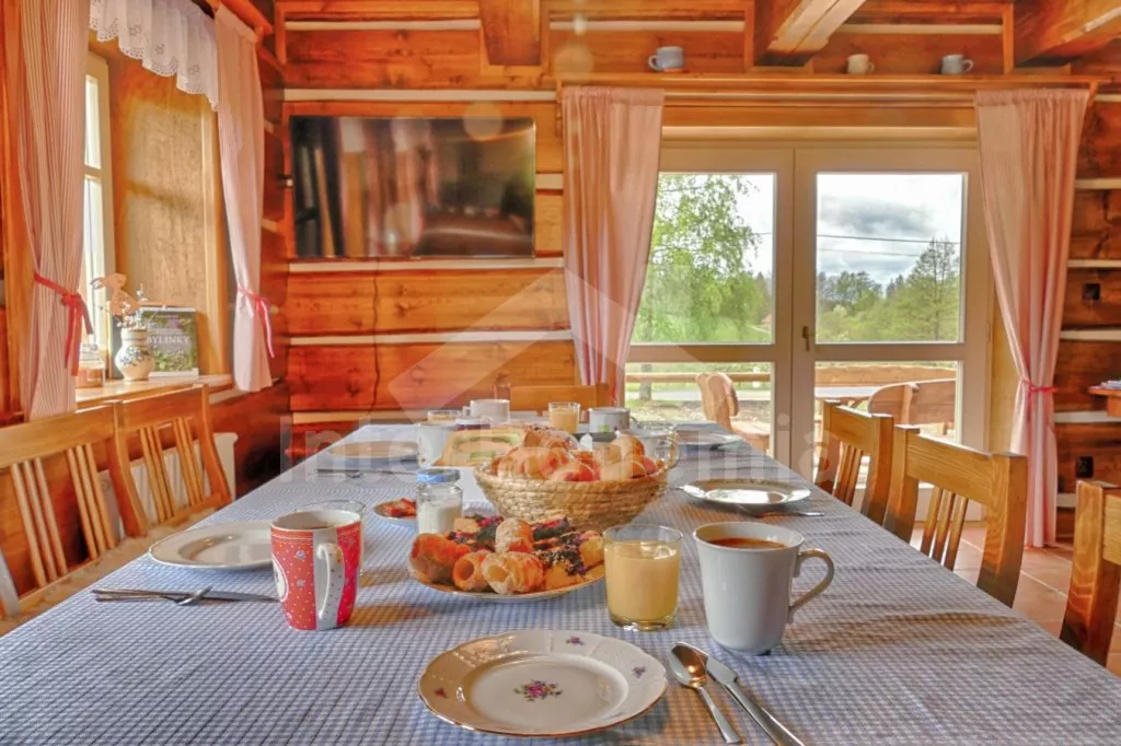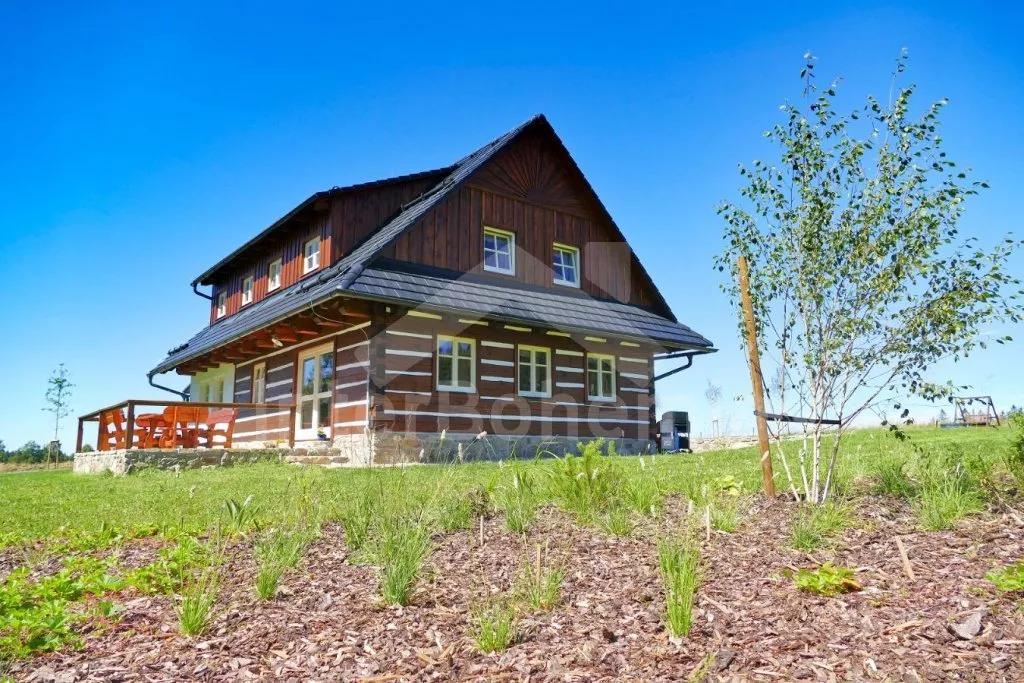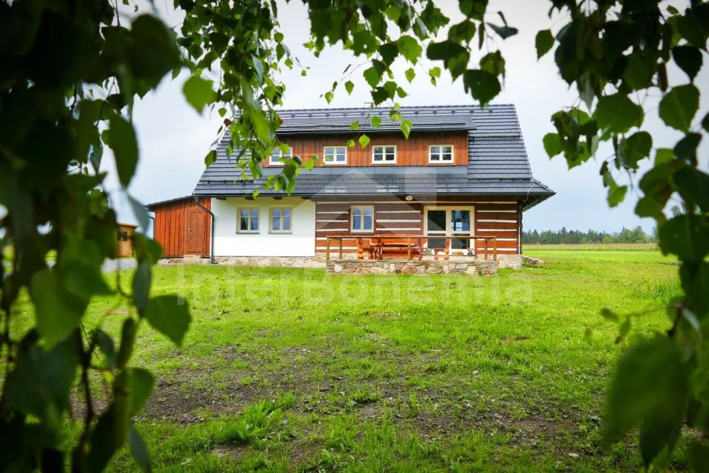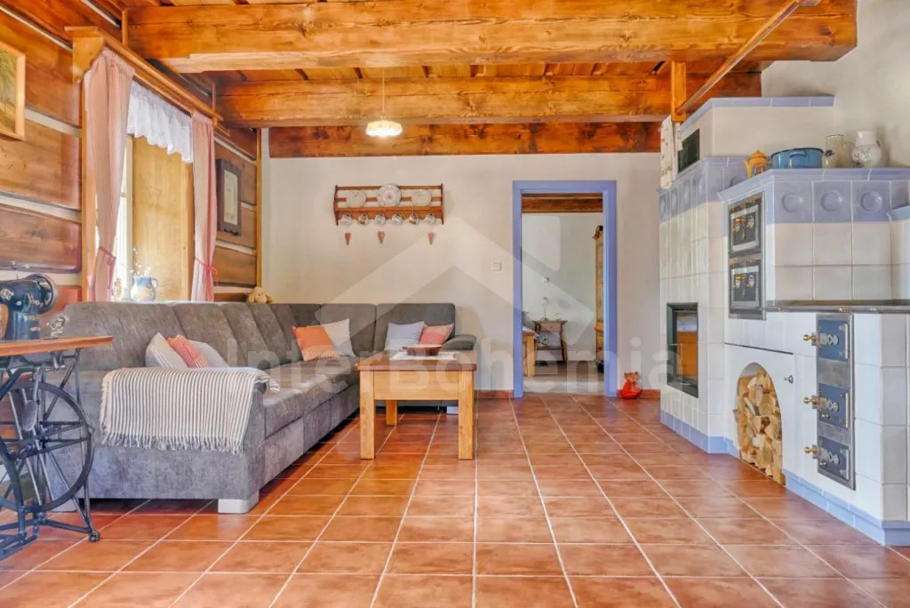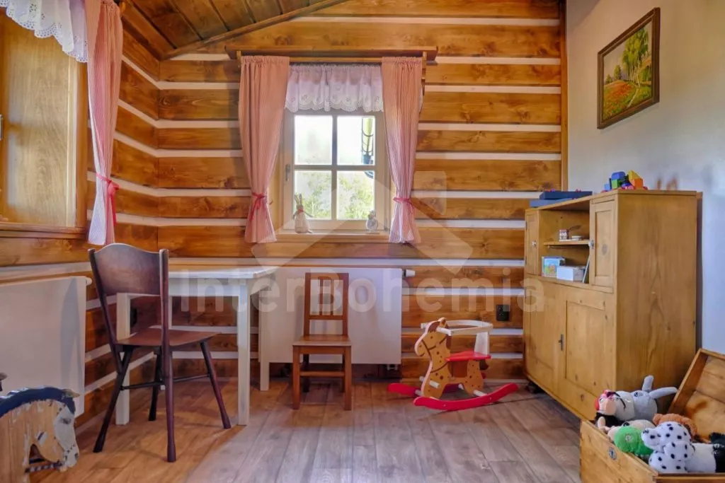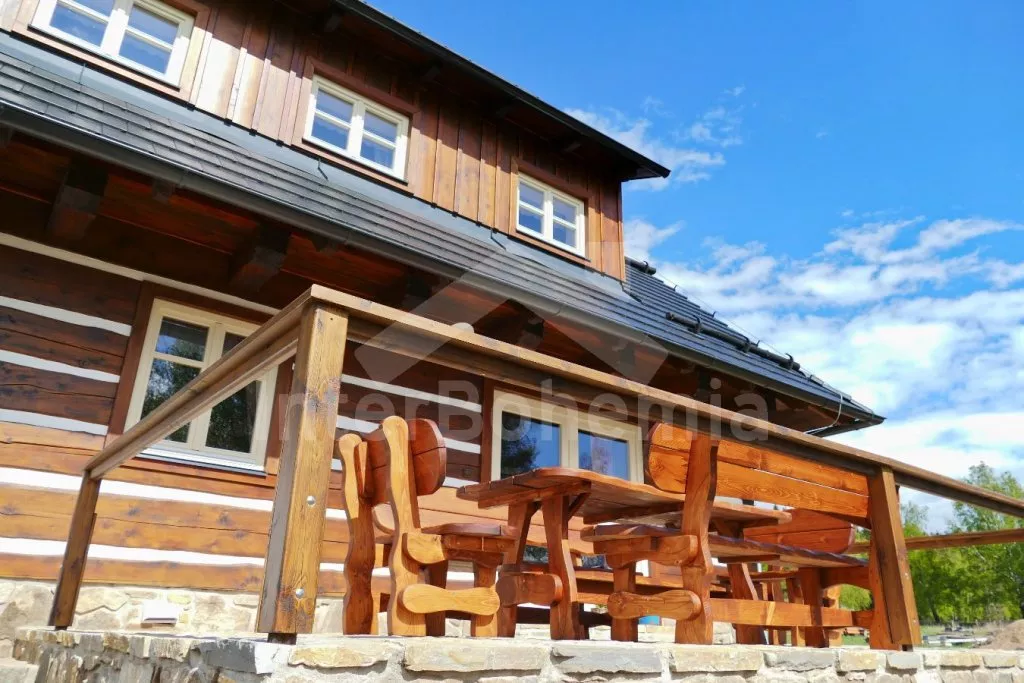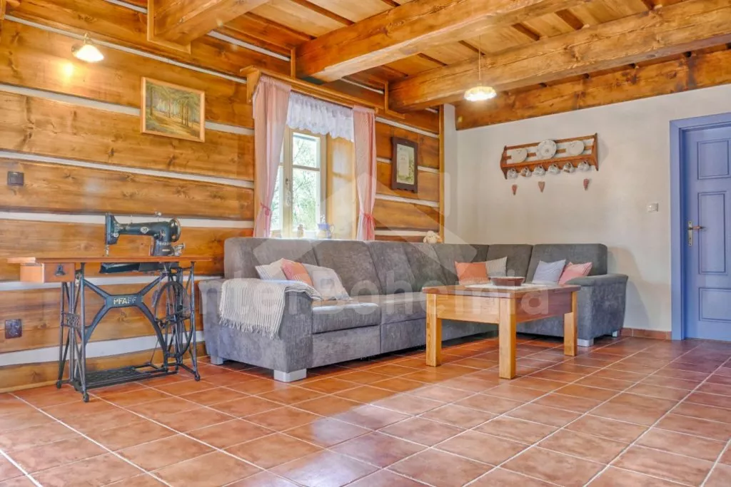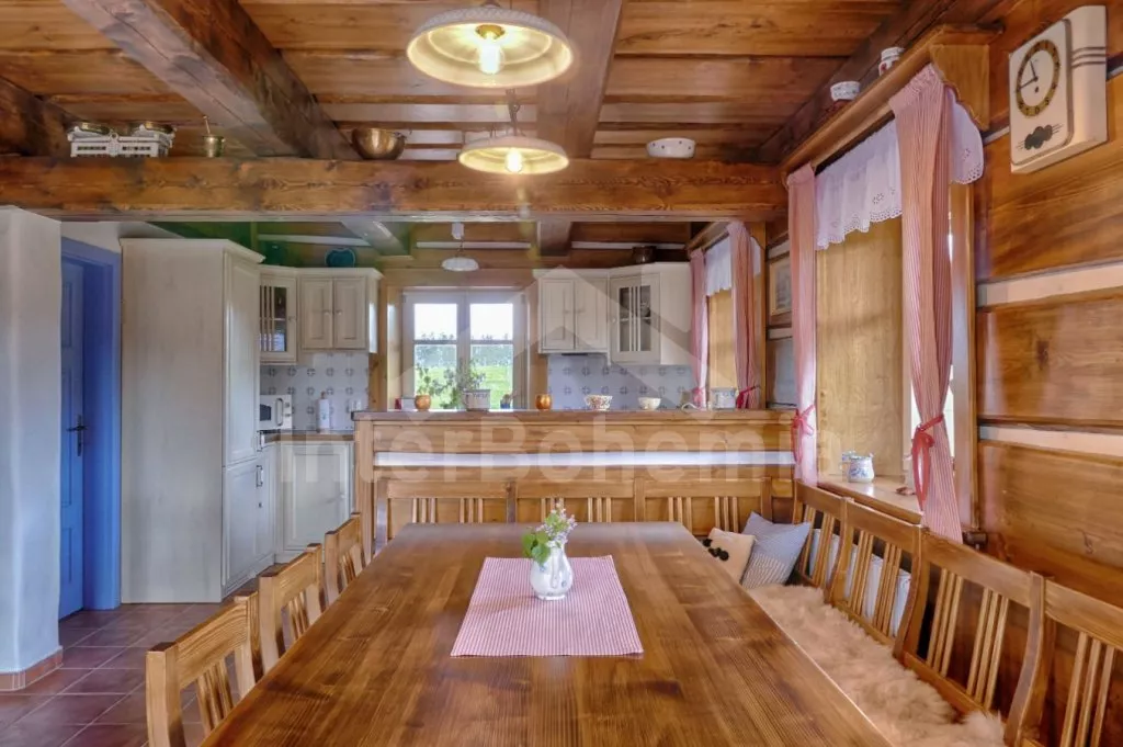 Nově postavená a dobově zařízená roubená chalupa s prostornou společenskou místností, saunou a vířivkou. Vstup, hala, obývací místnost spojená s kuchyní. Kuchyňská linka s indukční varnou deskou, troubou, mikrovlnnou troubou, lednicí s mrazákem, kávovarem, rychlovarnou konvicí, topinkovačem, nádobím a myčkou na nádobí. Na kuchyň navazuje jídelna s velkým dubovým stolem pro 8 osob a LCD televizí se satelitem.