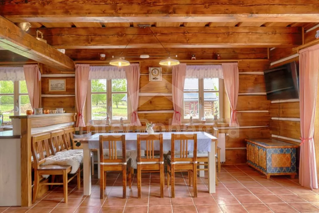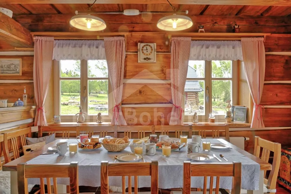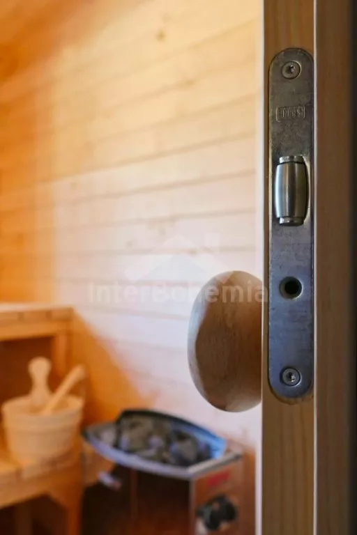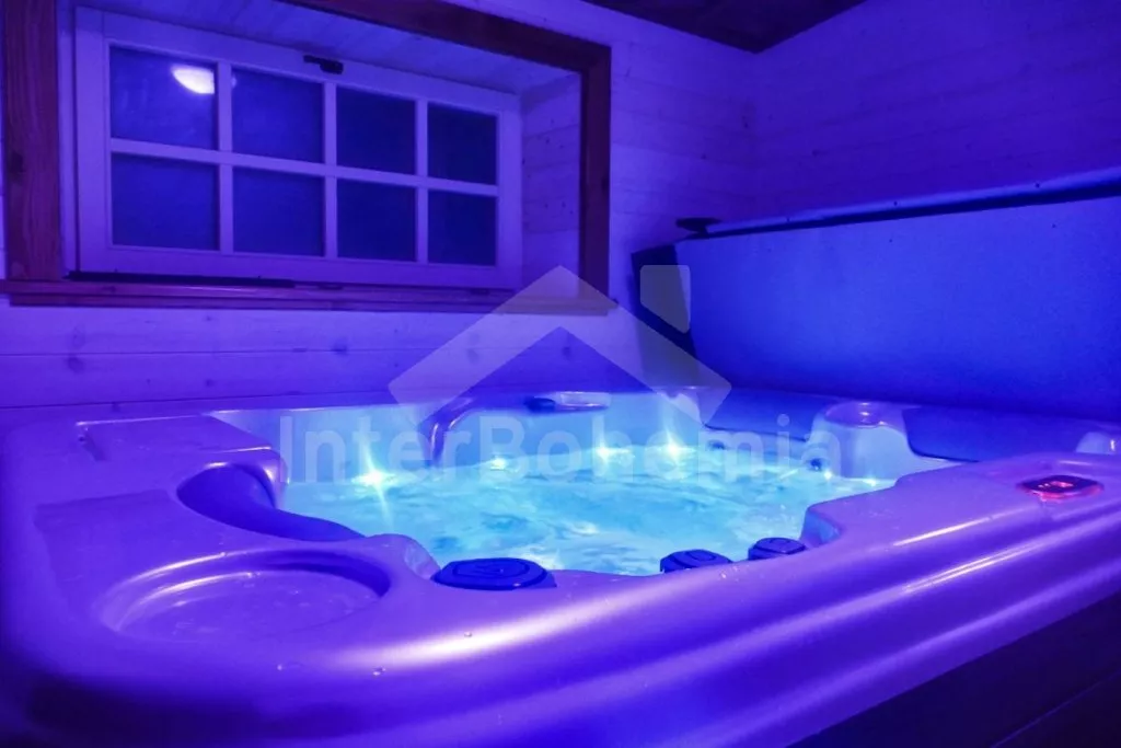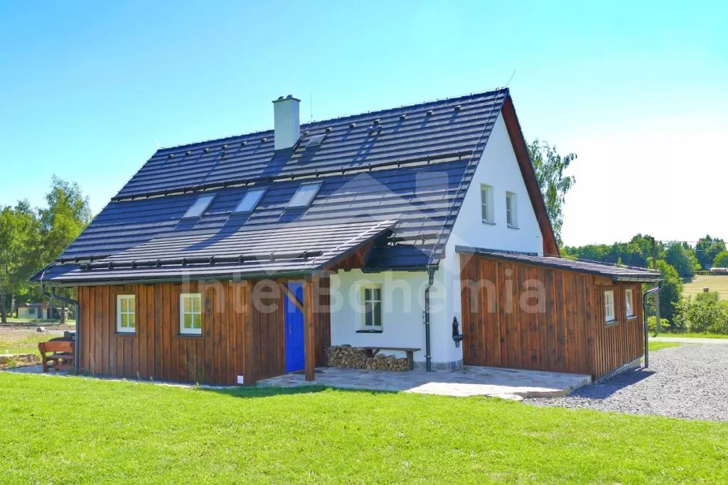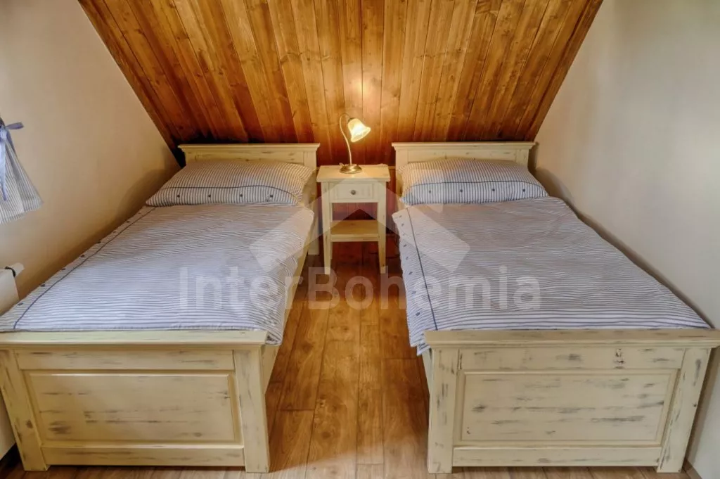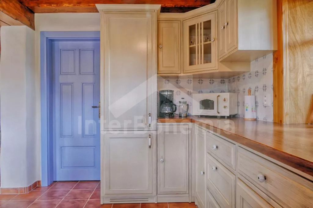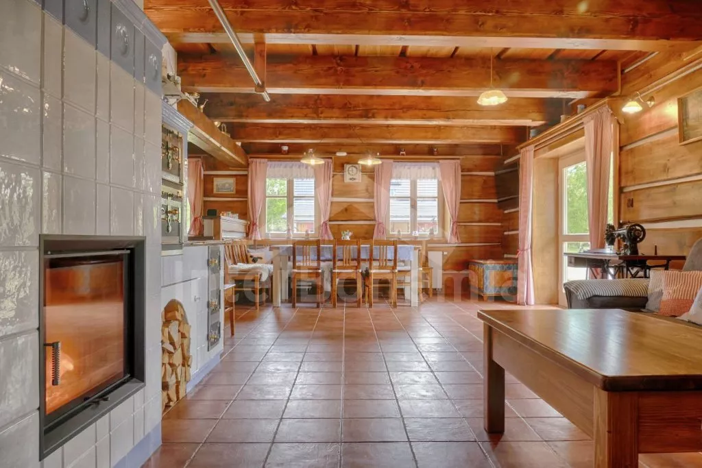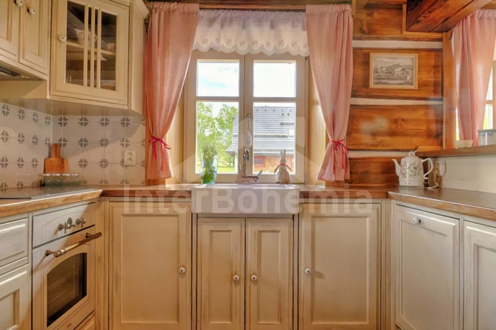 Nově postavená a dobově zařízená roubená chalupa s prostornou společenskou místností, saunou a vířivkou. Vstup, hala, obývací místnost spojená s kuchyní. Kuchyňská linka s indukční varnou deskou, troubou, mikrovlnnou troubou, lednicí s mrazákem, kávovarem, rychlovarnou konvicí, topinkovačem, nádobím a myčkou na nádobí. Na kuchyň navazuje jídelna s velkým dubovým stolem pro 8 osob a LCD televizí se satelitem.