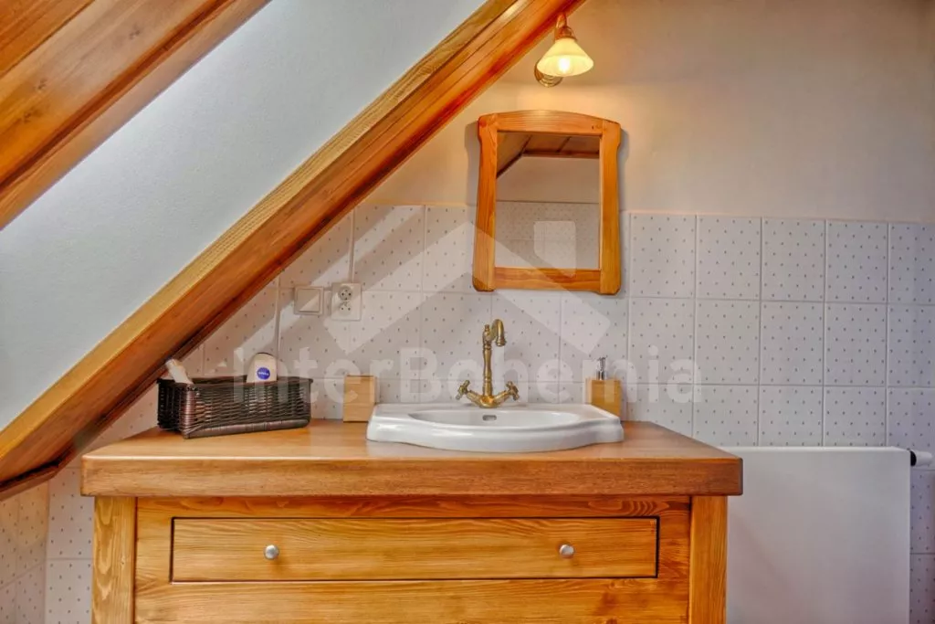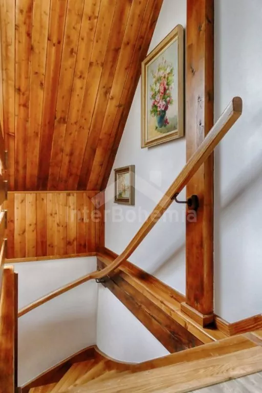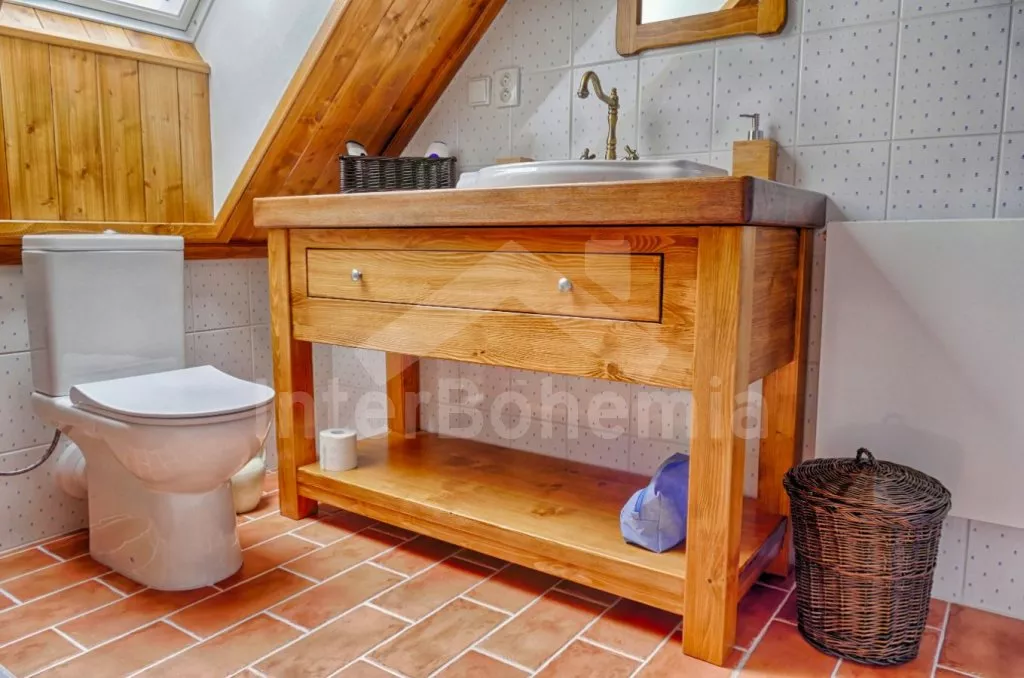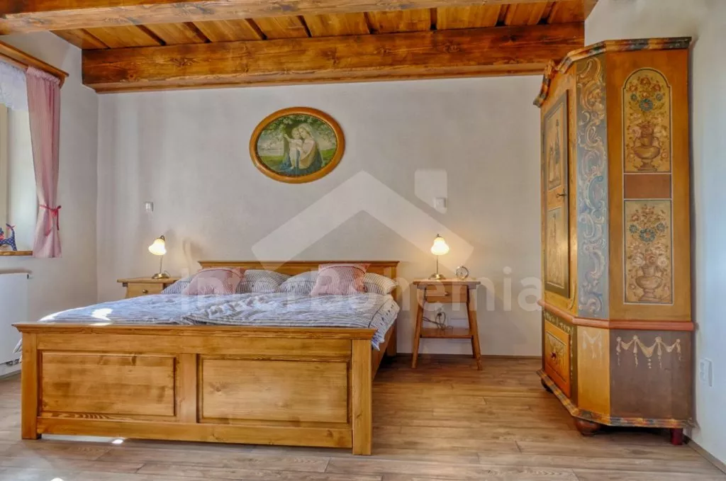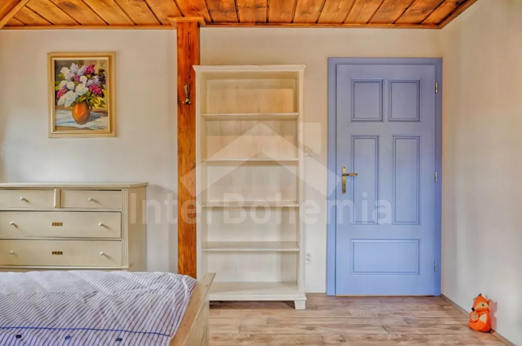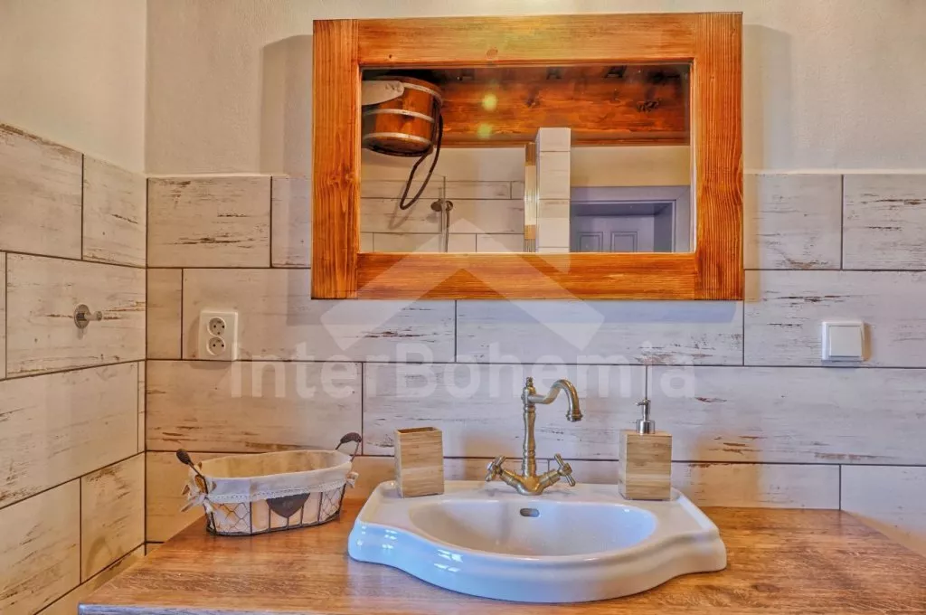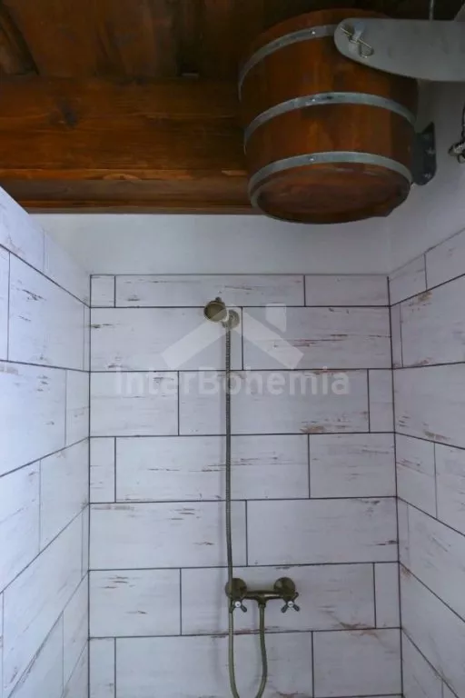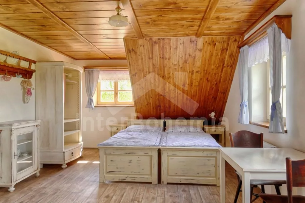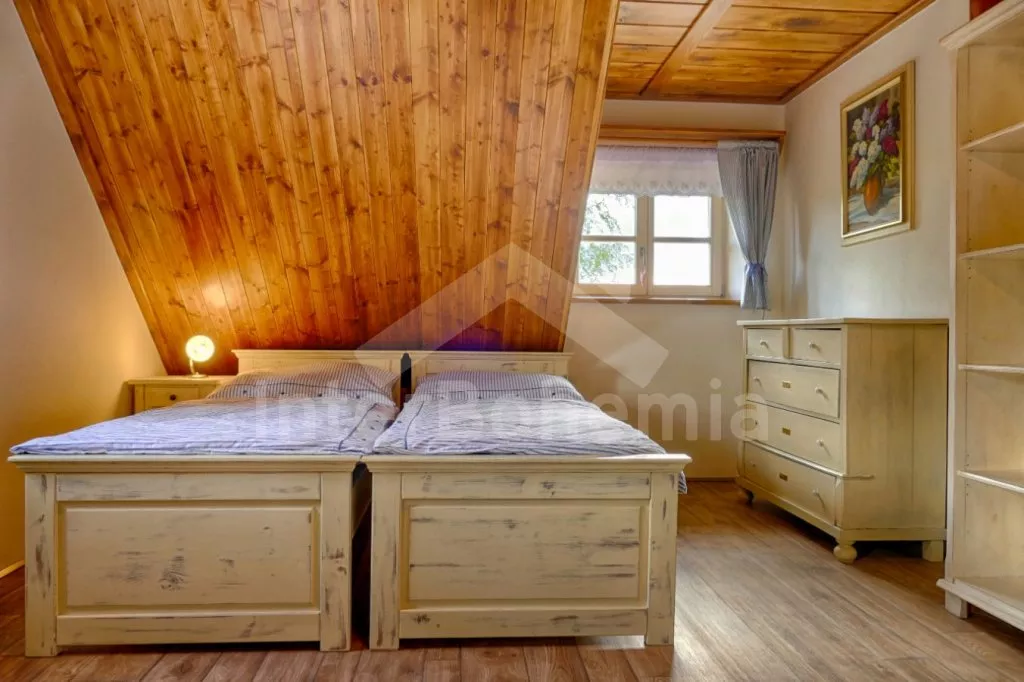 Nově postavená a dobově zařízená roubená chalupa s prostornou společenskou místností, saunou a vířivkou. Vstup, hala, obývací místnost spojená s kuchyní. Kuchyňská linka s indukční varnou deskou, troubou, mikrovlnnou troubou, lednicí s mrazákem, kávovarem, rychlovarnou konvicí, topinkovačem, nádobím a myčkou na nádobí. Na kuchyň navazuje jídelna s velkým dubovým stolem pro 8 osob a LCD televizí se satelitem.