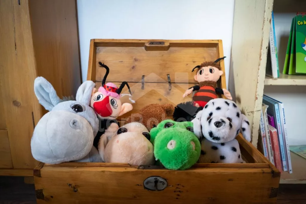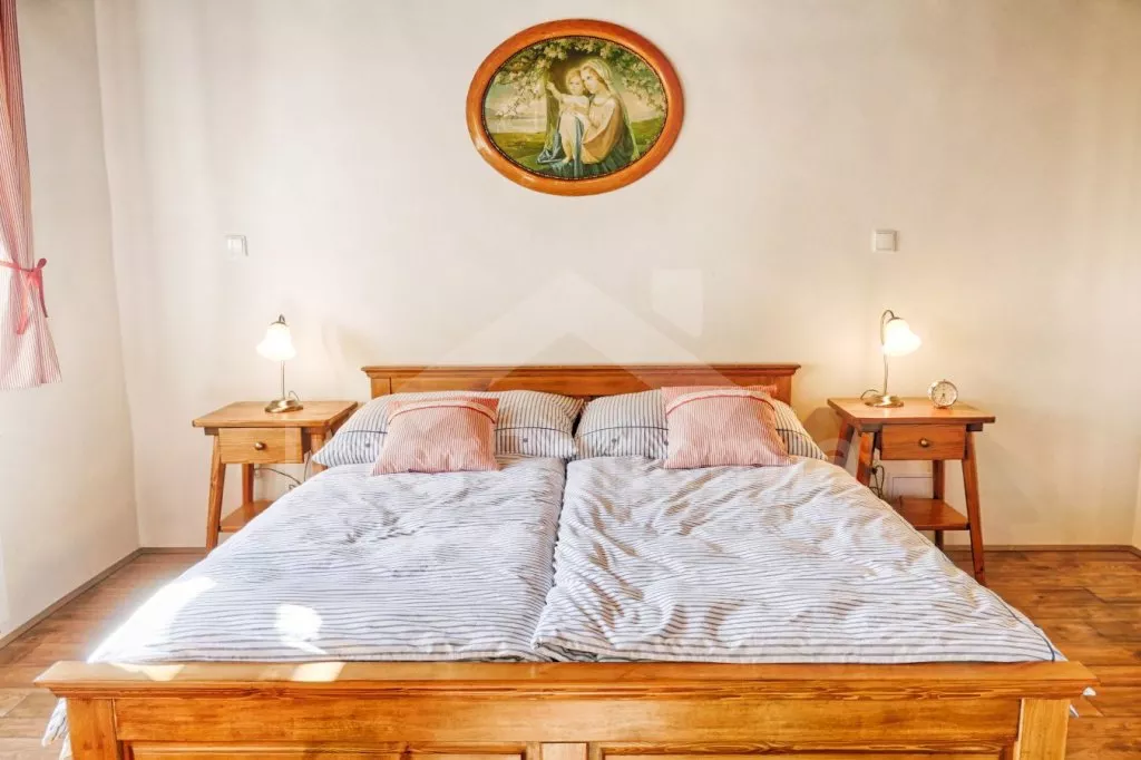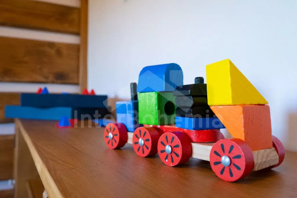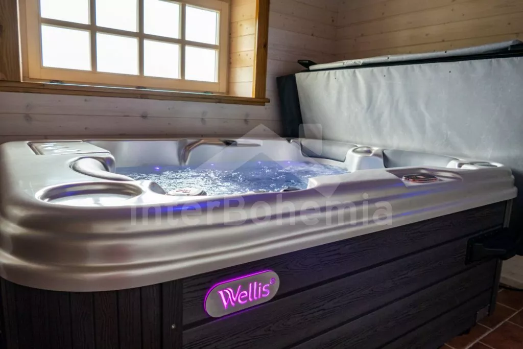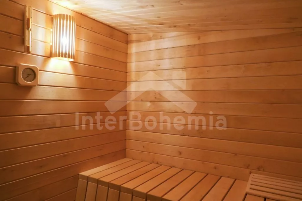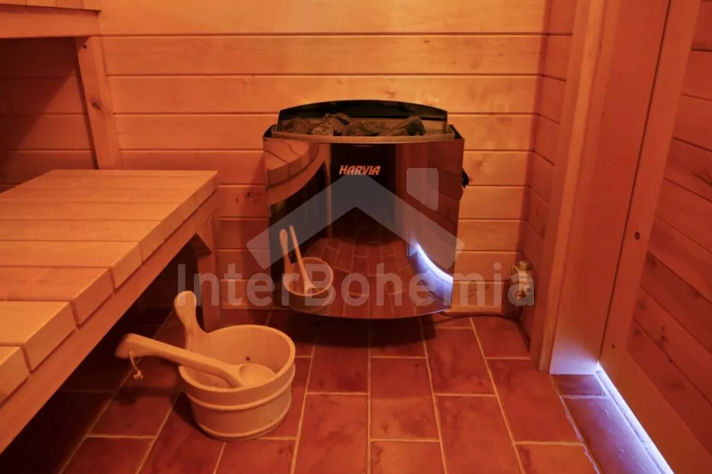V obývací části světnice prostorná sedací souprava s konferenčním stolkem a krbem. Na světnici navazuje první ložnice s dvoulůžkem a dětskou postýlkou. Dále první koupelna se sprchovým koutem, umyvadlem a toaletou, zařízená dětská herna (stolní fotbal), k dispozici wellness zóna se saunou a vířivkou (zahrnuto v ceně).