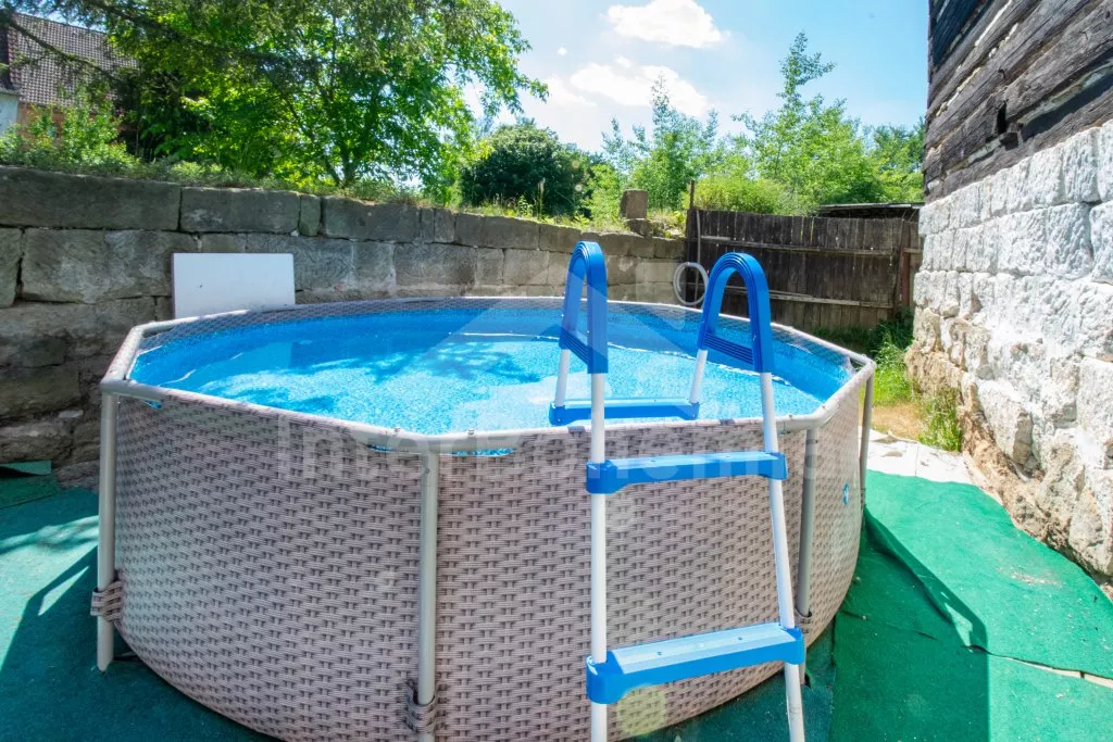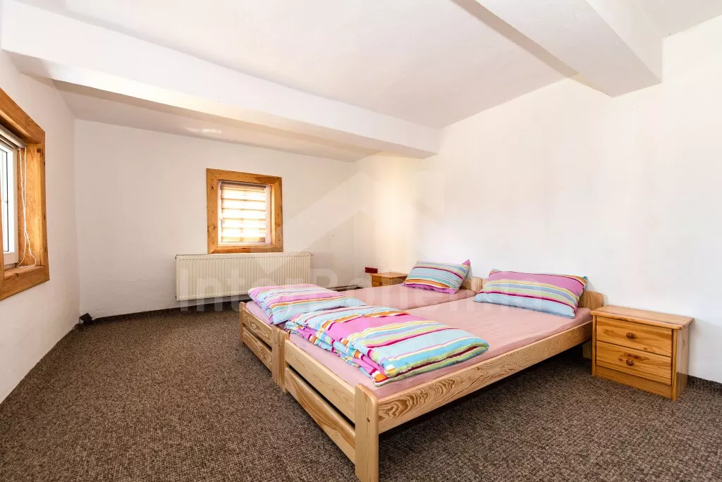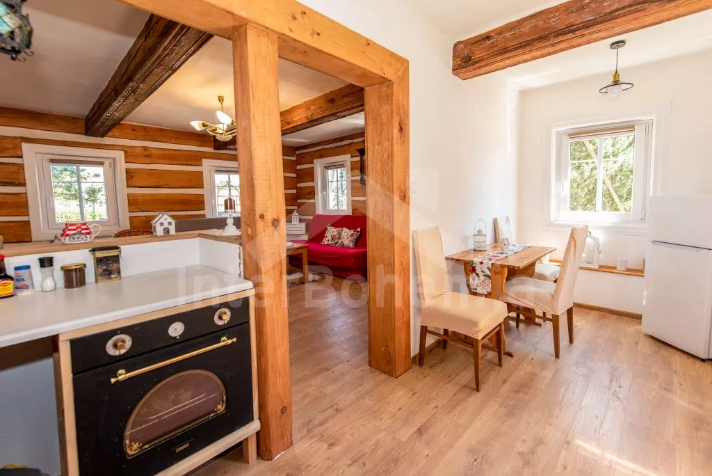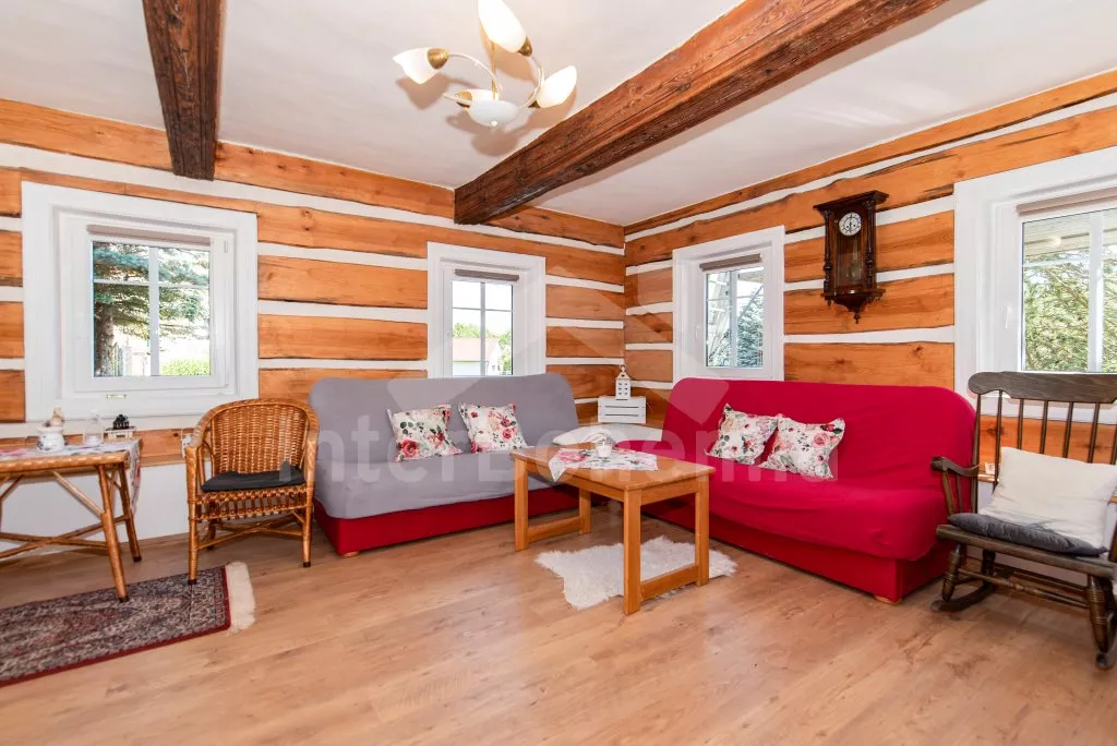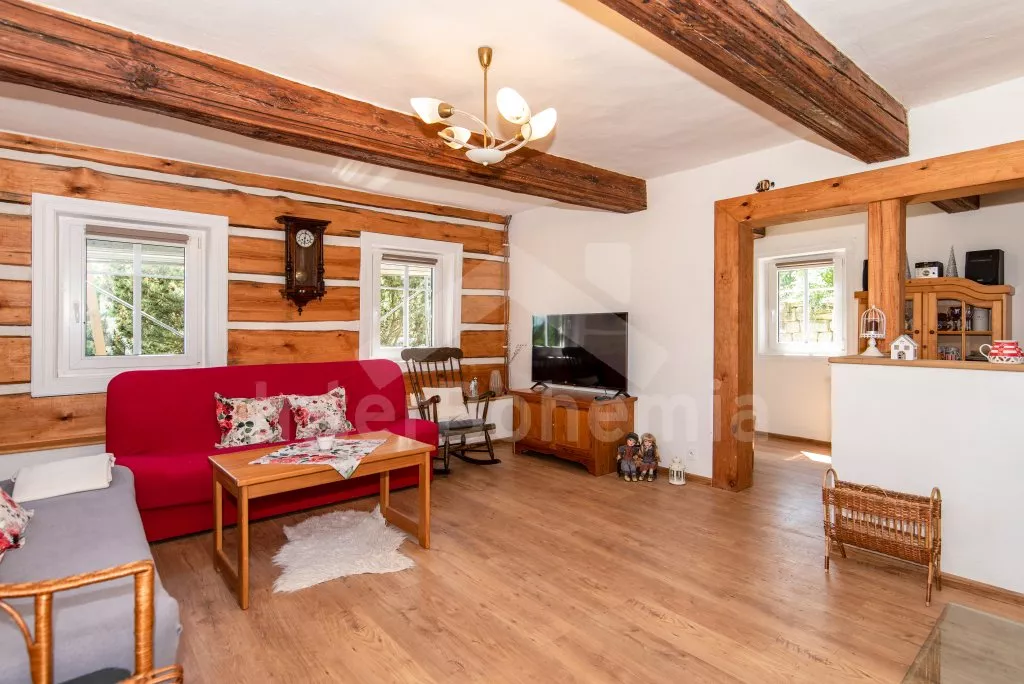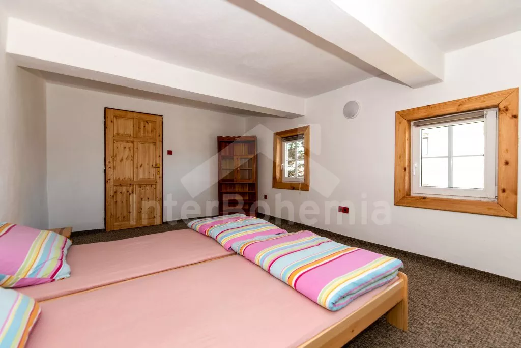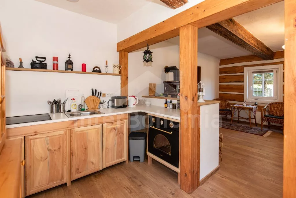 Typická staročeská roubenka, po celkové vnitřní rekonstrukci v roce 2021. Obývací pokoj se sedací soupravou (2x rozkládací lůžko), krbovými kamny, ratanovým posezením a LCD televizí. Kuchyně se sklokeramickou varnou deskou, troubou, mikrovlnnou troubou, rychlovarnou konvicí, topinkovačem, lednicí, mrazákem a menším posezením. Koupelna se sprchovým koutem, umyvadlem a pračkou. Samostatné WC. V podkroví dvě ložnice, obě s dvoulůžkem. Balkon s posezením. Na částečně oplocené zahradě k dispozici nadzemní bazén a venkovní posezení se zahradním grilem. Možnost uzamykatelné úschovy kol v dílně. Parkování možné před objektem, nebo v oploceném dvoře.