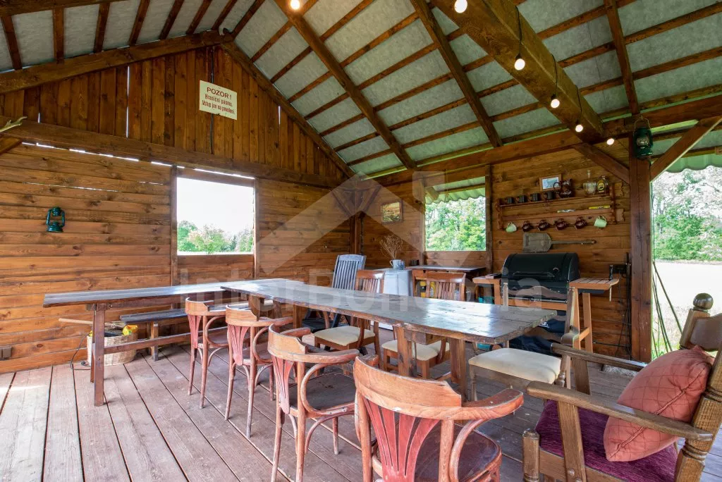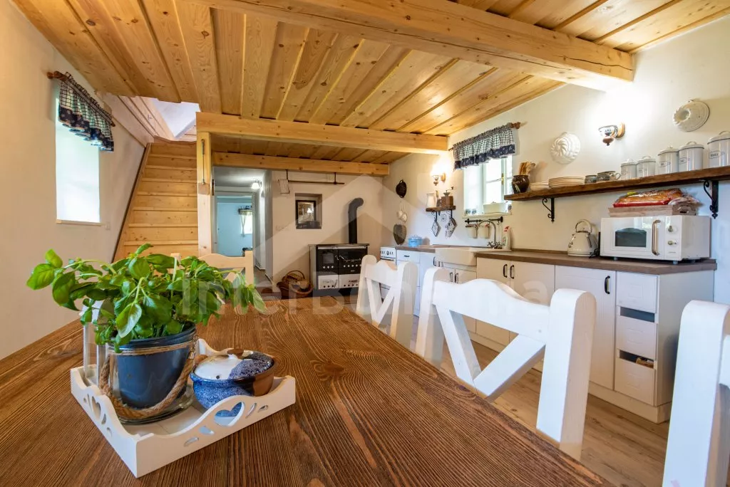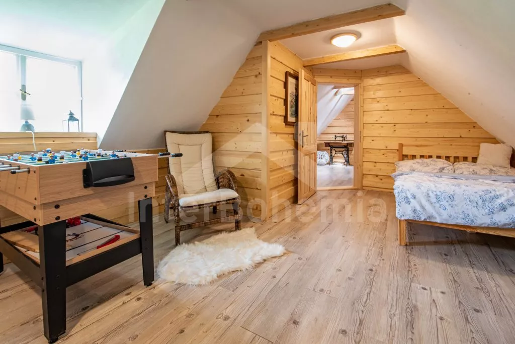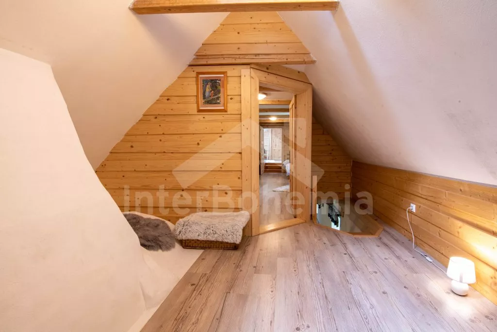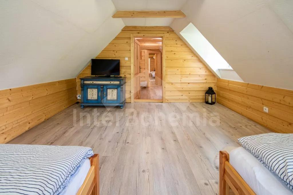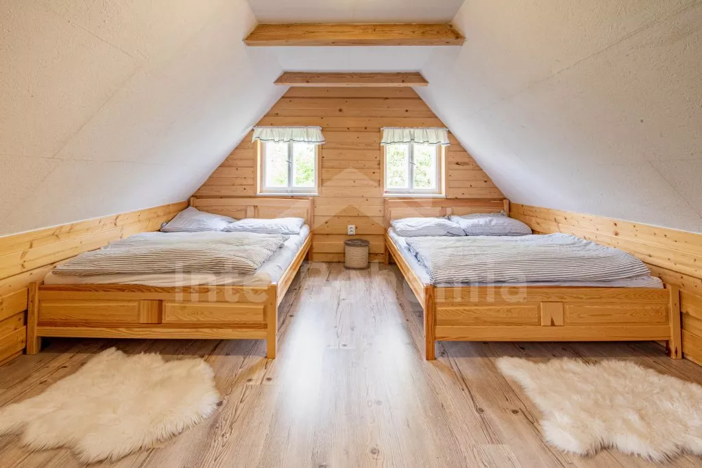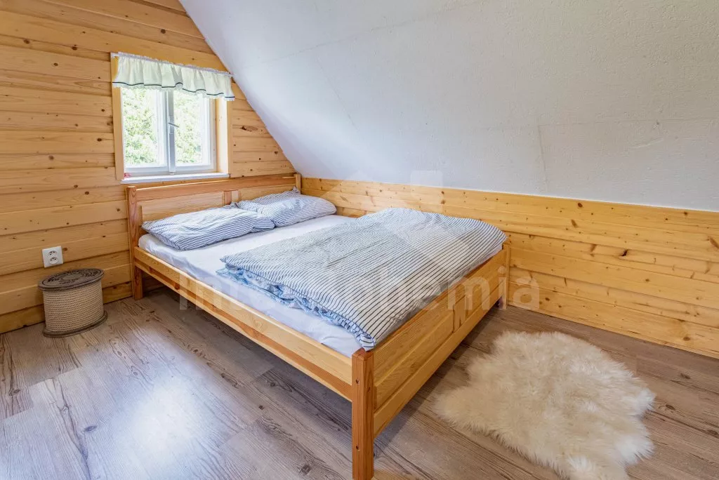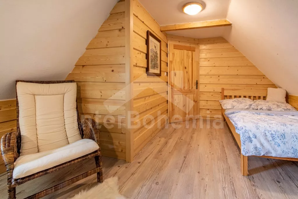 Moderně vybavená chalupa po rekonstrukci v roce 2022. Ideálním místem pro spřátelené rodiny s dětmi, které hledají klidné místo v blízkosti přírody. Prostorná kuchyně s jídelním stolem, lednicí s mrazákem, sporákem na tuhá paliva, troubou, sklokeramickou deskou, mikrovlnnou troubou, rychlovarnou konvicí a veškerým vybavením na vaření. Ložnice s 2x rozkládací pohovkou, TV a krbovými kamny. V přízemí koupelna se sprchou, umyvadlem, WC a pračkou. V podkroví ložnice s 2x dvoulůžkem a televizí. Třetí ložnice s 3x dvoulůžkem, křeslem, stolním fotbálkem a vstupem do koupelny s vanou, umyvadlem a toaletou. Objekt je vytápěn kamny. Zahrada s příjemným posezením pod pergolou vybavenou plynovým grilem, menší lednicí a hamakou. K dispozici ohniště s posezením a výhledem do okolní přírody. Toaleta se vstupem ze zahrady. Částečně zapuštěný bazén s průměrem 5 m a pro děti je připraveno „Orlí hnízdo“ - bunkr na stromě s posezením. Parkování na rozlehlém pozemku.