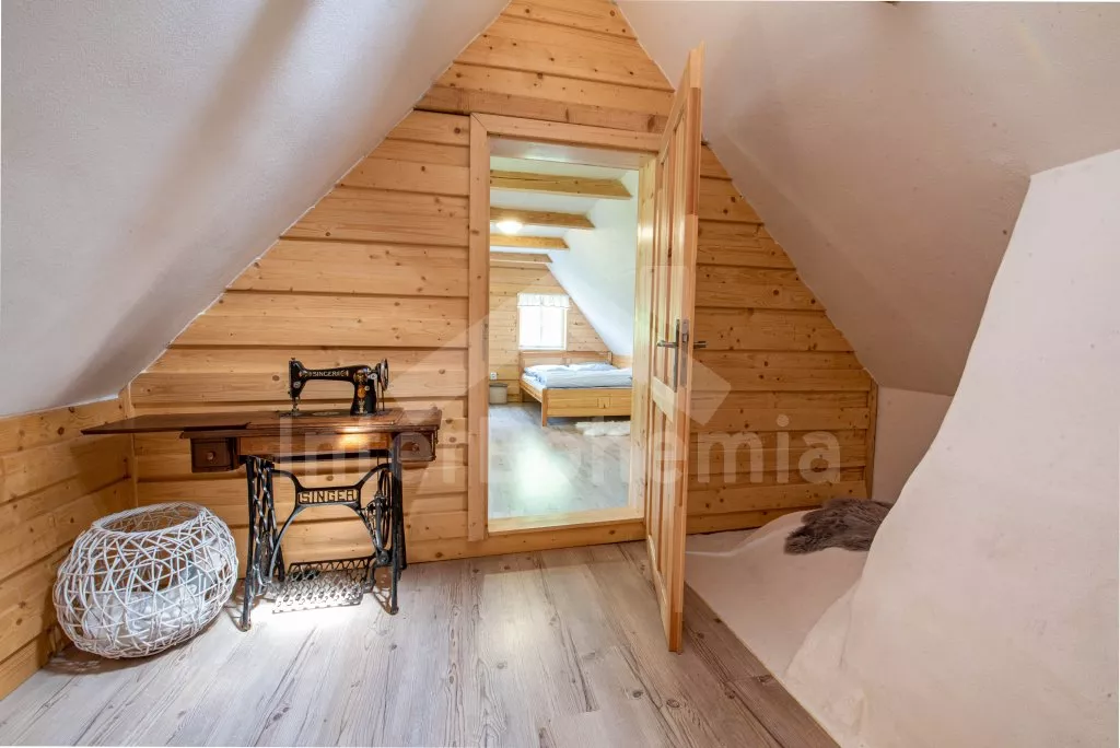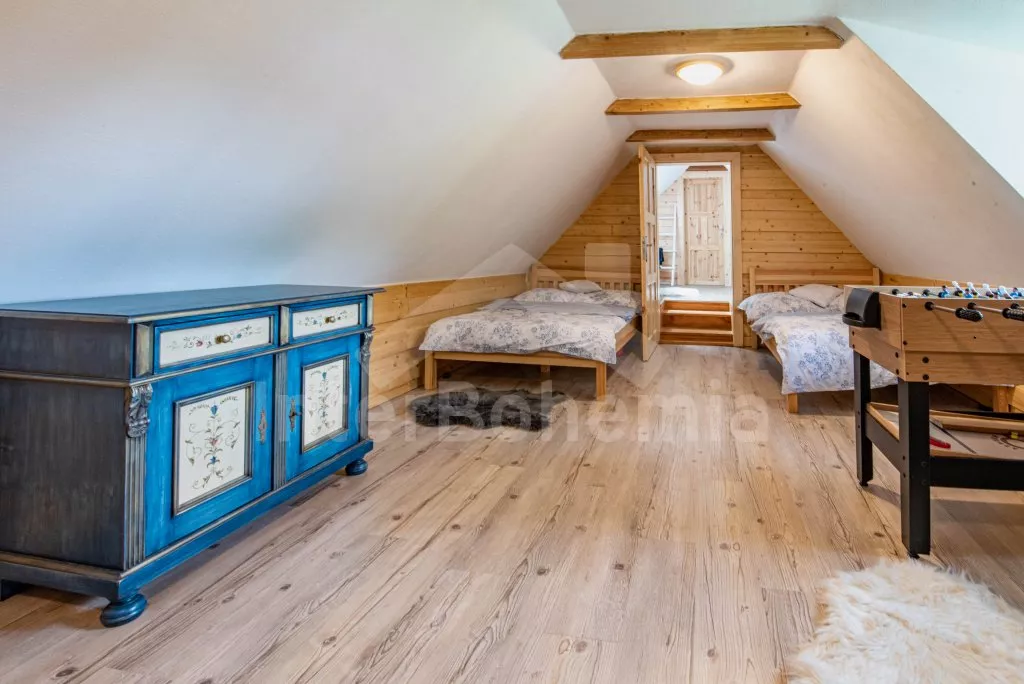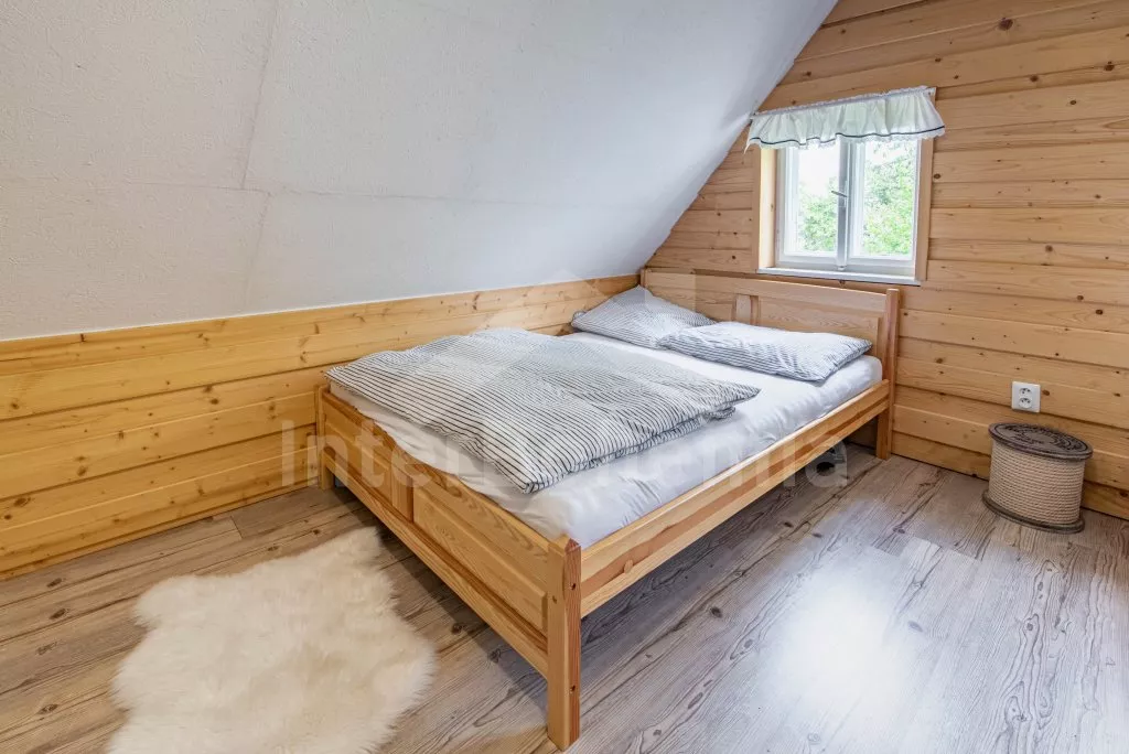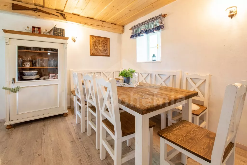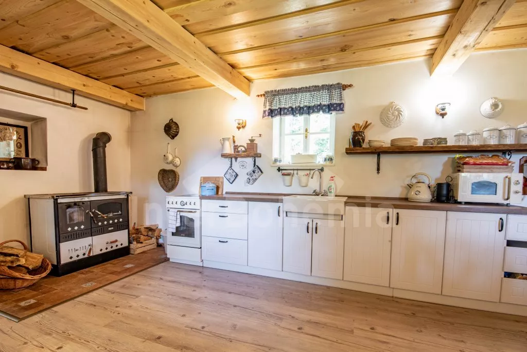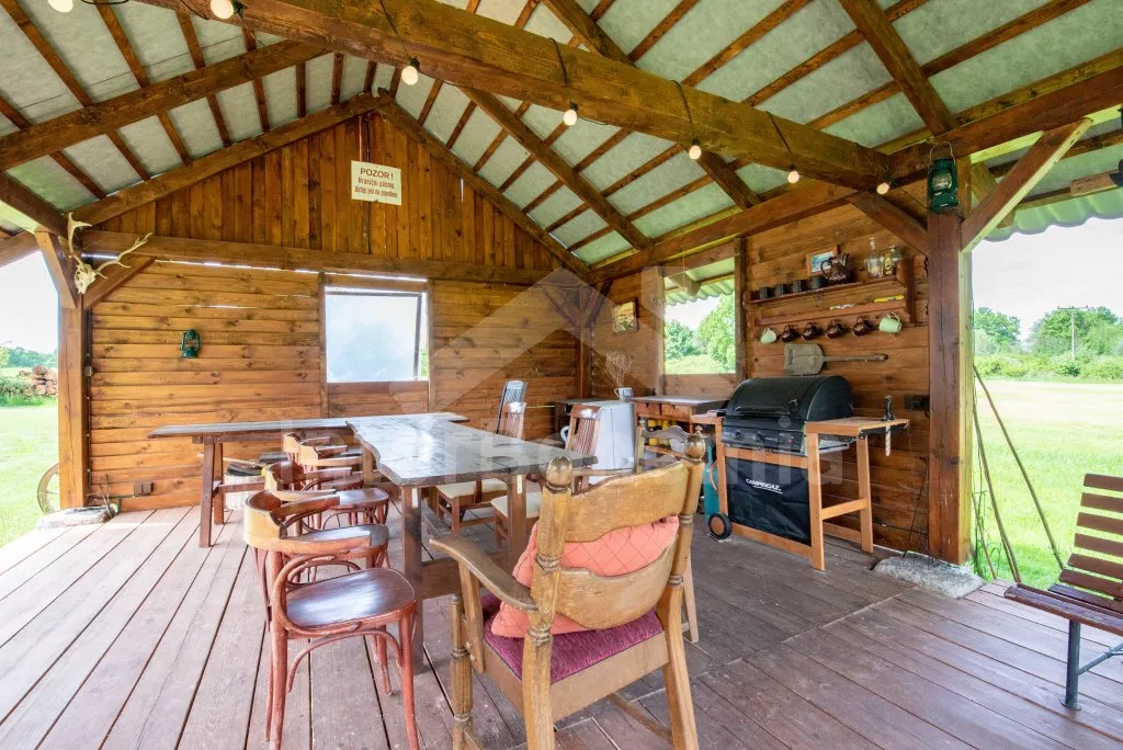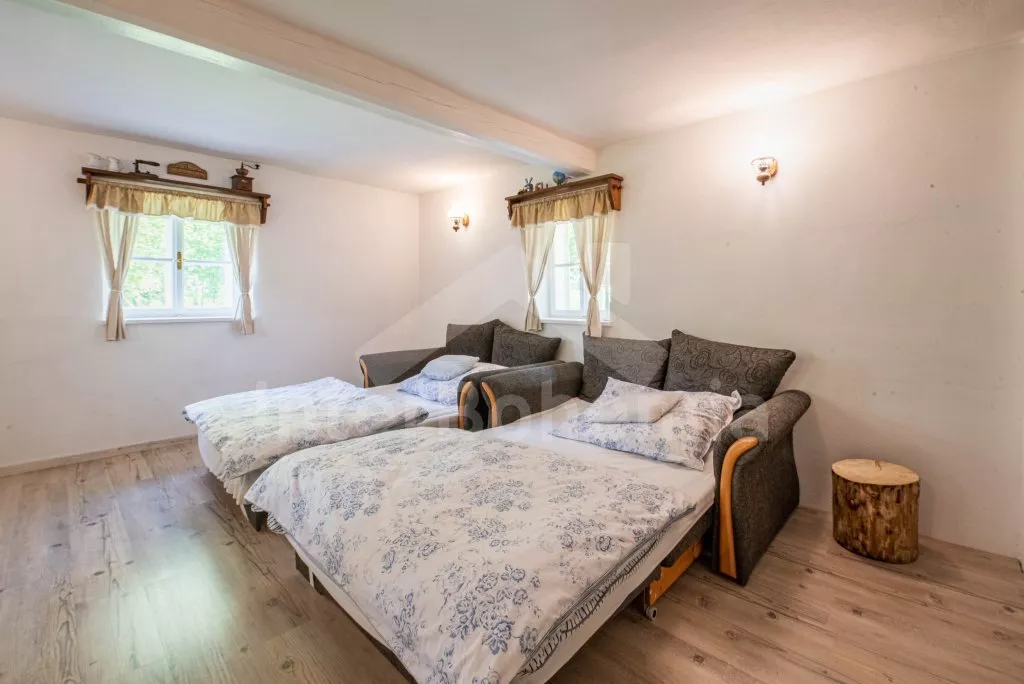 Moderně vybavená chalupa po rekonstrukci v roce 2022. Ideálním místem pro spřátelené rodiny s dětmi, které hledají klidné místo v blízkosti přírody. Prostorná kuchyně s jídelním stolem, lednicí s mrazákem, sporákem na tuhá paliva, troubou, sklokeramickou deskou, mikrovlnnou troubou, rychlovarnou konvicí a veškerým vybavením na vaření. Ložnice s 2x rozkládací pohovkou, TV a krbovými kamny. V přízemí koupelna se sprchou, umyvadlem, WC a pračkou. V podkroví ložnice s 2x dvoulůžkem a televizí. Třetí ložnice s 3x dvoulůžkem, křeslem, stolním fotbálkem a vstupem do koupelny s vanou, umyvadlem a toaletou. Objekt je vytápěn kamny. Zahrada s příjemným posezením pod pergolou vybavenou plynovým grilem, menší lednicí a hamakou. K dispozici ohniště s posezením a výhledem do okolní přírody. Toaleta se vstupem ze zahrady. Částečně zapuštěný bazén s průměrem 5 m a pro děti je připraveno „Orlí hnízdo“ - bunkr na stromě s posezením. Parkování na rozlehlém pozemku.