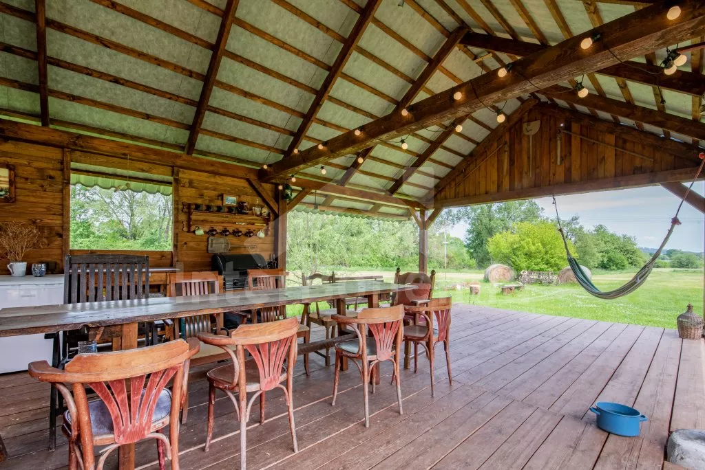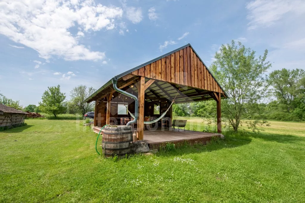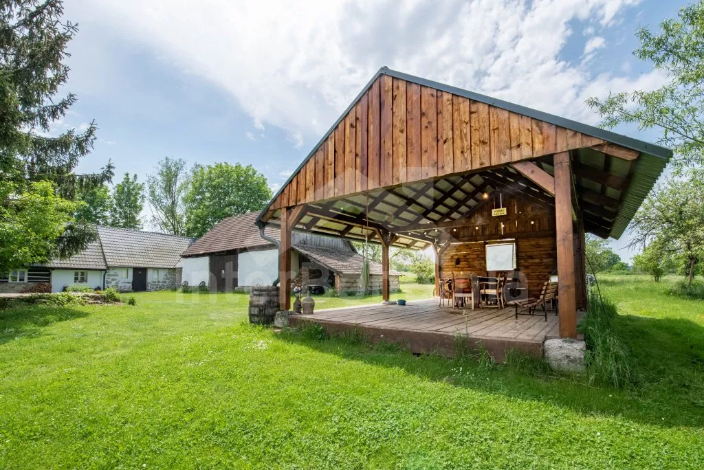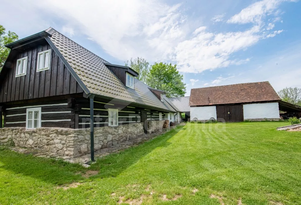 Roubená chalupa na samotě s vlastním bazénem a zastřešenou pergolou.