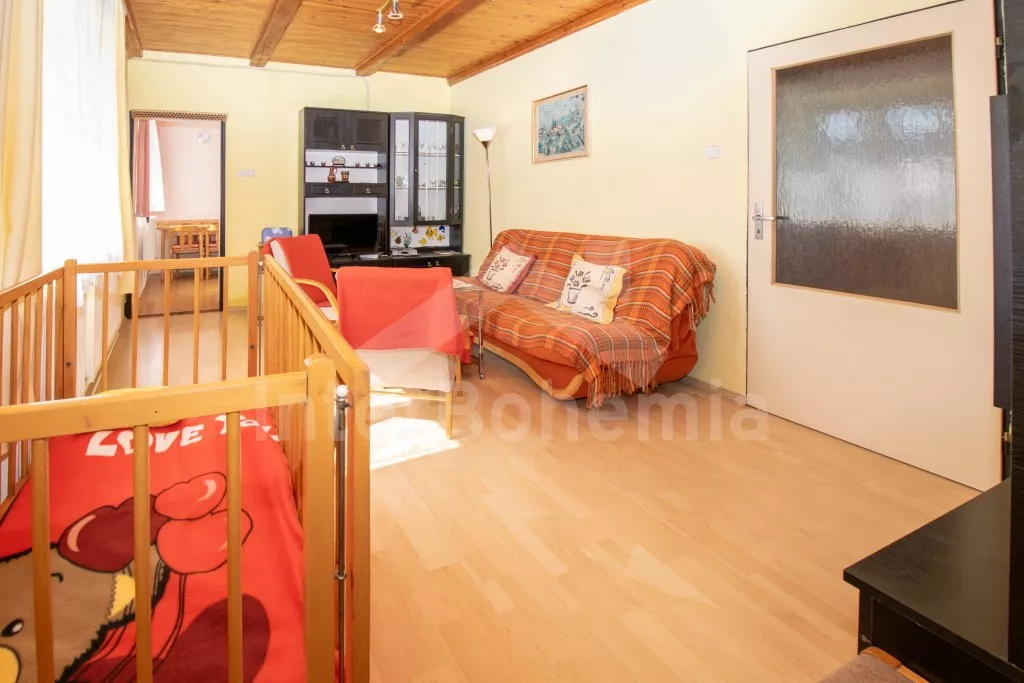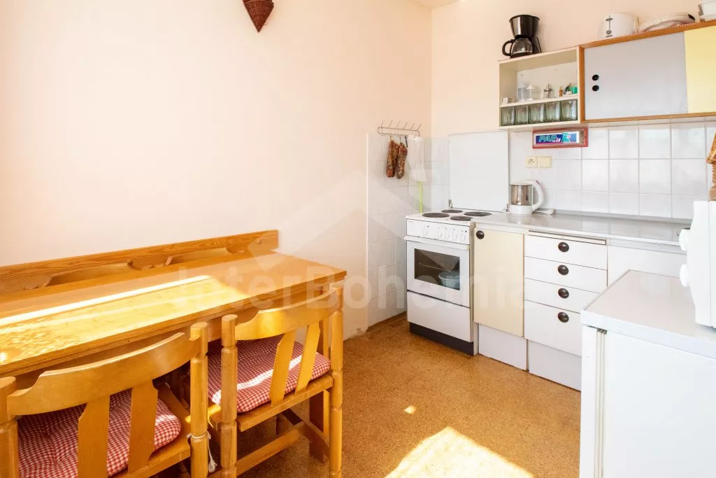 Hosté obývají pravou část tohoto zrenovovaného jihočeského statku, a to zcela samostatně, nepřijdou do kontaktu s žádným jiným obyvatelem domu a mají k dispozici vlastní zahradu. Vstup, po několika schodech se vejde do chodby a haly, dále jsou již všechny místnosti na jedné úrovni. Obývací pokoj se sedací soupravou (zároveň rozkládací dvojlůžko), televizí se satelitním příjmem a DVD. Kuchyně s jídelním stolem, elektrickým sporákem se 4 varnými plotýnkami, lednicí, kávovarem, varnou konvicí, toustovačem, fritovacím hrncem a mikrovlnnou troubou. Hezká koupelna s vanou, samostatná toaleta. Ložnice s dvojlůžkem a přistýlkou. Elektrické vytápění. Zahrada s pergolou, k dispozici zahradní nábytek se slunečníkem, zahradní krb, houpací lavice a bazének pro děti o průměru 2 m bez filtrace. Vlastní parkoviště.