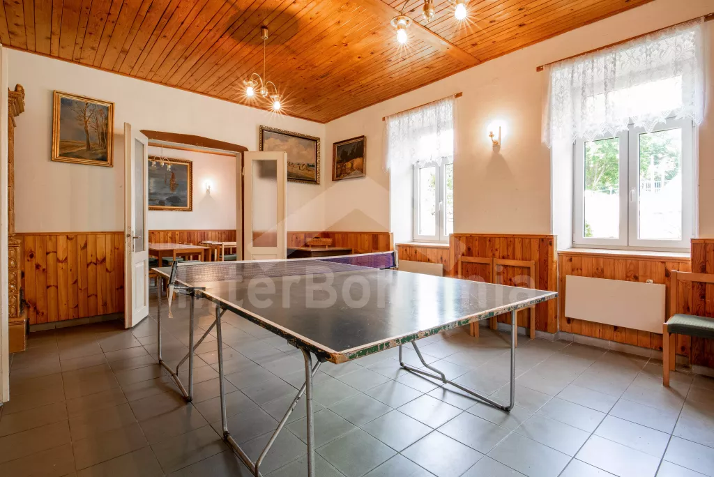 Begane grond: entré, gang, eetkamer / gezelschapsruimte met bar en haardkachel, eetkamer met tafels, stoelen en tegelkachel. Ruimte met tafeltennis. Grote keuken met o.a. twee elektrisch fornuizen, drie koelkasten, koffiezetapparaaten, waterkoker, frituurpan, magnetron en vaatwasser. Dames en heren toiletten.