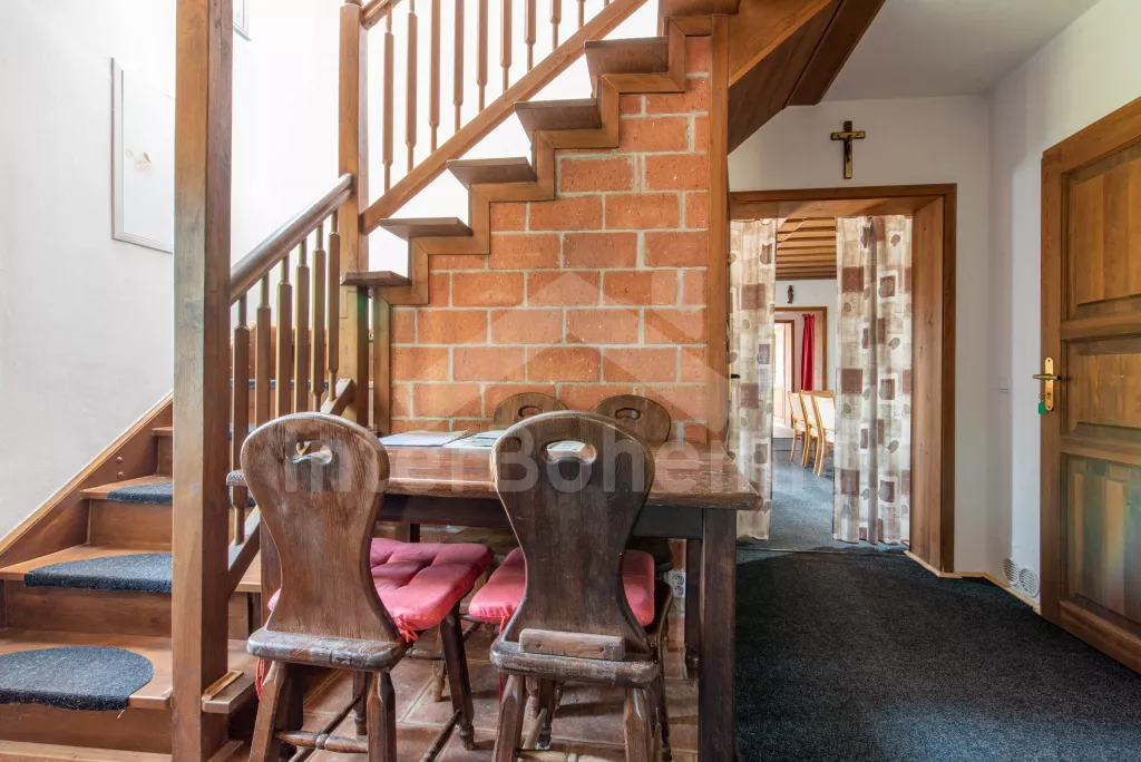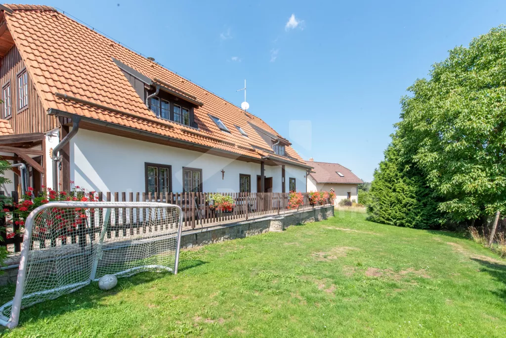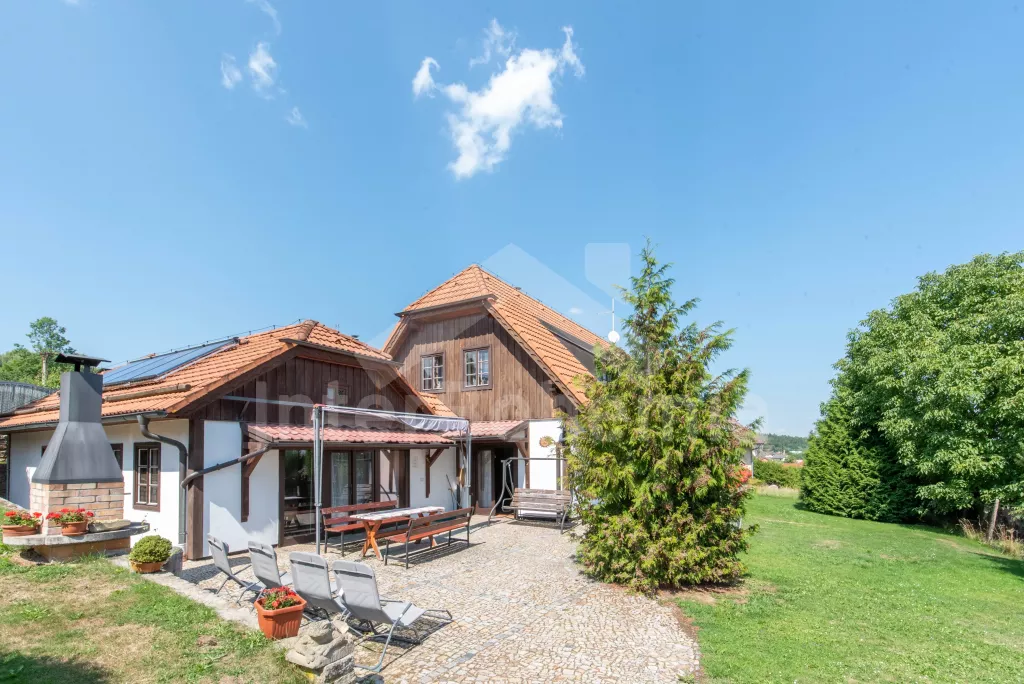 In zuid Bohemen, landelijk gelegen aan de rand van het dorpje Srnin, ca 3 km ten noordoosten van de historische stad Cesky Krumlov (monumentenzorg). De villa staat op een weide, op een flauwe helling, waarvandaan u fantastisch weids uitzicht heeft over het landschap. De omgeving biedt een scala aan mogelijkheden tot sportbeoefening, culturele en historische bezienswaardigheden en de mogelijkheid tot verscheidene activiteiten ondernemen. Het stadje Cesky Krumlov met romantische steegjes, vele restaurants en terrasjes, kasteel, unieke openluchttheater en alle faciliteiten op slechts 3 km afstand. Klooster Zlata Koruna 3 km, ruine Divci Kamen 6 km, uitzichtstoren op de berg Klet (1083 m) 10 km, burcht Rozmberk 20 km, de zuidboheemse metropool České Budejovice 19 km, kasteel Hluboka nad Vltavou, jachtkasteel Ohrada en dierentuin 25 km.