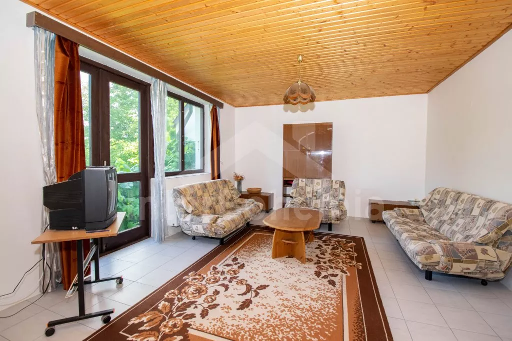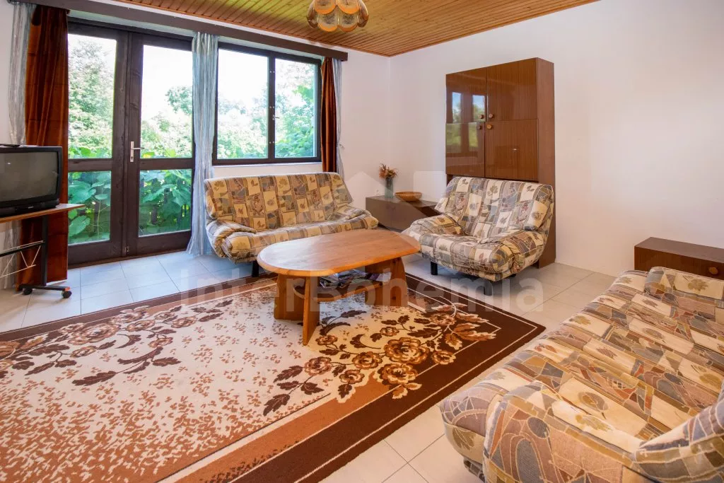 Vrijstaand huis van het type 2 onder 1 kap, in 2009 gerenoveerd, goed en gezellig ingericht met gebruik van veel hout in het interieur. Entrée, hal met trappenhuis. Op de eerste etage vindt u een gang, woonkamer met zithoek, satelliet TV en open toegang tot de eetkamer met eettafels voor 7 personen en deur naar het balkon. Keuken met electrisch fornuis, afzuigkap, en waterkoker. Kleine badkamer met douche en toilet. Boven is een gang, tweede badkamer met ligbad en toilet en drie slaapkamers – twee met twee éénpersoons bedden en derde slaapkamer met een tweepersoons en een éénpersoons bed. CV op kolen en hout (de stookruimte is in het souterrain en de verhuurder stookt). Buitenbubbelbad. Netjes onderhouden tuin met vijver (niet omheind). U beschikt over tuinmeubelen en barbecue. Parkeren bij het huis op een deels omheind trrein.