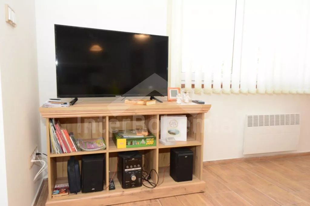 Op de begane grond is er een apart appartement met een eigen ingang. De woonkamer is verbonden met een kitchenette. Keuken met elektrisch fornuis en oven, koelkast, waterkoker en servies. In de woonkamer is een zithoek (tevens uitklapbaar bed voor 2 personen) en een extra bed. Badkamer met douche, wastafel en toilet.