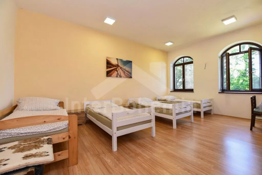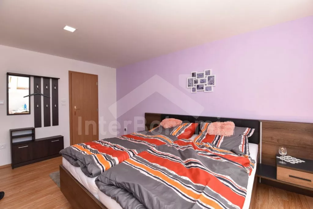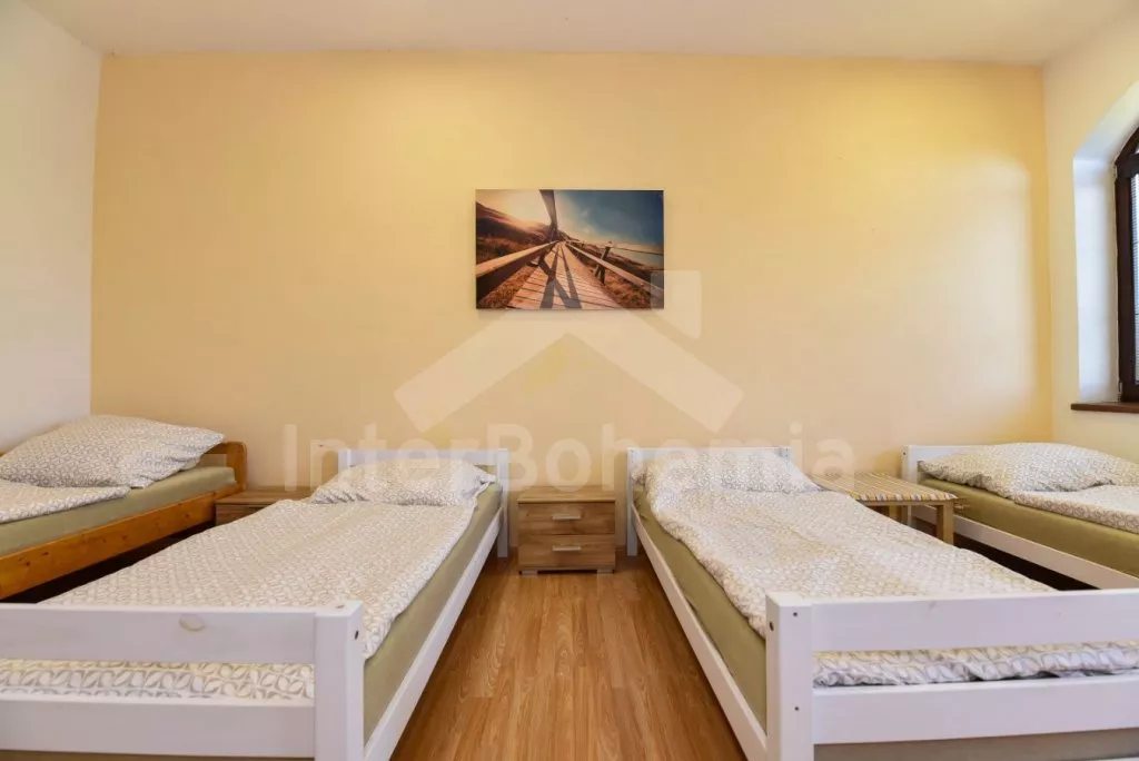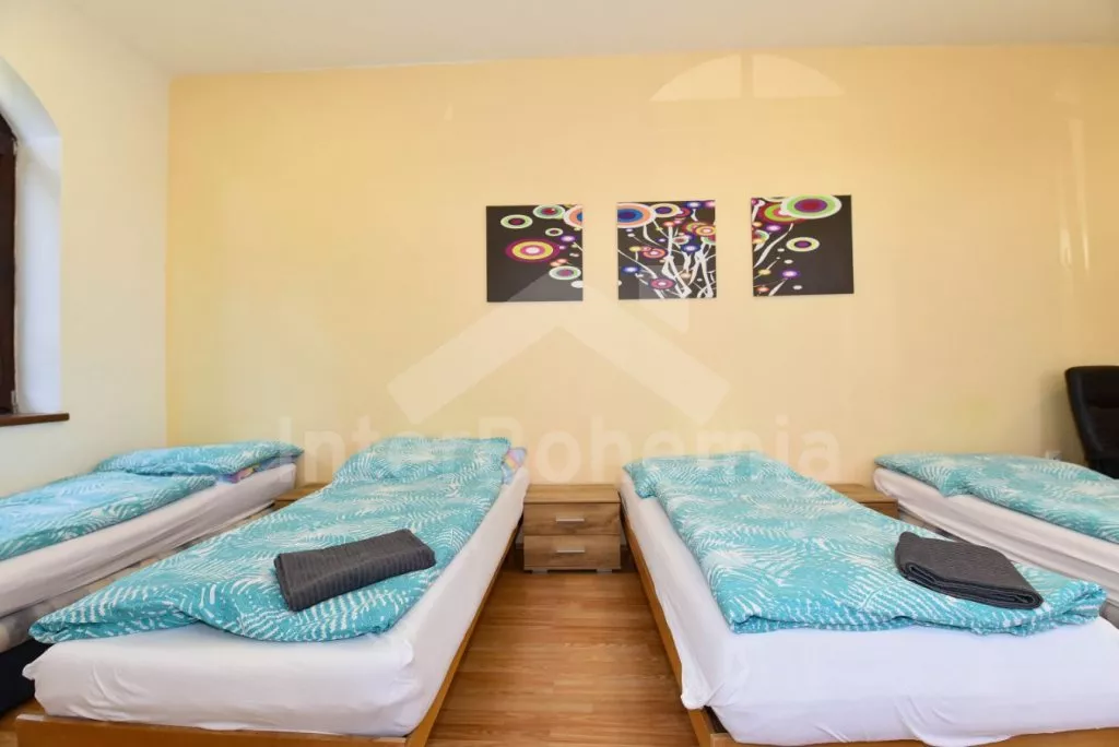 Volně stojící vila na vlastní oplocené zahradě, po rekonstrukci v roce 2019. Vstup, prostorná centrální hala, ze které je přístup do čtyř samostatných pokojů. První tři pokoje v přízemí jsou shodně vybaveny každý čtyřmi jednolůžky, stolem a LCD televizí. V přízemí dále společná kuchyně s dvouplotýnkovým elektrickým vařičem, mikrovlnnou troubou, lednicí s mrazákem, kávovarem (espresso), rychlovarnou konvicí a nádobím. Koupelna se sprchovým koutem, umyvadlem a samostatným WC. Druhé samostatné WC. po schodech v podkroví čtvrtý pokoj s dvoulůžkem, stolem, LCD televizí a samostatnou koupelnou se sprchovým koutem, umyvadlem a WC. Vytápění pokojů elektrickými přímotopy. Hosté mají k dispozici oplocenou zahradu, zahradní posezení, přenosný gril a ohniště. Parkování na uzavřené zahradě pro 5 automobilů.