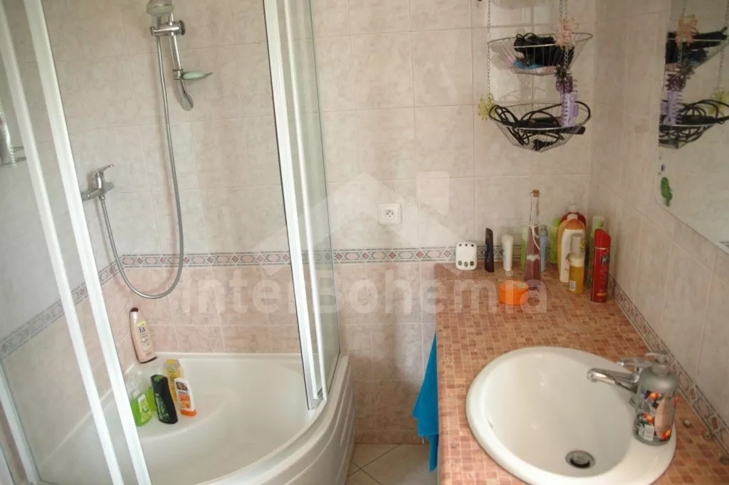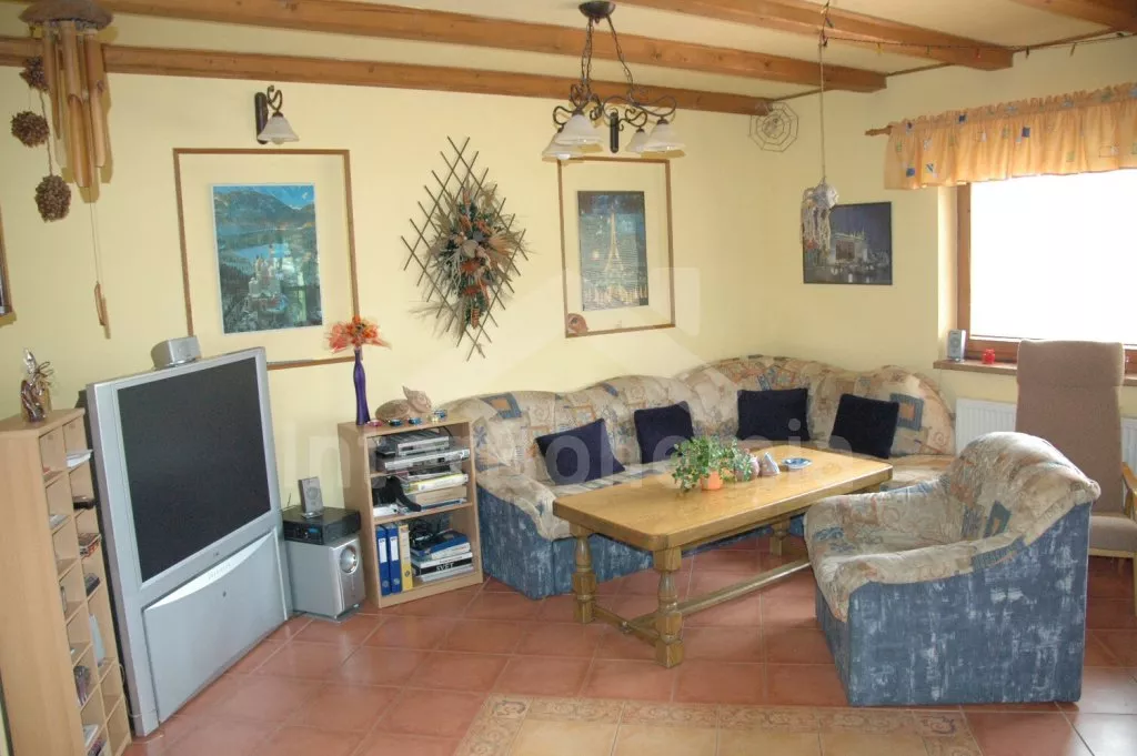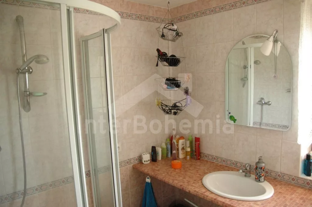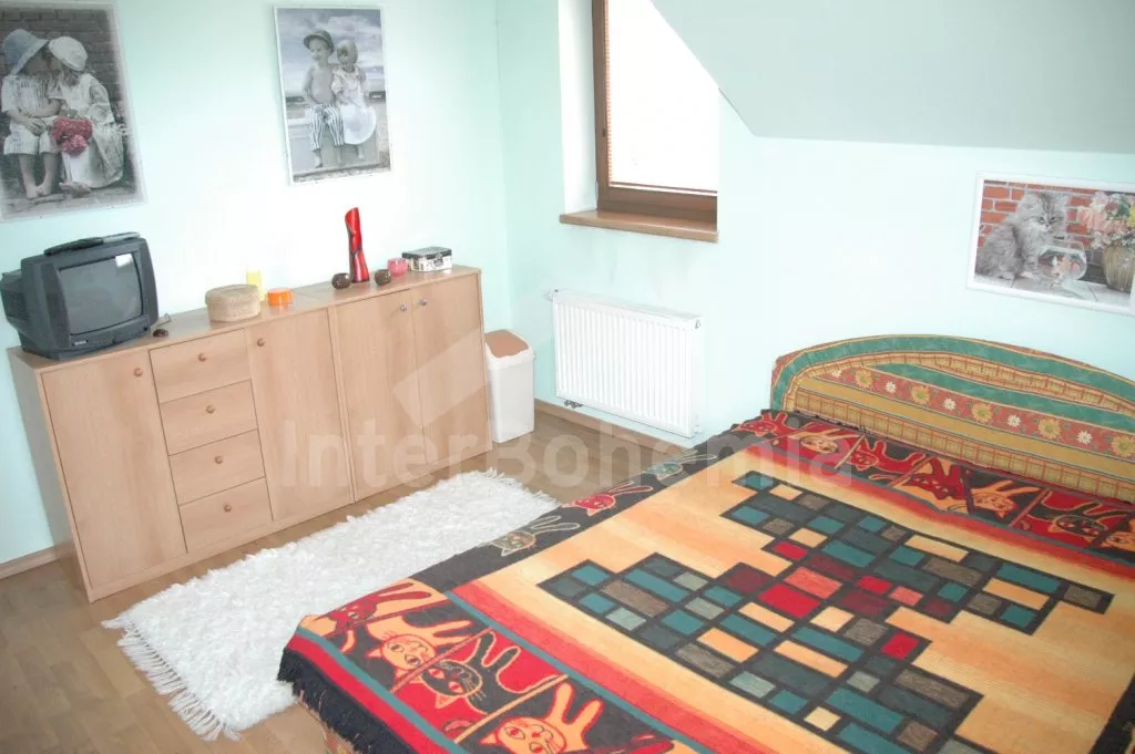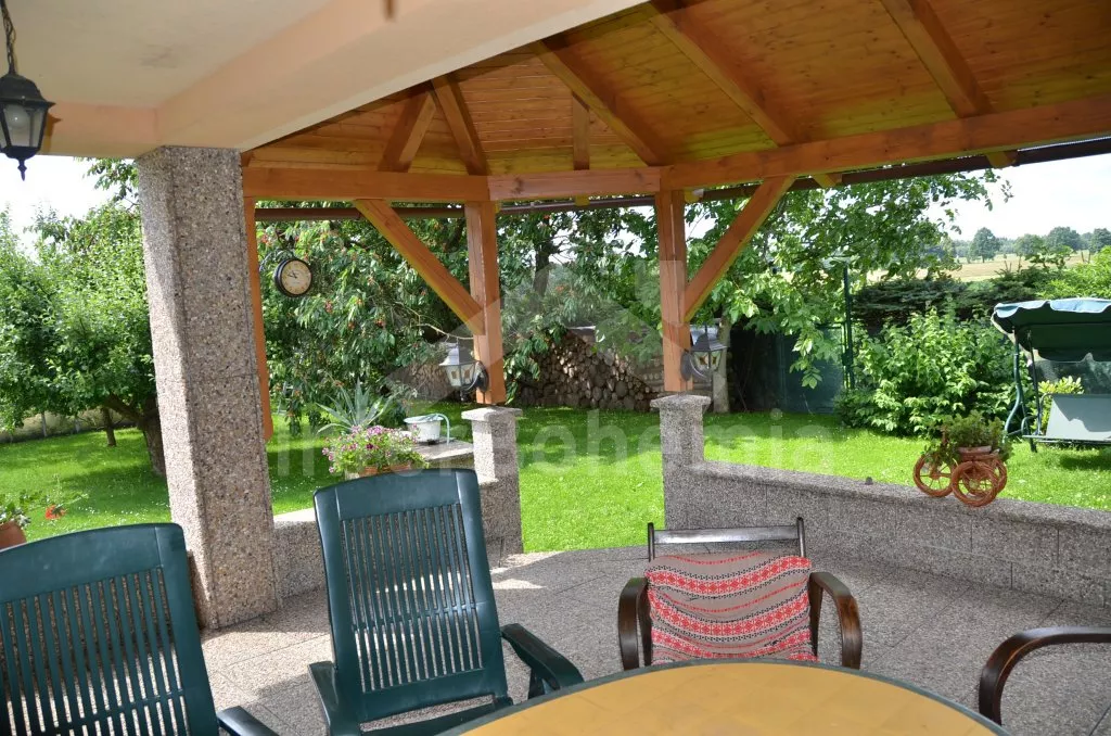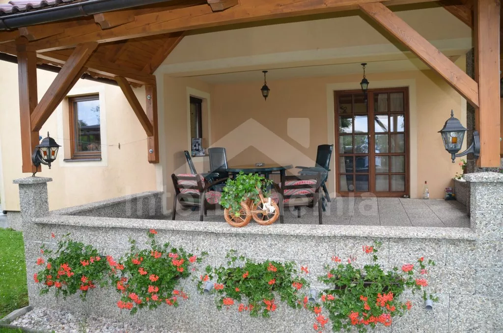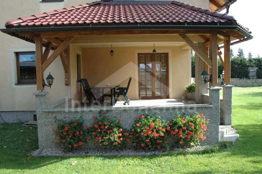 Volně stojící vila, postavená v roce 2006, velmi dobře a pohodlně zařízená a vybavená veškerými vymoženostmi. Vchod, hala, prostorný obývací pokoj se sedací soupravou, krbem, velkoplošnou digitální televizí s DVD a vstupem na zastřešenou terasu se zahradním nábytkem. Luxusní otevřená kuchyně s elektrickým sporákem s keramickou varnou deskou a horkovzdušnou troubou, digestoří, lednicí s mrazákem, espresomatem, varnou konvicí a mikrovlnnou troubou. Koupelna se sprchou, samostatná toaleta. V podkroví se nachází hala, druhé samostatné WC a dvě ložnice. První ložnice s dvojlůžkem a druhá ložnice s dvojlůžkem a jedním samostatným lůžkem. Vytápění krbem, v koupelně elektrické podlahové topení. Velká oplocená zahrada, k dispozici je zahradní nábytek, přenosný zahradní gril, houpací lavice, pískoviště a dětská houpačka. Vlastní zastřešené stání pro dva menší vozy u domu.