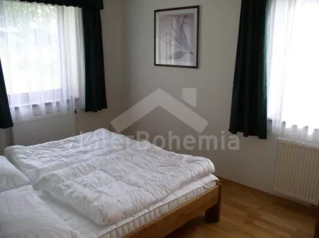 Typ: „Nová Bystřice“. Volně stojící, luxusní vila, velmi pohodlně zařízená. Obytná plocha 113 m2. Obývací pokoj se sedací soupravou, jídelním koutem, plynovým krbem, televizí se satelitním příjmem a přístupem na terasu. Oddělená kompletně zařízená kuchyně se spíží (keramická varná deska, trouba, digestoř, lednice s mrazákem Bosch, myčka na nádobí Bosch, mikrovlnnná trouba, kávovar, varná konvice, kuchyňské nádobí, sklo, porcelán). Dvě ložnice – každá s dvojlůžkem. Koupelna s vanou a samostatná toaleta. Ústřední plynové topení, v koupelnách podlahové. Terasa 54 m2. K dispozici zahradní nábytek a zastřešené stání pro auto. Za poplatek možno zapůjčit gril.