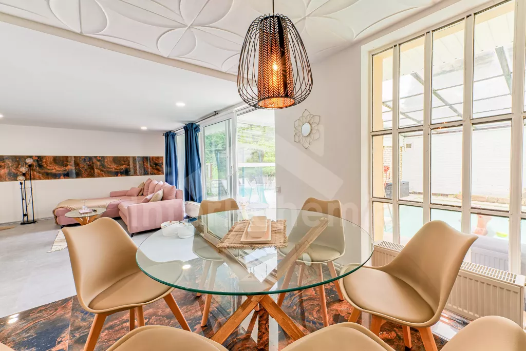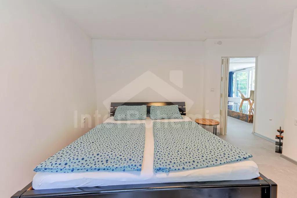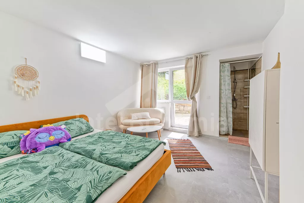 Volně stojící vila, velmi hezky a komfortně zařízená, s prostorným ubytováním na jedné úrovni. Vstup přes verandu, hala s posezením a vstupem na samostatné WC, obývací pokoj se sedací soupravou (extra lůžko pro 1 osobu), televizí se satelitním příjmem, jídelním stolem a vstupem k vnitřnímu bazénu a na terasu. Kuchyně se sporákem se sklokeramickou deskou, horkovzdušnou troubou, plynovým dvouvařičem, lednicí, myčkou na nádobí a varnou konvicí. Ložnice s dvoulůžkem, vlastní sprchou a vstupem na terasu. Druhá ložnice také s dvoulůžkem, vlastní sprchou a vstupem na terasu. Třetí ložnice s dvěma jednolůžky a francouzskými dveřmi, sousedící s koupelnou s umyvadlem, bidetem a bazénkem. Elektrické topení. Vnitřní bazén sousedící s obývacím pokojem a velkou venkovní terasou má rozměry 6 x 4 m a hloubka 0,7 – 1,2 m (bez výhřevu). Terasa se zahradním nábytkem, lehátky a venkovním krbem. Zahrada je oplocená a vlastní parkoviště pro 1 automobil (další automobily je možné parkovat na veřejném parkovišti vzdáleném 20 m od objektu). K dispozici je garáž jako úschova kol. Objekt je vhodný pro maximálně 6 osob.