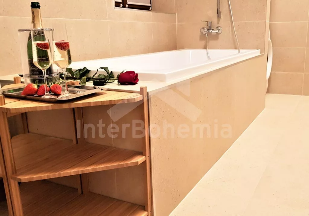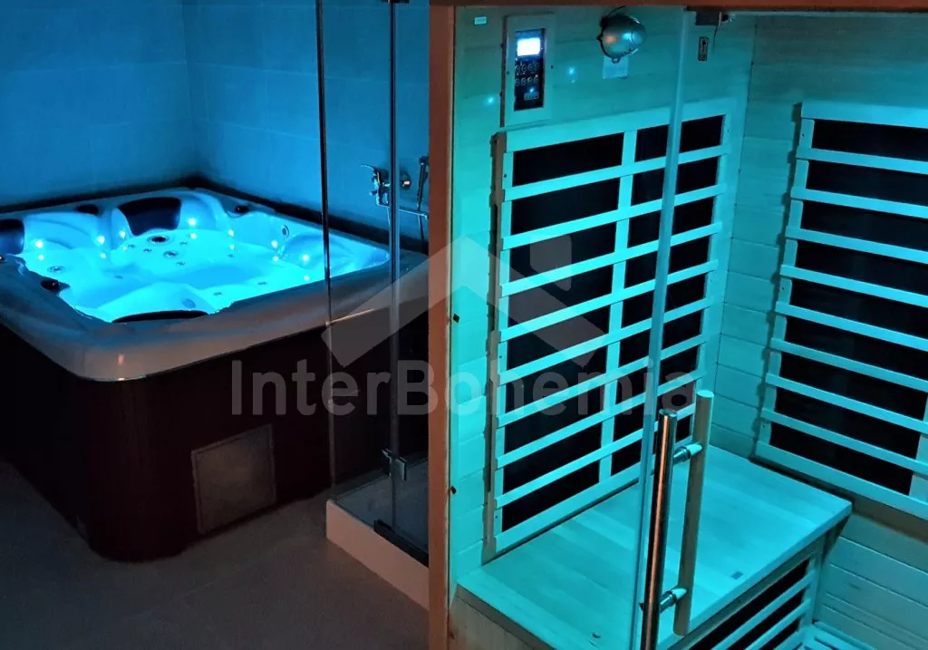 Obývací místnost s jídelním stolem, velkou sedací soupravou (extra dvoulůžko), nástěnnou televizí se satelitem a krbem. Pro zpestření tu na hosty čeká kulečník, šipky a herní konzole. Plně vybavená kuchyňská linka s indukční varnou deskou, troubou, mikrovlnnou troubou, dvoukřídlou lednicí s mrazákem, kávovarem, toustovačem, topinkovačem, rychlovarnou konvicí a myčkou na nádobí. První ložnice s dvoulůžkem, druhá se dvěma jednolůžky a třetí ložnice s dvoulůžkem a LCD televizí. Možnost dvou dalších přistýlek. Koupelna se sprchovým koutem, vanou, pračkou, sušičkou a WC. Wellness místnost s vířivkou, saunou, druhou sprchou, druhým WC a nástěnnou televizí. Vytápění objektu krbem. K dispozici částečně oplocená zahrada s grilem a trampolínou. Parkování u objektu.