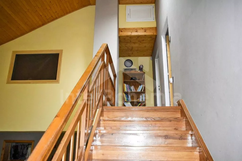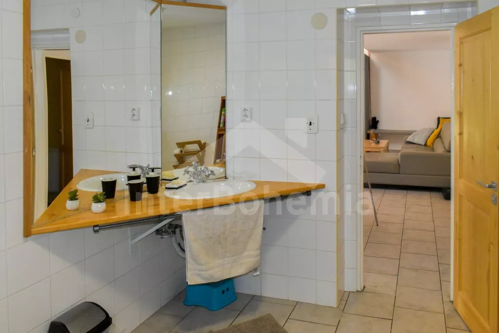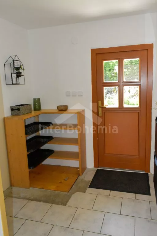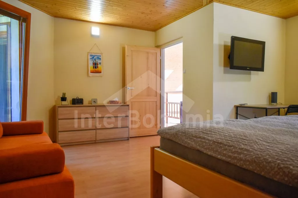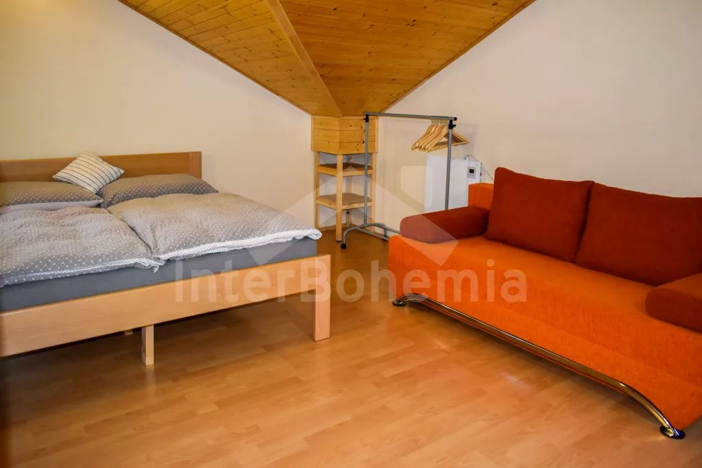 Samostatně stojící vila na vlastní oplocené zahradě, renovovaná v roce 2013. Vstup, centrální obývací místnost spojená s kuchyní. Kuchyňská linka s elektrickým sporákem, troubou, mikrovlnnou troubou, americkou lednicí s mrazákem, kávovarem, toustovačem (3in1 na wafle), rychlovarnou konvicí, nádobím a myčkou na nádobí. V obývacím pokoji jídelní stůl pro 8 osob, sedací souprava s konferenčním stolkem, LCD televize a krb. Po schodech v podkroví jsou 3 ložnice, první s dvoulůžkem, televizí a rozkládací pohovkou (přistýlka pro 1 osobu), druhá s dvoulůžkem, televizí a rozkládacím křeslem (přistýlka pro 1 osobu), třetí ložnice s jedním dvoulůžkem. V přízemí se nacházejí 2 koupelny, první s vanou, umyvadlem a wc, druhá se sprchovým koutem, umyvadlem, samostatným wc a pračkou. Vytápění objektu skrze tepelné čerpadlo a lokálně krbem.