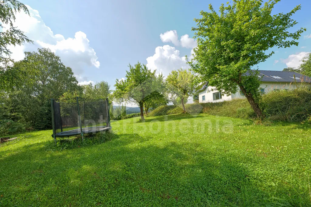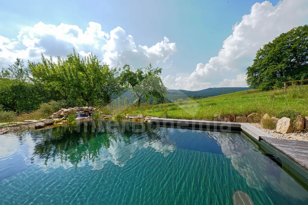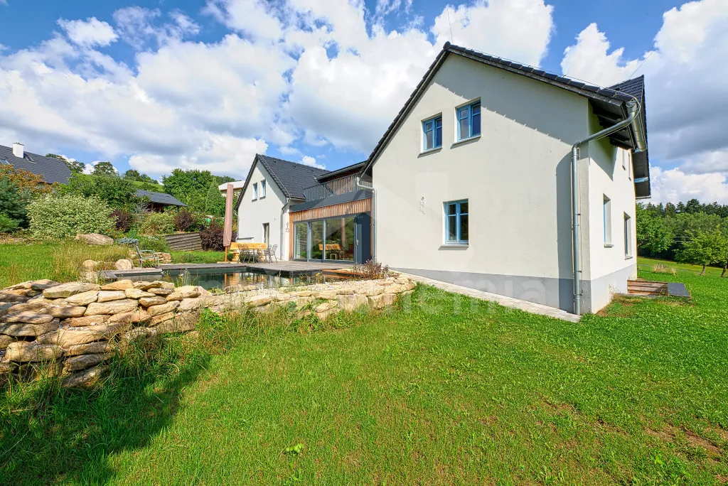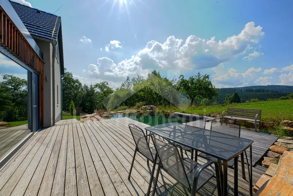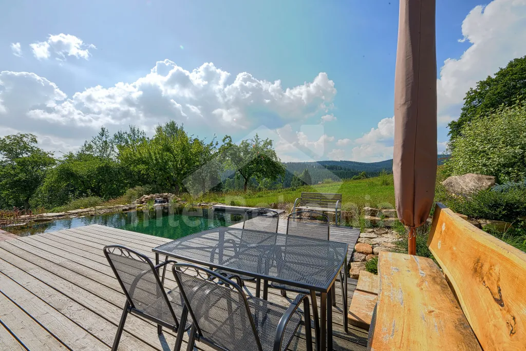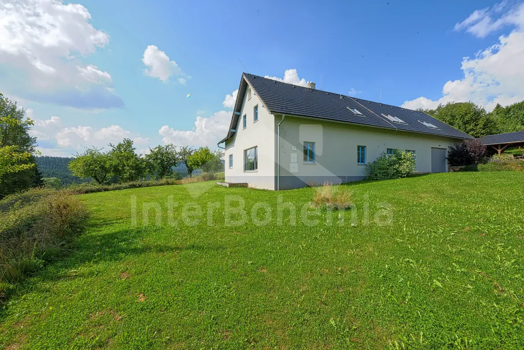 Nový a moderně vybavený dům, s průzračným koupacím jezírkem a terasou s výhledem do přírody. Pohodová společenská místnost s plnohodnotnou a kompletně vybavenou kuchyňskou linkou s lednicí a velkým jídelním stolem. Designová pohovka a velká LED TV. Ze společenské místnosti vstup přímo na slunečnou terasu s posezením a výhledem do luk a lesů. Ubytování ve třech apartmánových pokojích s vlastními vchody. První pokoj s dvoulůžkem a jednolůžkem. Druhý pokoj s dvoulůžkem a plnohodnotnou přistýlkou. Třetí s dvoulůžkem. K dispozici dětská postýlka. Koupelna se sprchovým koutem, umyvadlem a WC. Na zahradě koupací jezírko, venkovní pergola s grilem a posezením, ohniště a trampolína. K dispozici sauna za příplatek, kolárna (lyžárna) s druhým WC. Parkování přímo u objektu.