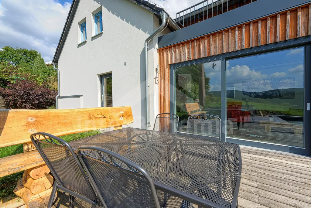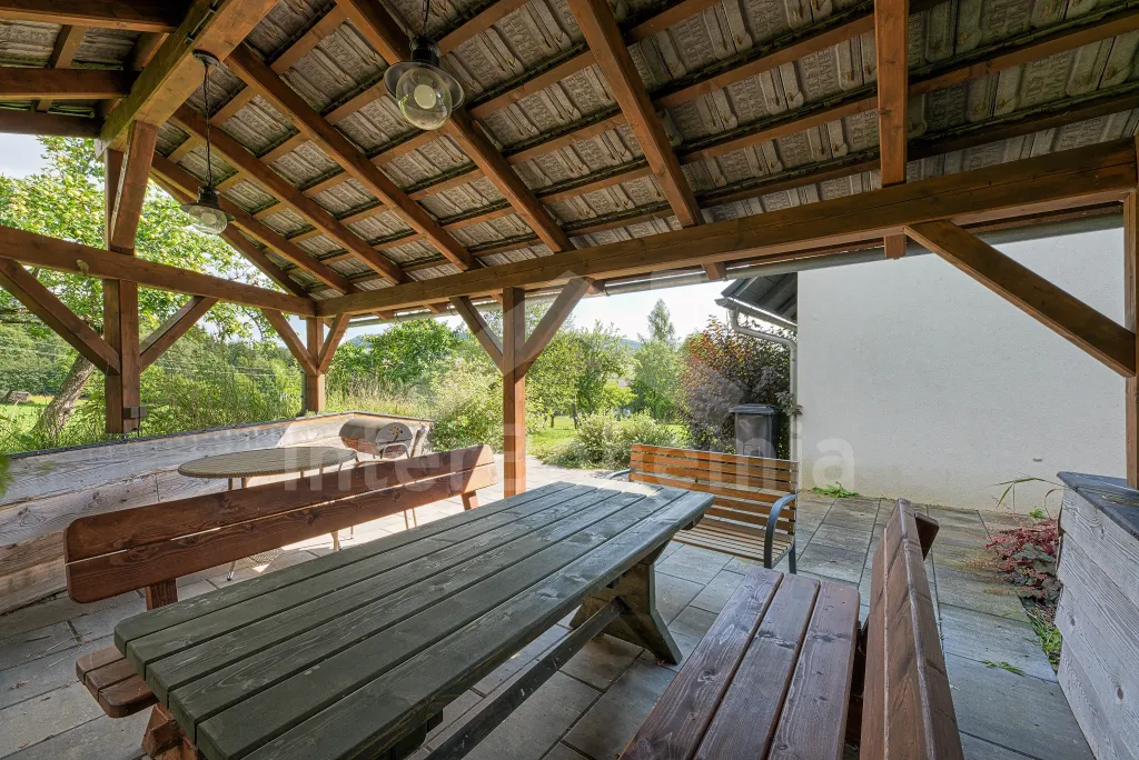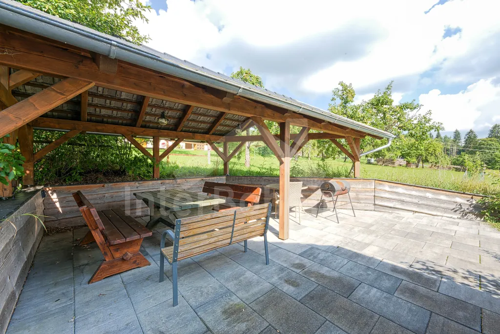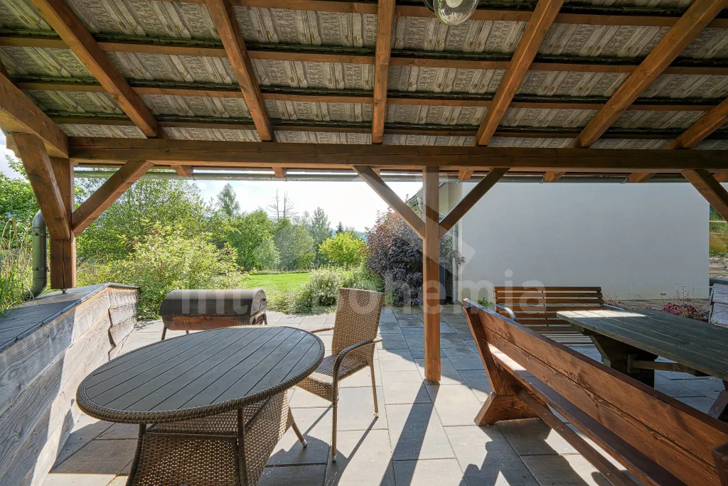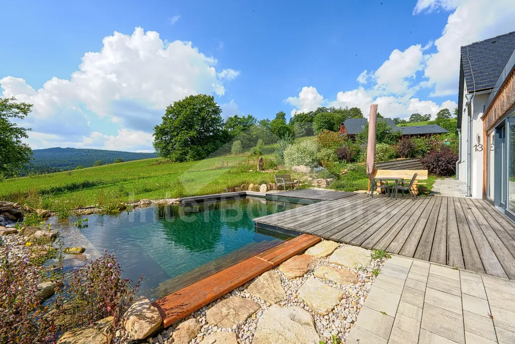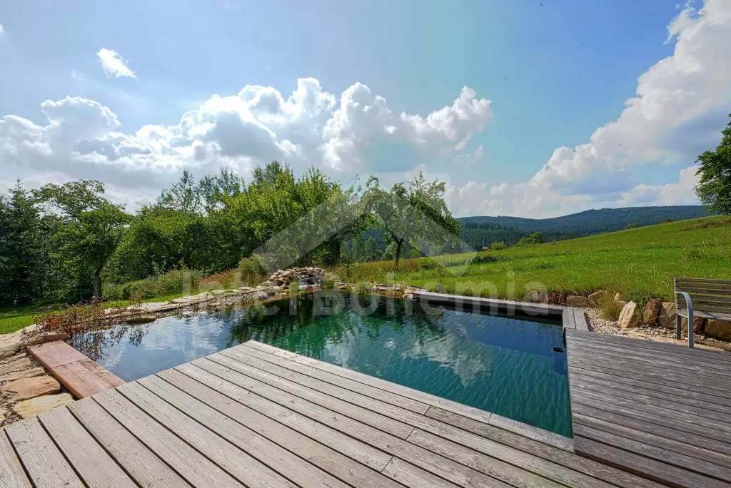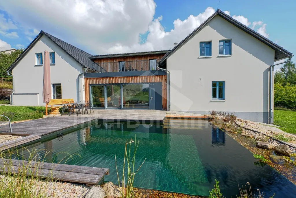 Nový a moderně vybavený dům, s průzračným koupacím jezírkem a terasou s výhledem do přírody. Pohodová společenská místnost s plnohodnotnou a kompletně vybavenou kuchyňskou linkou s lednicí a velkým jídelním stolem. Designová pohovka a velká LED TV. Ze společenské místnosti vstup přímo na slunečnou terasu s posezením a výhledem do luk a lesů. Ubytování ve třech apartmánových pokojích s vlastními vchody. První pokoj s dvoulůžkem a jednolůžkem. Druhý pokoj s dvoulůžkem a plnohodnotnou přistýlkou. Třetí s dvoulůžkem. K dispozici dětská postýlka. Koupelna se sprchovým koutem, umyvadlem a WC. Na zahradě koupací jezírko, venkovní pergola s grilem a posezením, ohniště a trampolína. K dispozici sauna za příplatek, kolárna (lyžárna) s druhým WC. Parkování přímo u objektu.