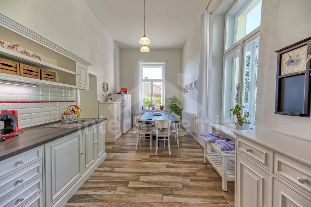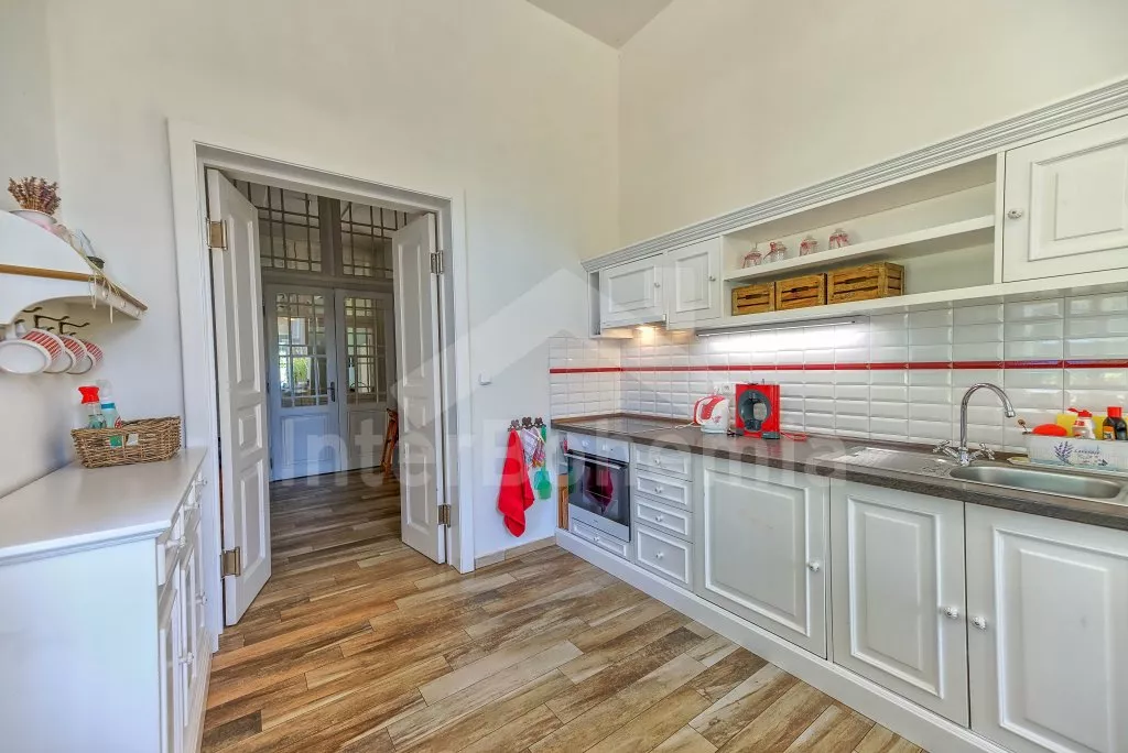 Vrijstaande villa, voormalige dorpsschool, in 2016 zeer smaakvol verbouwd, mooi en comfortabel ingericht. De villa bestaat uit separate wooneenheden, waardoor zeer geschikt voor samenreizende gezinnen. Er zijn twee vleugels in het huis, iedere vleugel met twee woon/slaap kamers en één keuken. Alle vier kamers zijn zeer ruim, ca 25 m2. Alle kamers beschikken over een eigen gang, badkamer met douche , wastafel en toilet, tweepersoons bed, tafel met stoelen, zitbank en ladder naar gezellige slaapplaatsen boven (matrassen op de grond), TV. Ideaal voor ouders met twee kinderen. In drie van de kamers is de zitbank tevens te gebruiken als tweepersoons bed. Per twee kamers is er tevens een compleet uitgeruste keuken met o.a. elektrisch fornuis met keramische kookplaat, koelkast, koffiezetapparaat, magnetron, waterkoker en wasmachine. In de grote keuken bovendien een vaatwasser, een eettafel met 8 stoelen en kleine vriezer. Verder is er één kinderkamer met matras, tafeltje met stoeltjes en wat speelgoed. Centrale verwarming via ecologische kolenketel. De tuin is omheind, u beschikt over tuinmeubelen, barbecue, kampvuurplaats, zandbak. Voldoende parkeerruimte en in de omheinde tuin zijn 3 parkeerplaatsen.