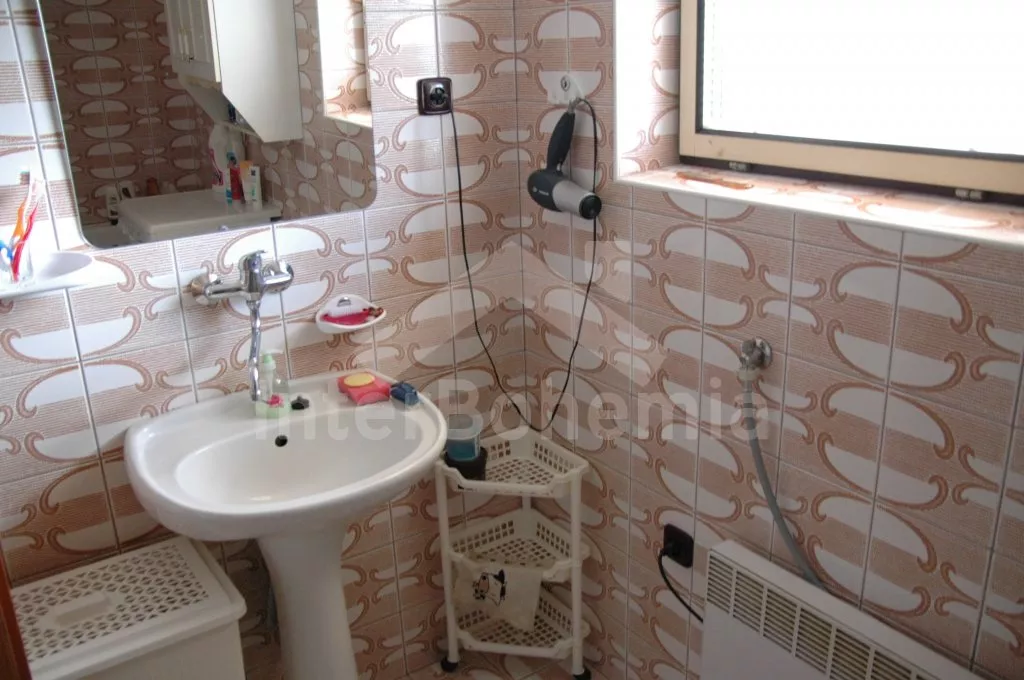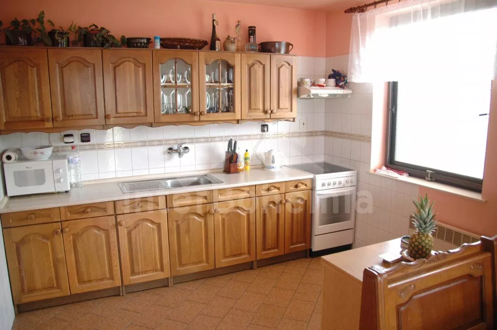 Freistehendes Haus, angenehm und bequem eingerichtet. Eingang, Halle, geraumes Wohnzimmer mit Sitzgarnitur, Sat-TV, Kaminofen, einem Einzelbett und Zutritt zu sonniger Terrasse. Offene Küche mit Essecke, Elektroherd mit keramischer Kochplatte und Ofenrohr, Kühlschrank, Kaffeemaschine, Schnellkochkanne und Mikrowelle. Badezimmer mit Badewanne, separate Toilette. Schlafzimmer mit einem Doppelbett. In Oberstock befindet sich kleine Halle, Wohn-/Schlafzimmer mit Sitzgarnitur, TV und einem Einzelbett. Zweite Küche mit Elektroherd, Kühlschrank, Kaffeemaschine, Schnellkochkanne und Mikrowelle. Zweites Badezimmer mit Badewanne und Toilette. Weitere zwei Schlafzimmer – jedes mit einem Doppelbett und einem Einzelbett. Elektrische Heizung. Garten ist umzäunt, zur Verfügung steht Gartenmöbel, Sonnenschirm, Bassin mit Durchmesser 4,6 m, übertragbarer Grill, Feuerstelle und Sandkasten. Parken vor dem Haus.